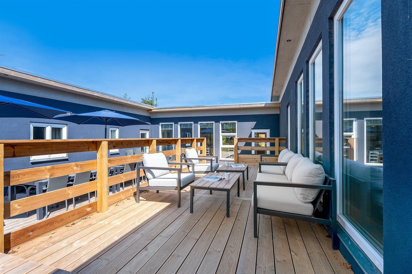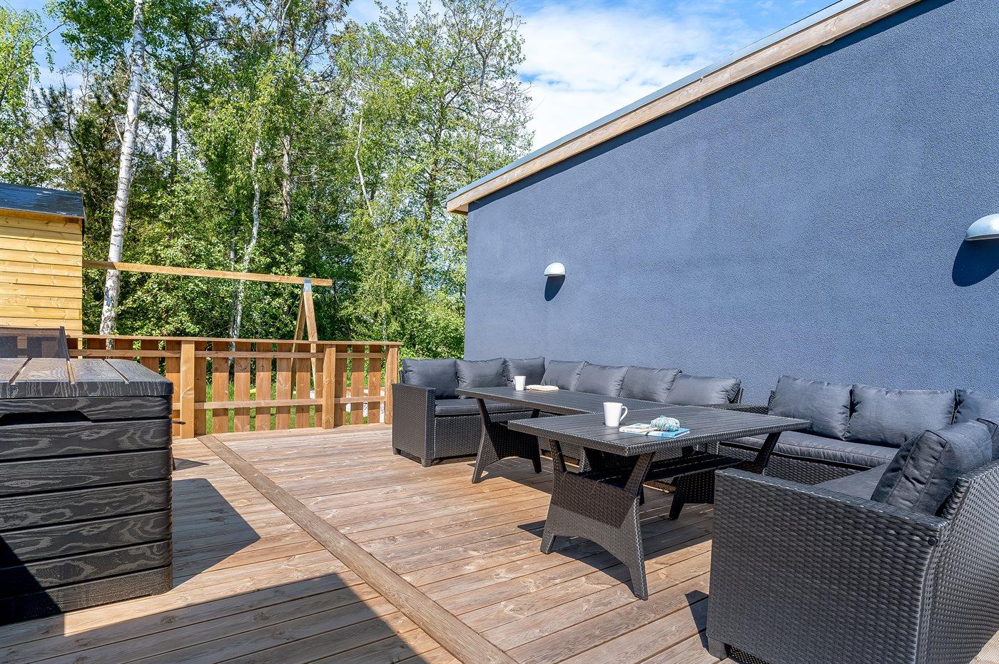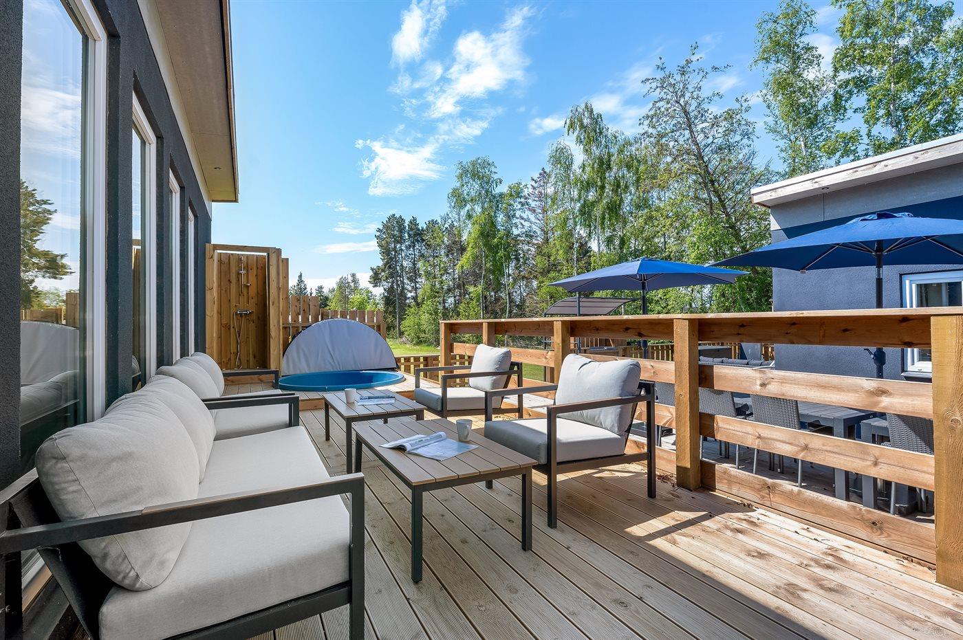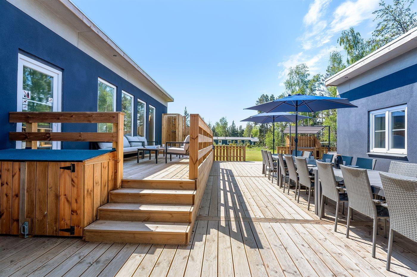 Udendørs. Der en 140 m2 stor træterrasse, der forbinder huset, poolhuset og haven. På terrassen er der et langt bord til 22 personer, der er loungemøbler, et nedbygget vildmarkskar som bliver fyldt med vand inde fra poolen, herefter starter en varmepumpe og varmer vandet op til 38 grader. Endvidere findes der en stor, dejlig grill på terrassen. Bag ved huset finder man en 9-huls minigolfbane. Der er desuden en stor, dejlig græsplæne med mulighed for forskellige boldspil, og et legeområde for mindre børn.