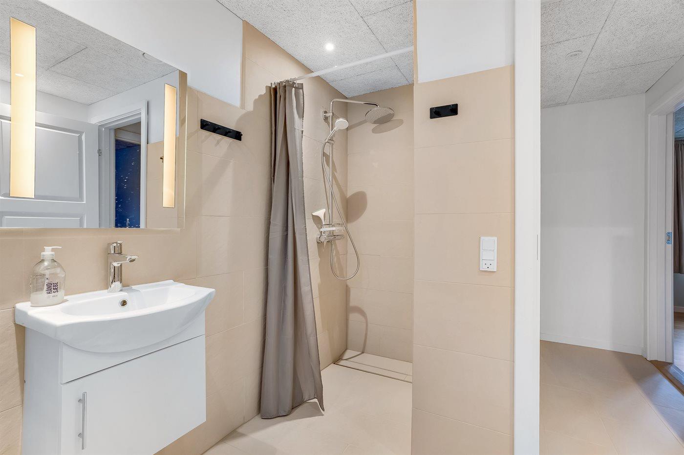 Badeværelser: Der er i alt 4 badeværelser i huset, 3 i beboelsen og et i poolhuset. I sommerhalvåret er der desuden en udebruser på terrassen. I det ene badeværelse i huset er der vaskemaskine og tørretumbler.