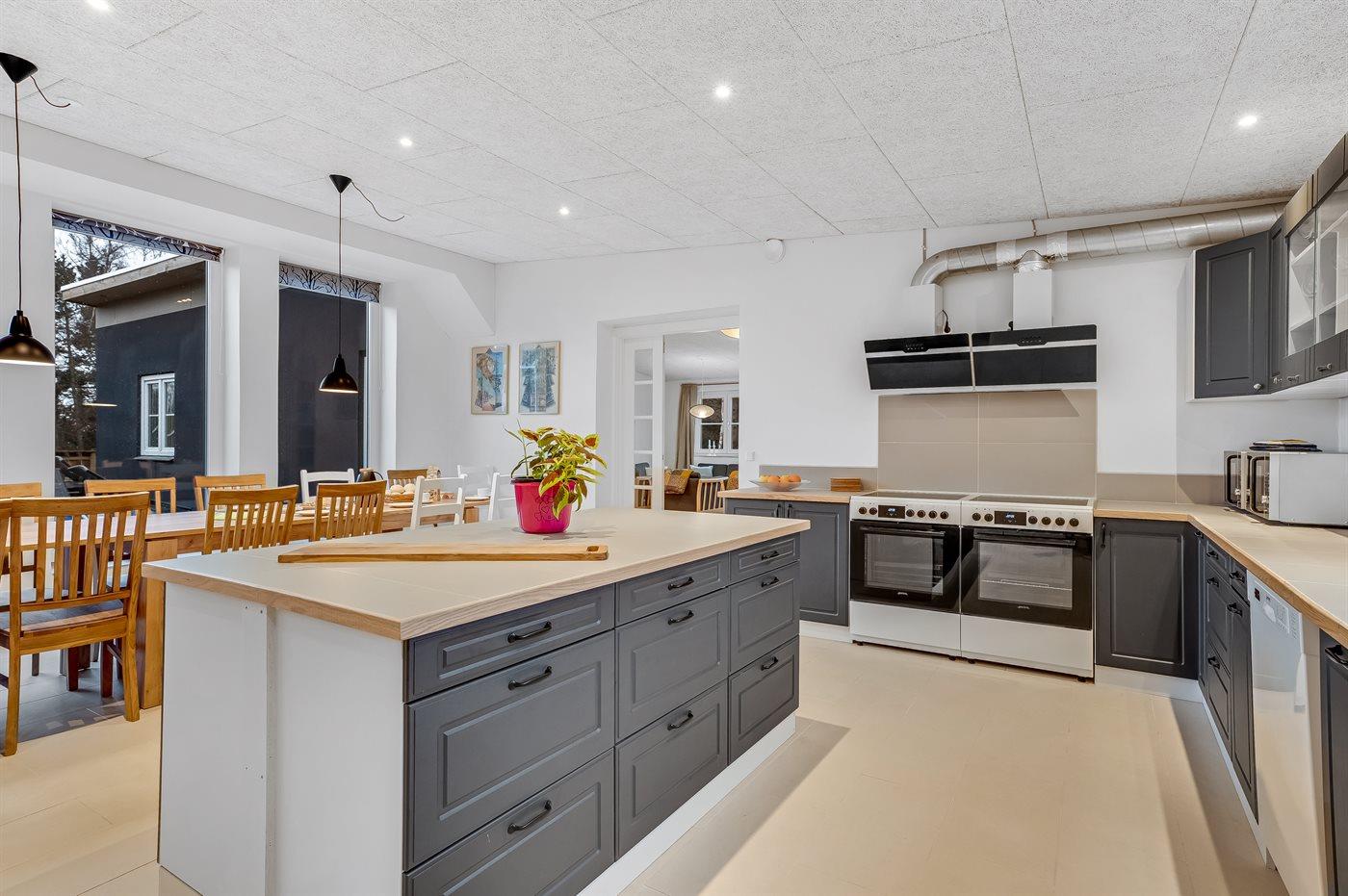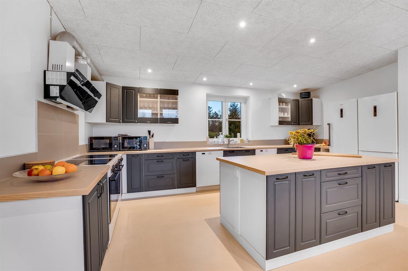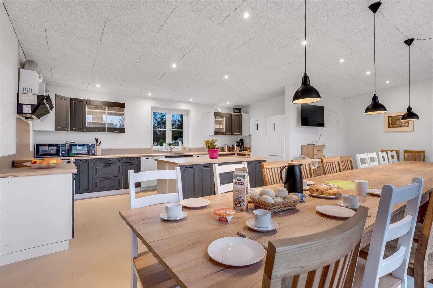 Køkkenet, som er separeret fra stuen, er veludstyret med 2 elkomfurer med hver sin ovn og 4 kogeplader, der er 2 køleskabe, hvoraf det ene også har fryser, 2 opvaskemaskiner, 2 mikrobølgeovne, 2 Mokkamaster kaffemaskiner og meget mere. Der findes et langt bord med plads til 22 personer, der står også 2 barnestole, og der er opsat et 43” TV.