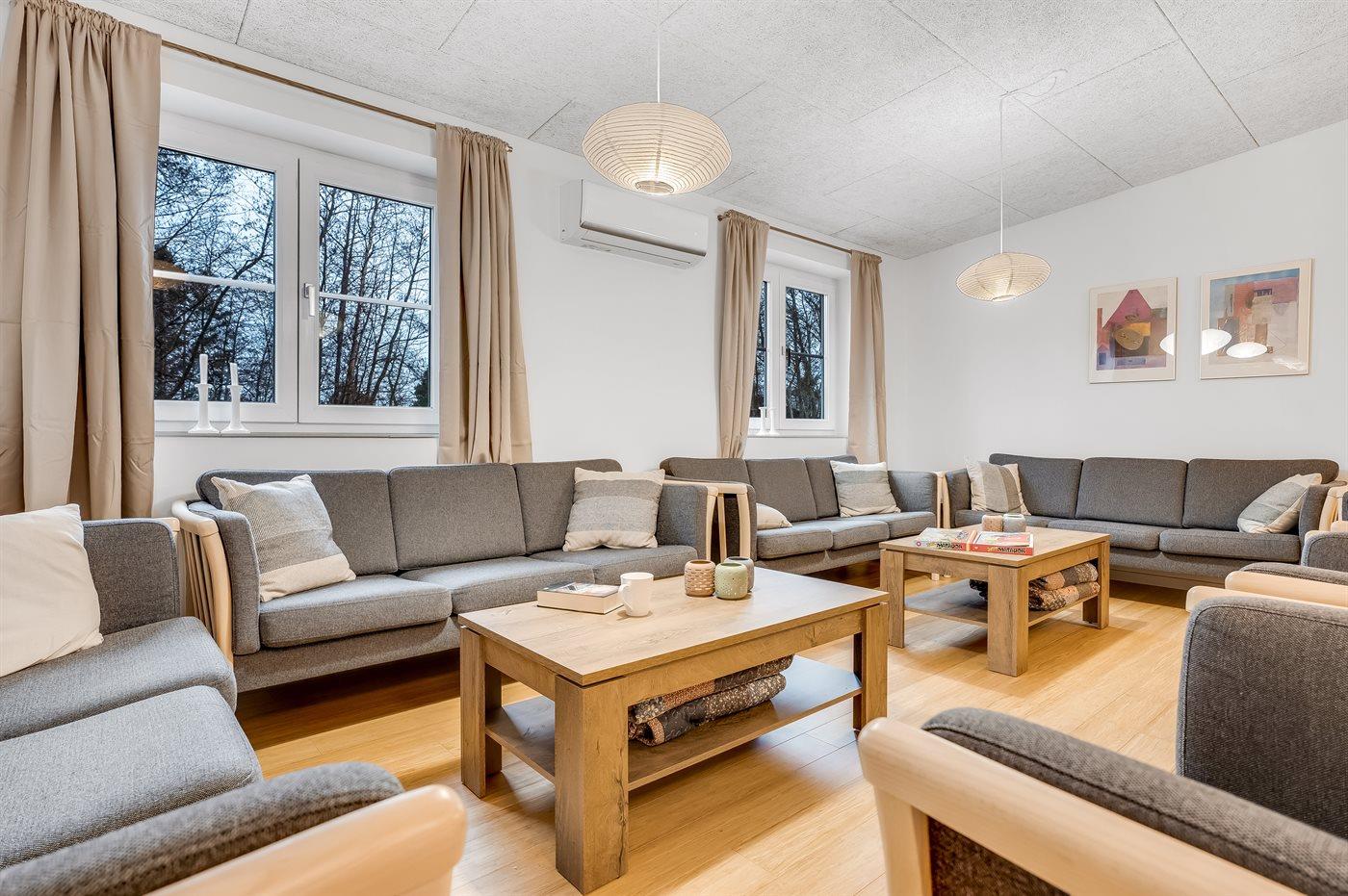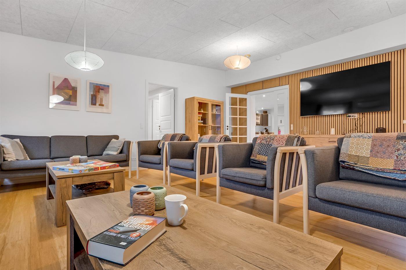 Dagligstue: I huset er der en stor dagligstue med 16 siddepladser til voksne, et 75” TV med mange kanaler bl.a. DR1, TV2, en del tyske kanaler samt over 50 Samsung TV-kanaler. Der findes forskellige spil i skabet i stuen og lidt bøger.