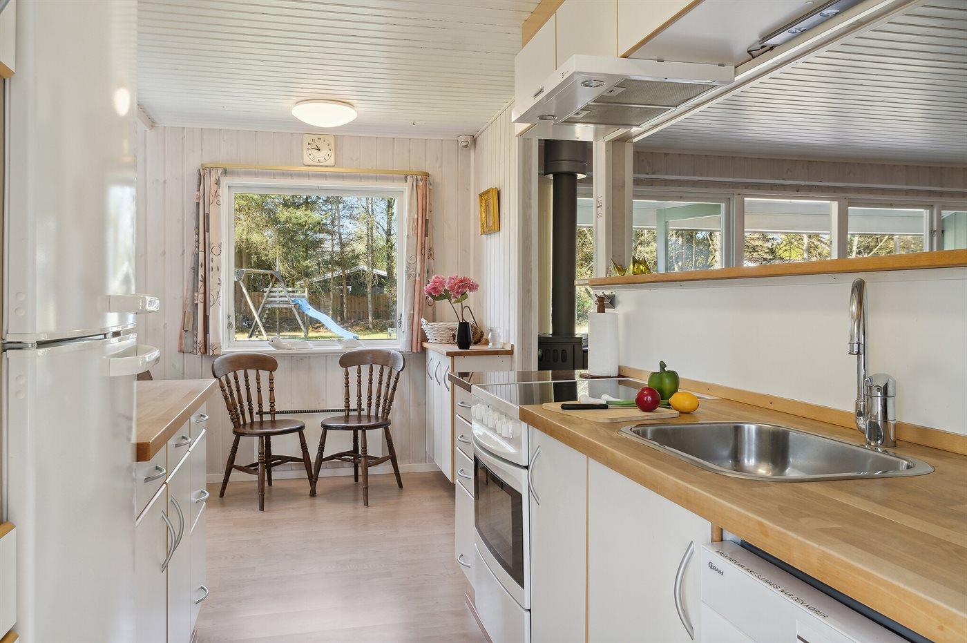 Køkkenet er udstyret med 1 køleskab. Der er 4 keramiske kogeplader, varmluftovn, mikrobølgeovn, Airfryer samt opvaskemaskine.