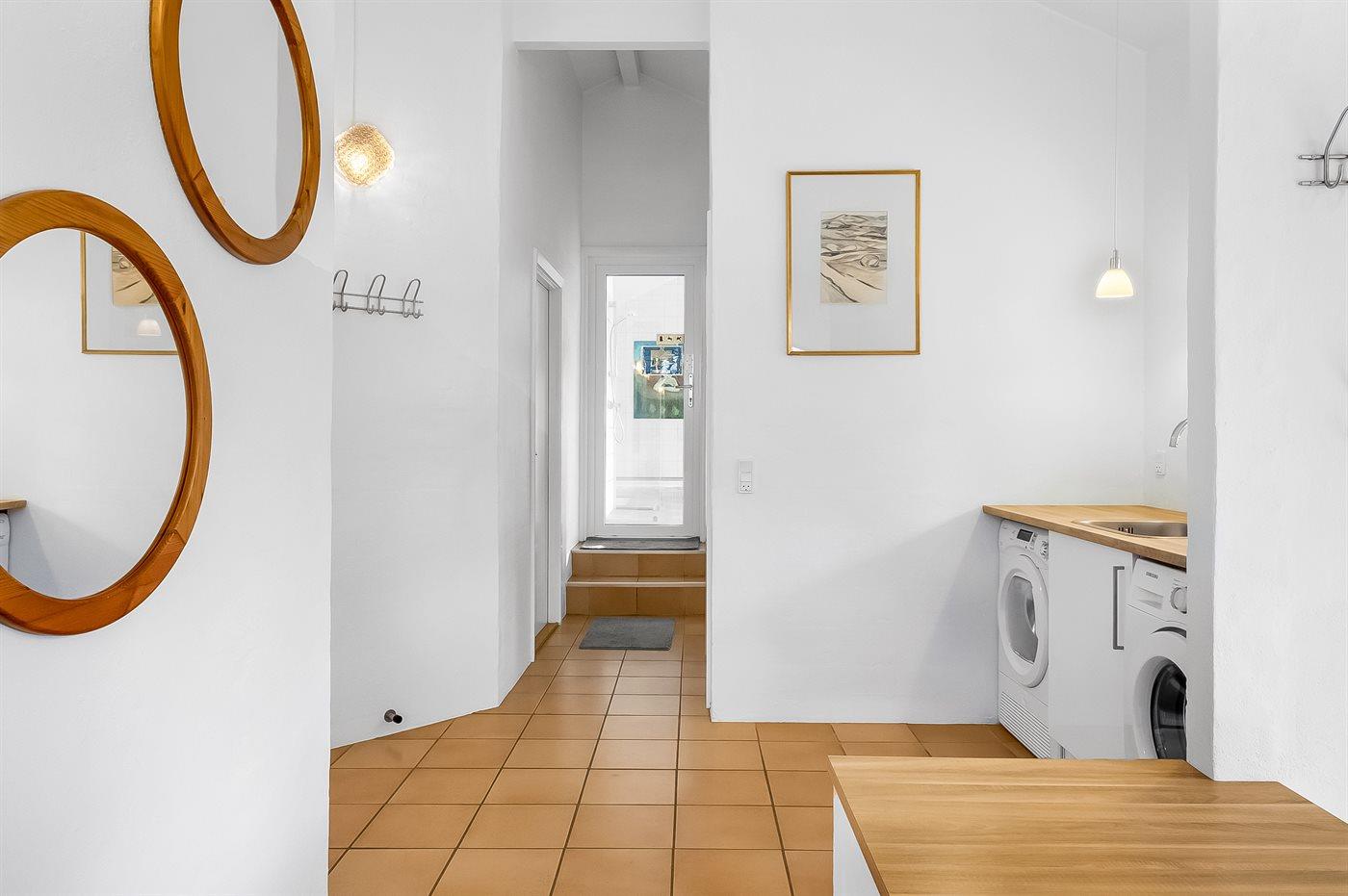 Der er 2 badeværelser med bruseniche og 2 toiletter. Der er gulvvarme på 2 badeværelser. I saunaen er der mulighed for afslapning.