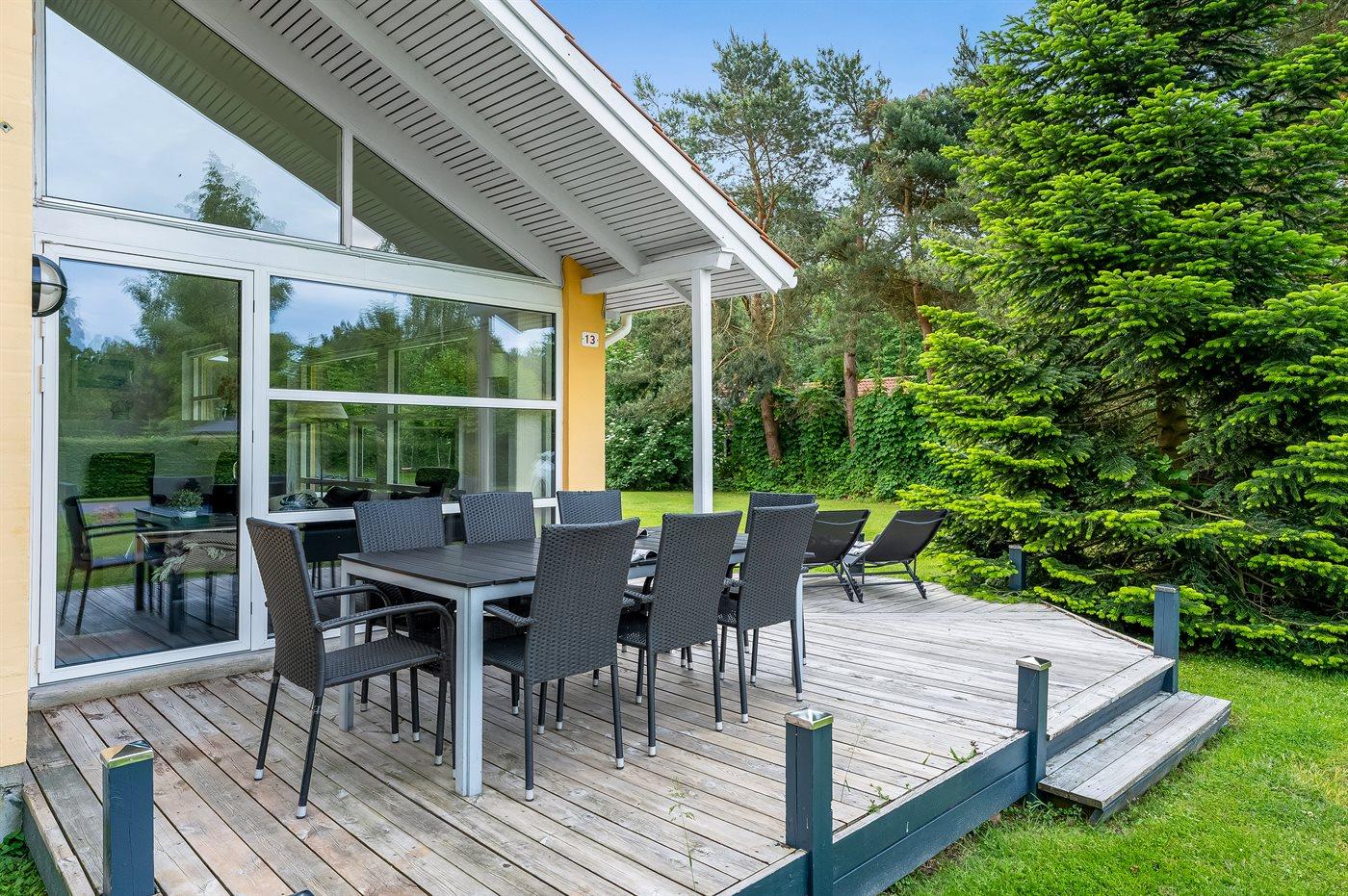 Ferieboligen er beliggende på en 1267 m² stor naturgrund. Der er 600 m til havet. Nærmeste forretning er beliggende i en afstand af 400 m. Der er en golfbane i en afstand af 2000 m. Til ferieboligen hører åbent terrasseareal. Desuden er der overdækket terrasse. Der er redskabsrum. Gynge. Sandkasse. Trampolin. Der findes desuden indendørs og udendørs spil samt trækvogn. Der ligger en legeplads i en afstand af 350 m. Grill til rådighed. Parkering ved ferieboligen.