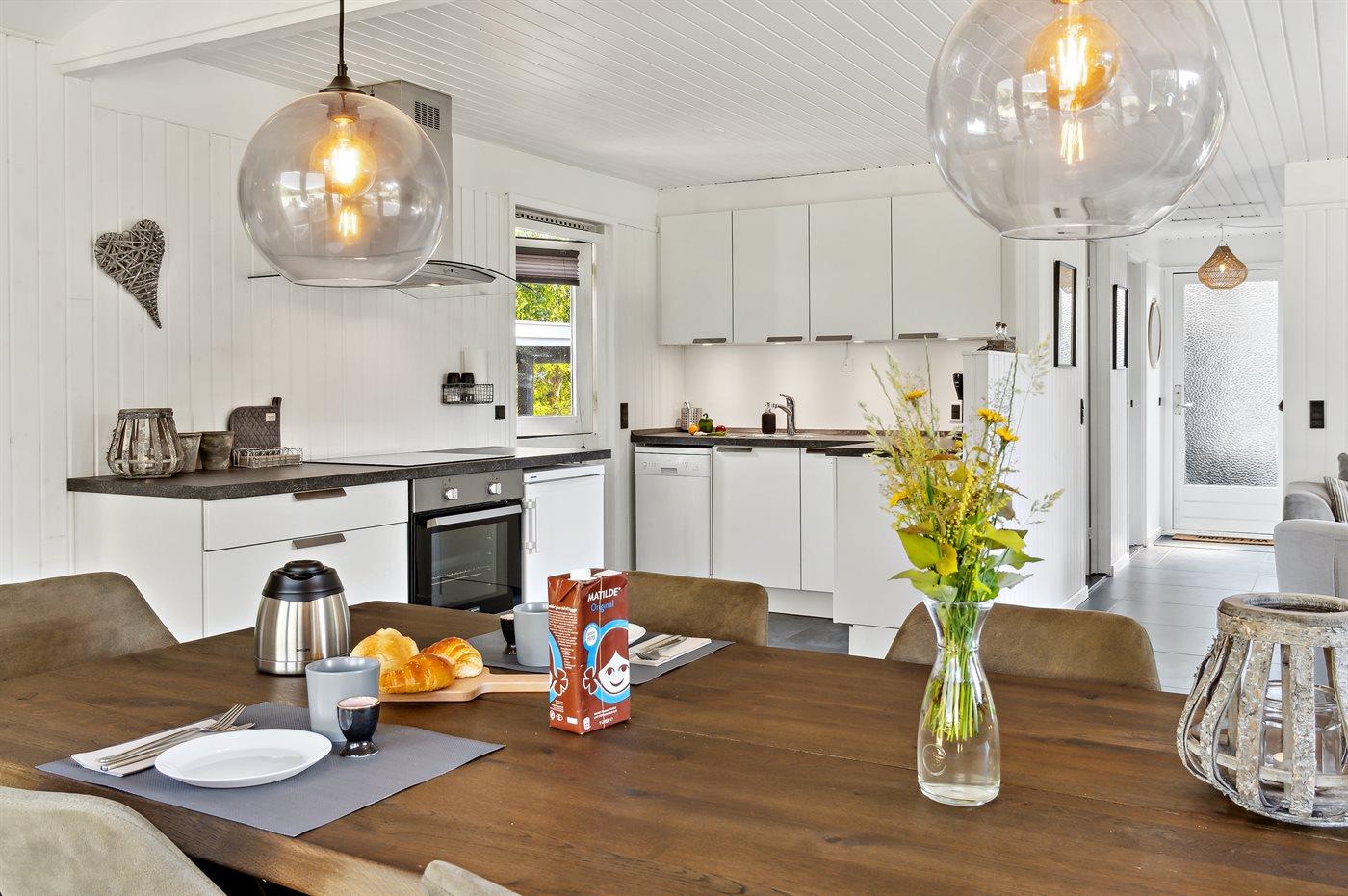 Køkkenet er udstyret med 1 køleskab. Der er 4 induktionskogeplader, varmluftovn, mikrobølgeovn samt opvaskemaskine.