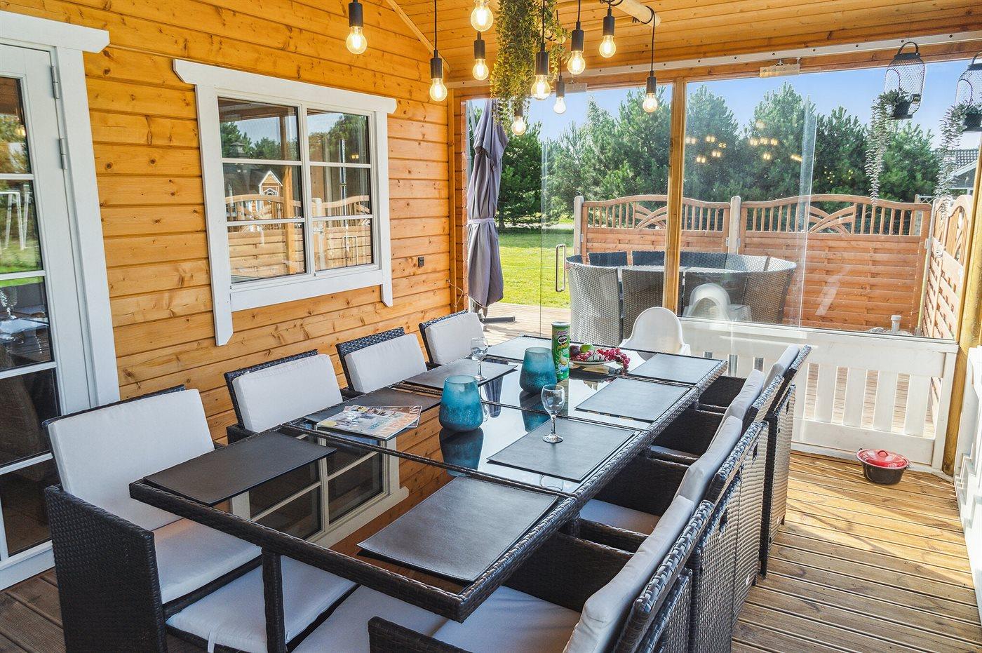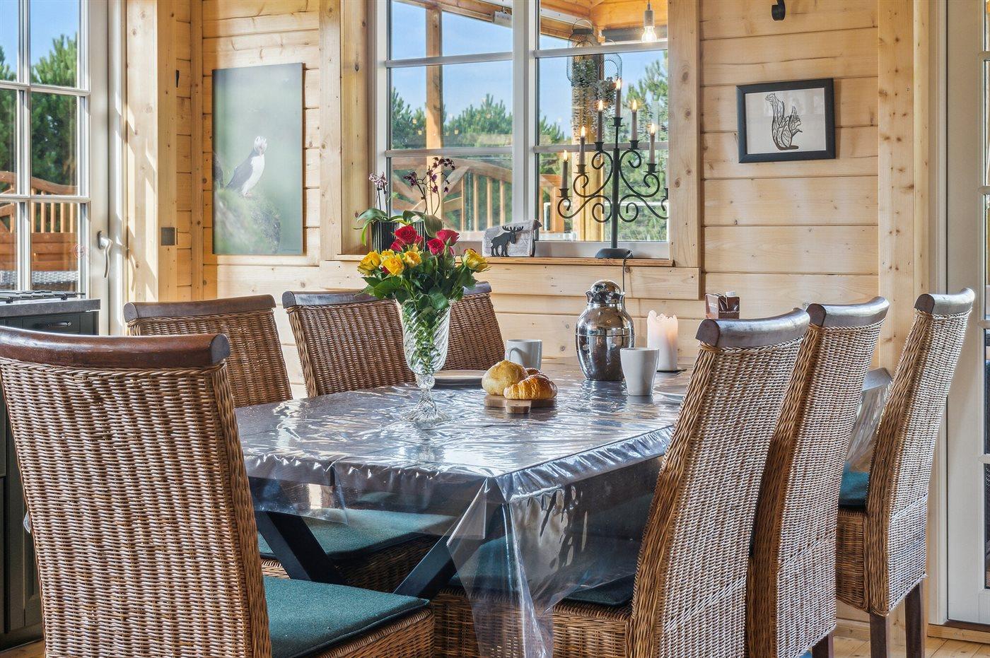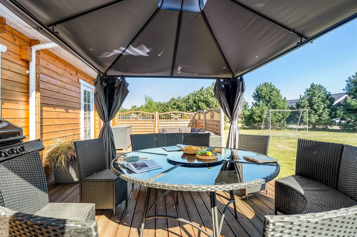 Velkommen til et sommerhus der på rigtig mange områder skiller sig positivt ud fra mængden. Huset er indrettet, så der er mange hyggeområder både for små og store samtidig med, at man fornemmer samværet med de øvrige, der er med på ferie. Er man til udeliv, byder dette hus på virkelig fine løsninger for fællesskab og hygge. Det være sig lige fra den store udendørs grill med hængesofaer rundt om, udendørs spa, shelteren, legepladsen, til det dejlige grill-hus.