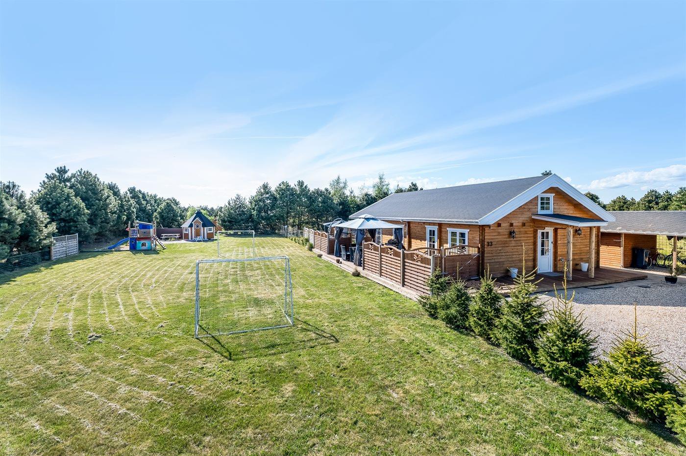 Ferieboligen er beliggende på en 1700 m² stor naturgrund. Grunden er indhegnet. Der er 1450 m til havet. Nærmeste forretning er beliggende i en afstand af 1100 m. Der er en golfbane i en afstand af 2000 m. Til ferieboligen hører åbent terrasseareal. Gynge. Sandkasse. Legehus. Legetårn. Vippe. Fodboldmål. Shelter. På lune aftener sørger en udendørs pejs for hyggelig stemning. Grill til rådighed. Der er installeret stik til opladning af elbil. Med 11 kW ladeeffekt. Parkering ved ferieboligen.