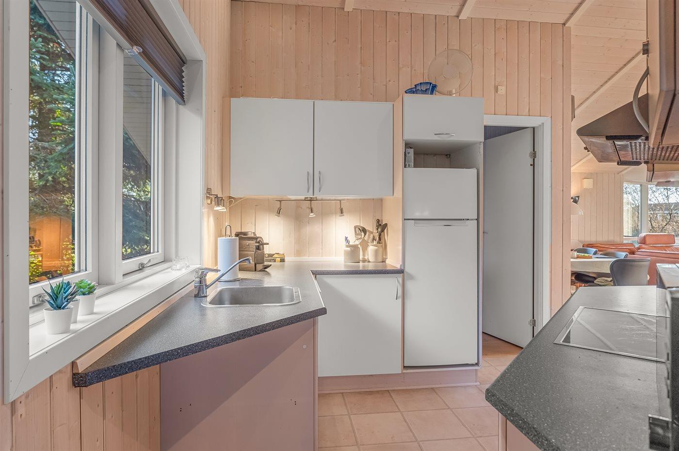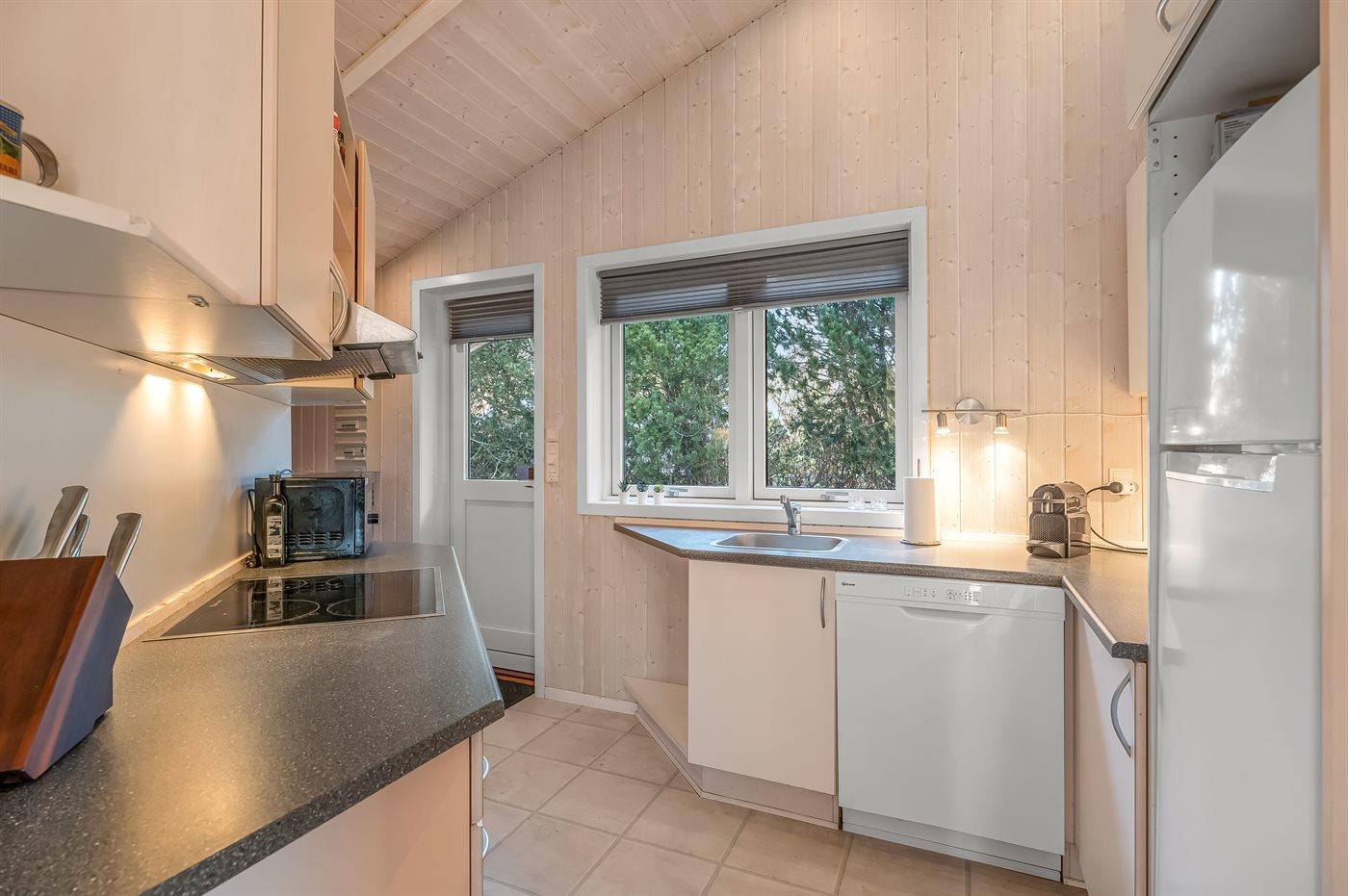 Køkkenet er udstyret med 1 køleskab. Der er 4 keramiske kogeplader, varmluftovn samt opvaskemaskine.