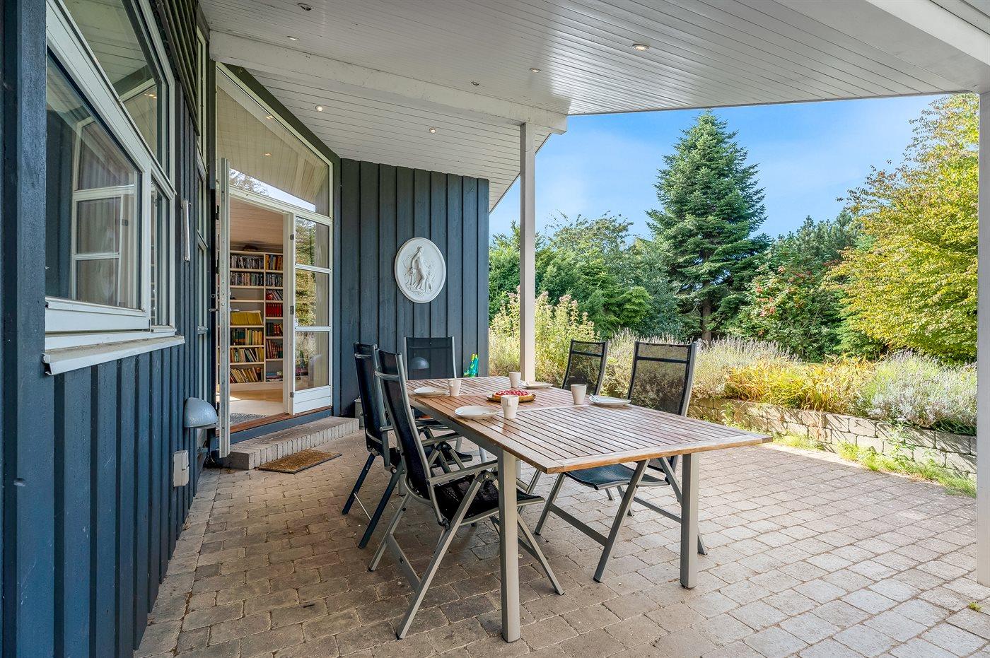 Huset er omgivet af flere skønne terrasser, både åbne og overdækkede, der inviterer til solbadning, afslapning og grillhygge på lange sommeraftener. Blot få hundrede meter fra huset finder du Bøtøskoven, hvor du kan være heldig at opleve de vilde heste, som lever frit i naturen.