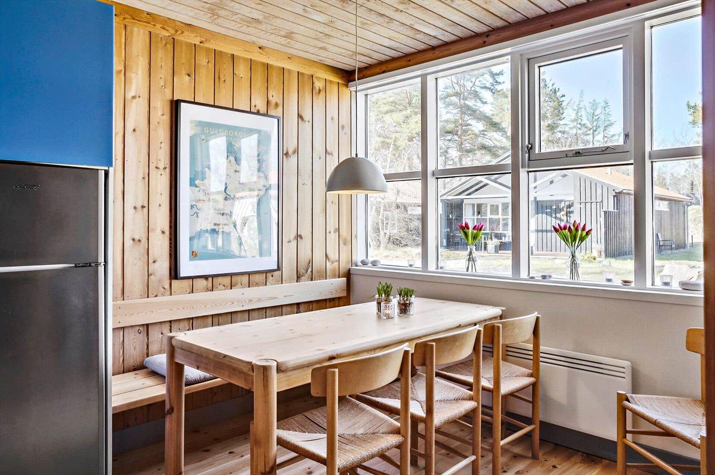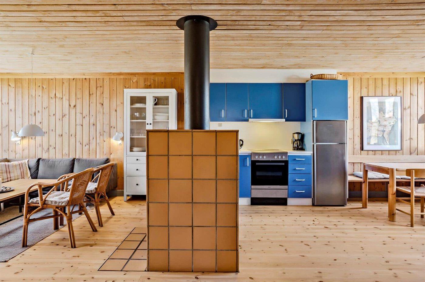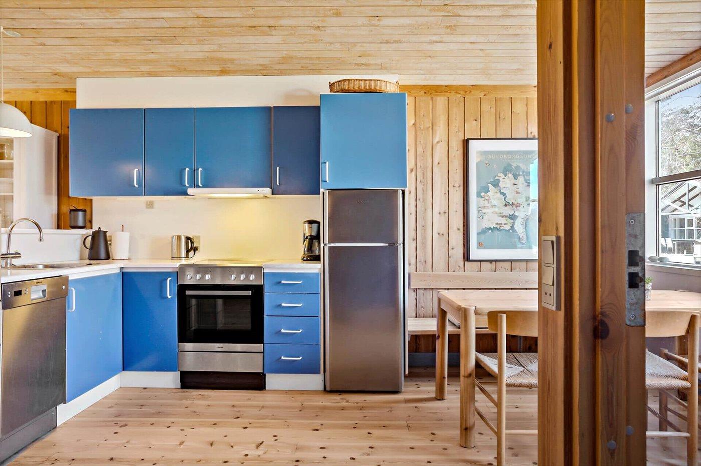 Køkkenet er udstyret med 1 køleskab. Der er 4 keramiske kogeplader, varmluftovn samt opvaskemaskine.