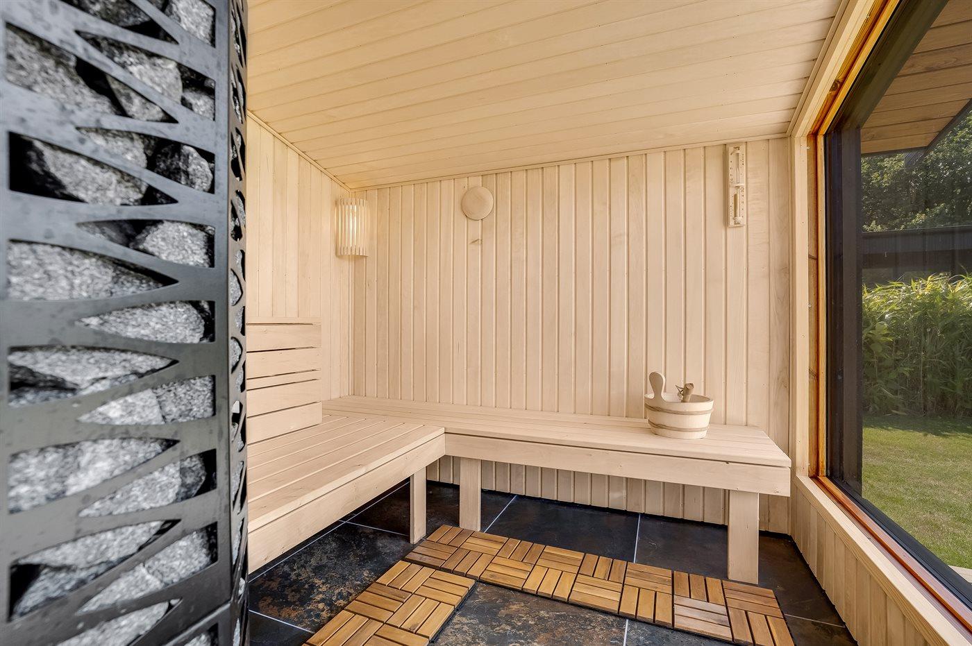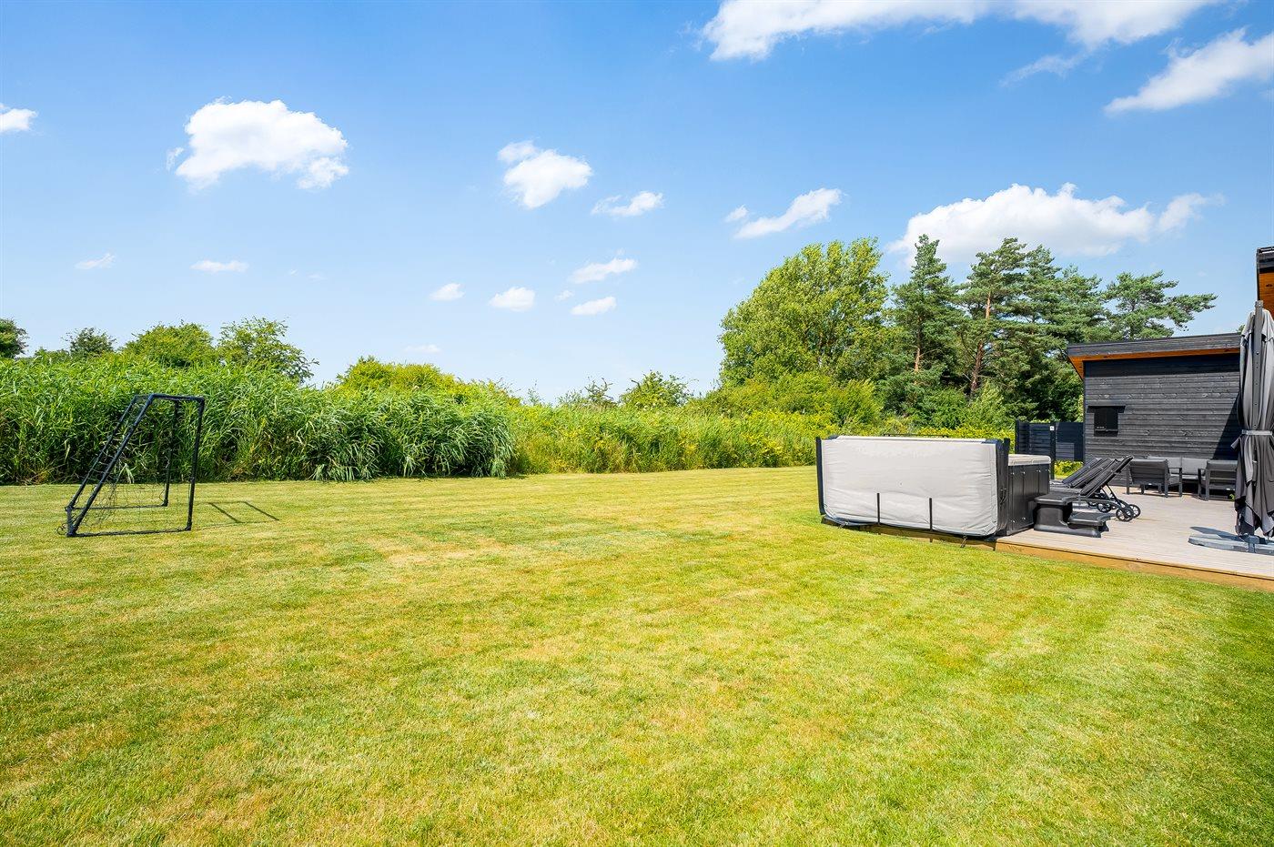 Slap af i det store udendørs spabad til seks personer, og nyd den direkte adgang til den varme sauna med udsigt til haven. Udendørs bruser med koldt og varmt vand. Forkæl dig selv med lækre grillaftener på gasgrillen, mens solen går ned over landskabet, eller tag en fodboldkamp i den skønne have med fodboldmål. Der er også en ladestander til elbil.
