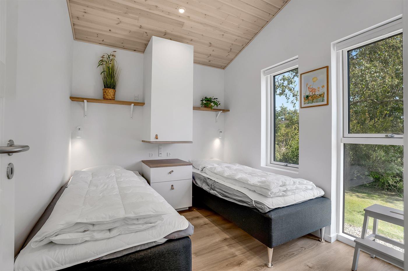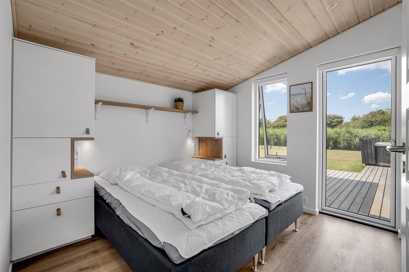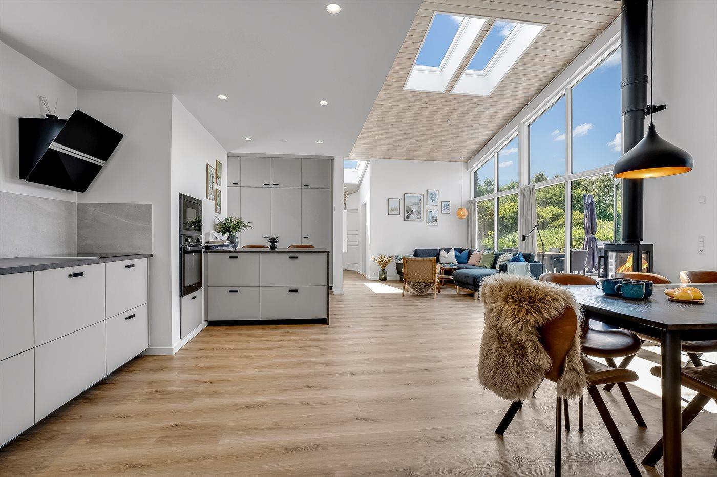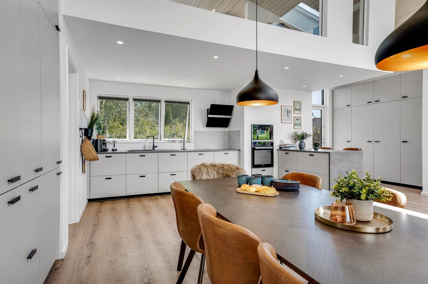 Det veludstyrede køkken rummer alt, hvad du behøver: opvaskemaskine, separat køle- og fryseskab, induktionskogeplade, ovn, mikroovn og Nespresso kaffemaskine. Her er plads til at skabe gode minder over måltiderne - både indendørs og på de to solrige træterrasser. Med fire stilfulde soveværelser, herunder to med dobbeltsenge og to med enkeltsenge, er der plads til alle.