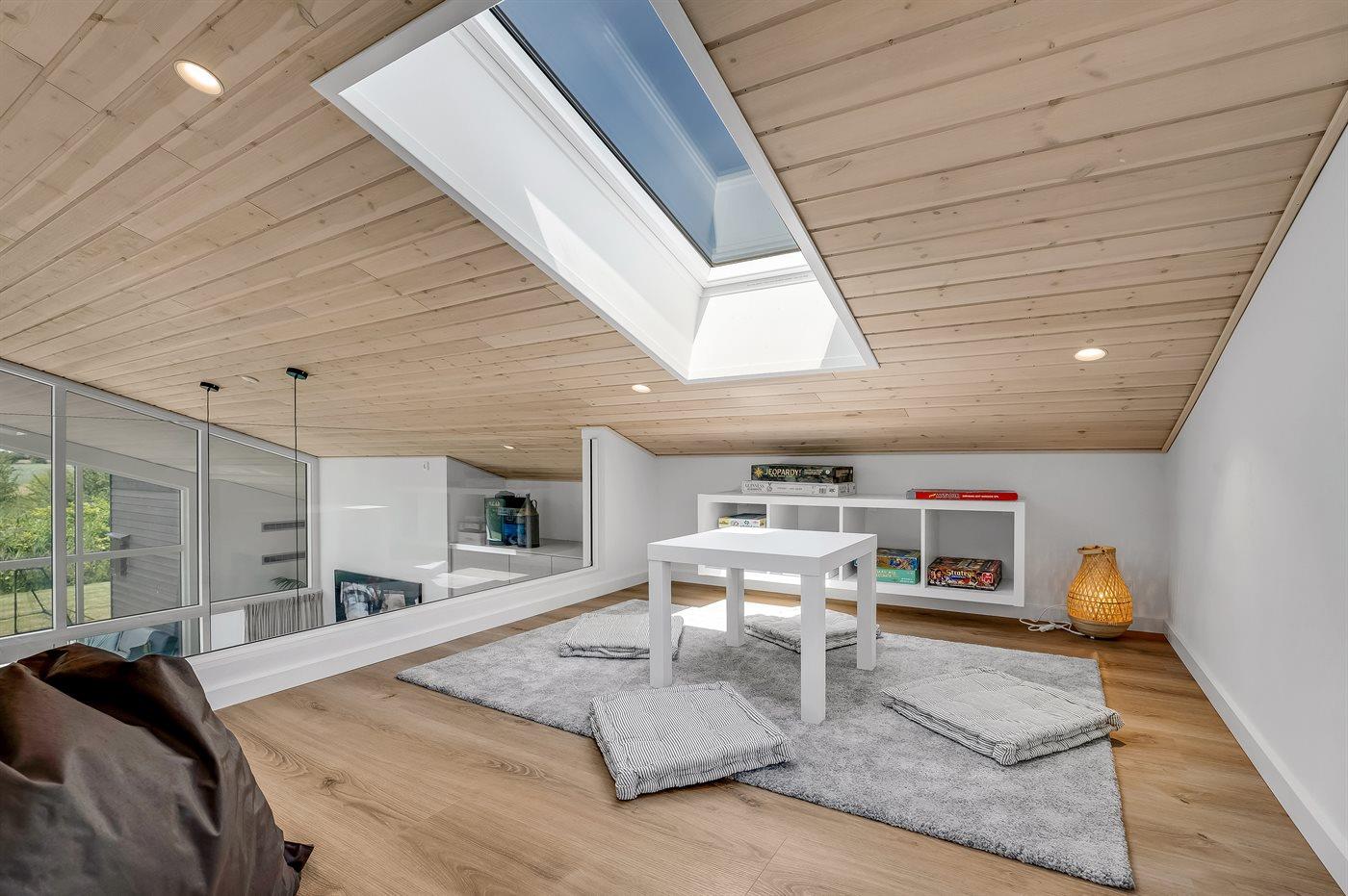 De to badeværelser, der også inkluderer et praktisk rum med vaskemaskine og tørretumbler, sikrer komfort og funktionalitet for hele familien. Underholdning og Afslapning: Nyd en aften i den hyggelige stue med brændeovn og stort tv med Chromecast – perfekt til filmaftener. Huset har også en aktivitet hems, hvor børn og barnlige sjæle kan hygge sig med PlayStation 4 og brætspil.