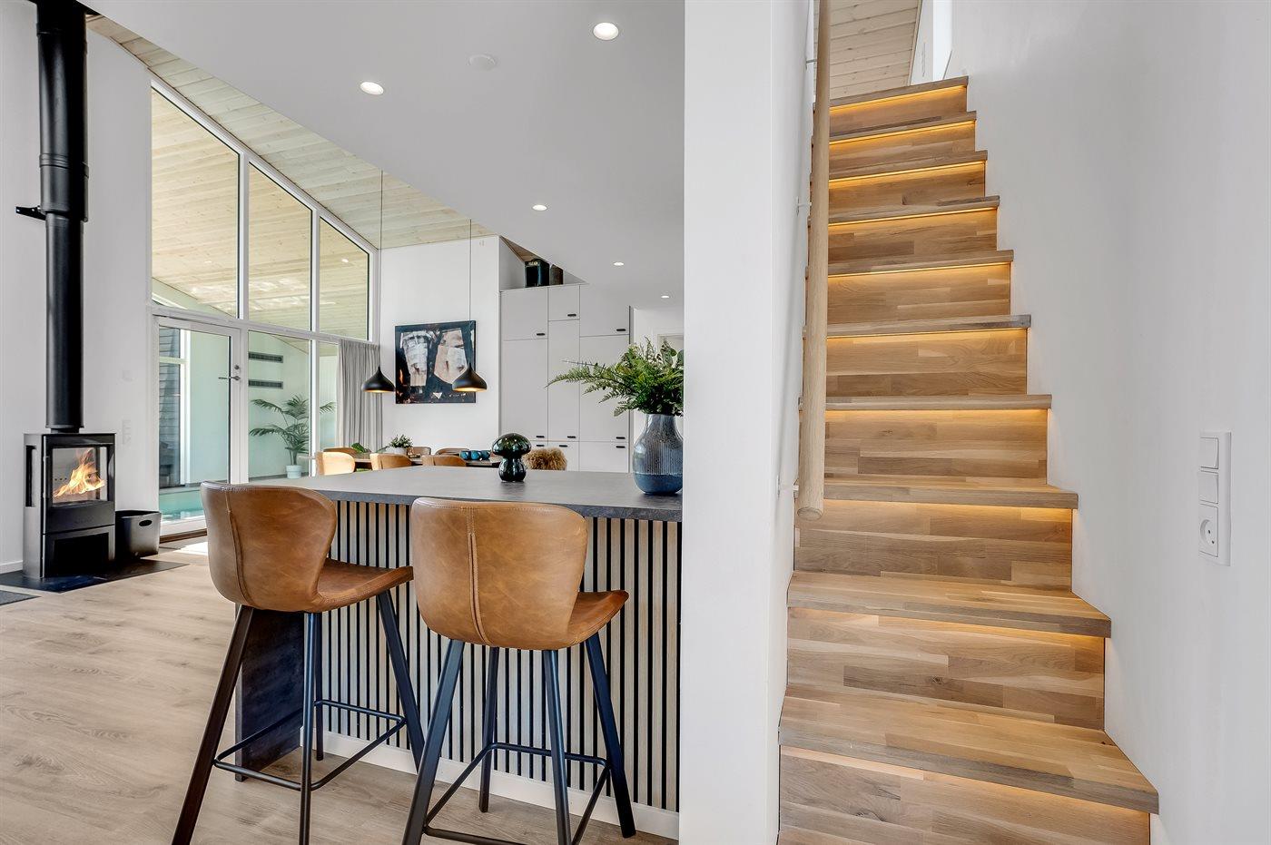 Sommerhusets hjerte er det lyse og moderne køkken/alrum med panoramavindue til den skønne terrasse samt den indbydende indendørs swimmingpool med indbygget trappenedgang og flerfarvet LED-lys inviterer til leg og skønne stunder, hvor alle kan samles.