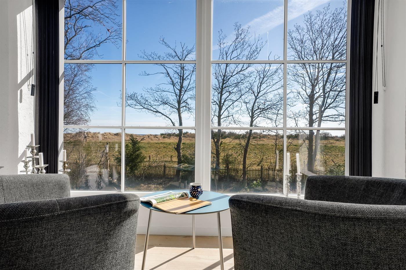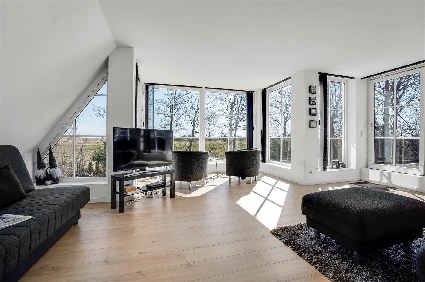 Huset er indrettet med tre soveværelser og to badeværelser. Den hyggelige spiseafdeling ligger i forbindelse med det åbne køkken. Trappen op til første sal fører jer op til den skønne lyse opholdsstue med komfortable møbler og ikke mindst udgangen til den store åbne terrasse, hvorfra I kan nyde den skønneste udsigt over diget og Østersøen.