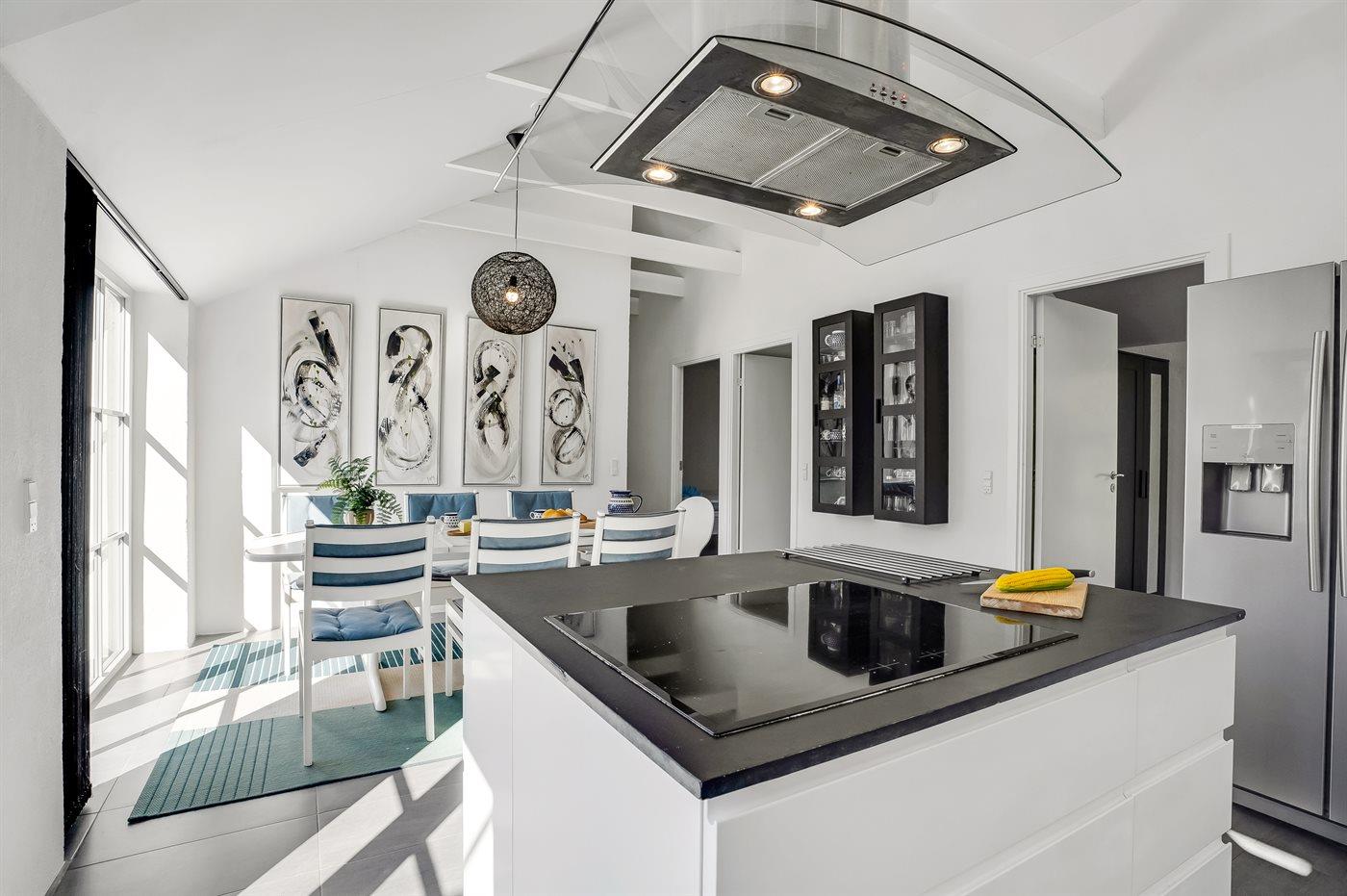 Køkkenet er udstyret med 1 køleskab. Der er 4 keramiske kogeplader, varmluftovn, mikrobølgeovn samt opvaskemaskine.