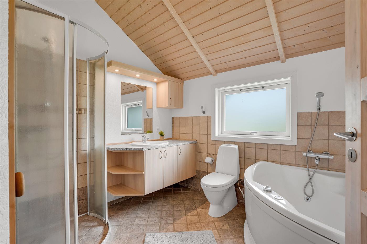 Der er 2 badeværelser med bruseniche og 2 toiletter. Der er gulvvarme på 1 badeværelse. Der er gulvvarme på gæstetoilettet. I saunaen er der mulighed for afslapning.