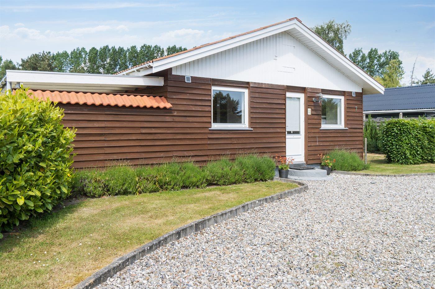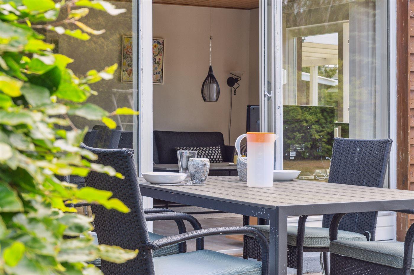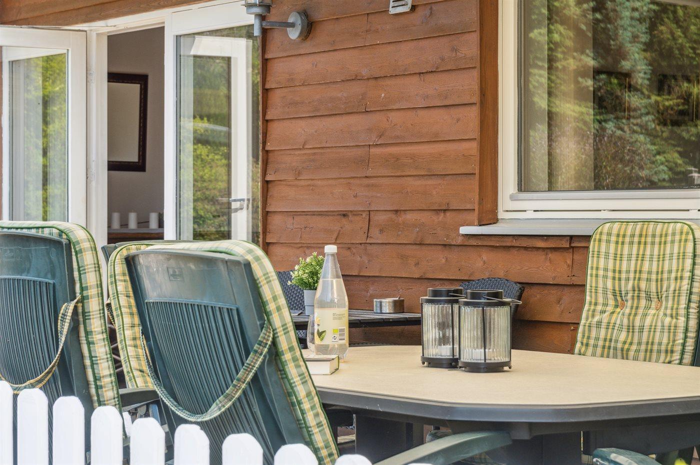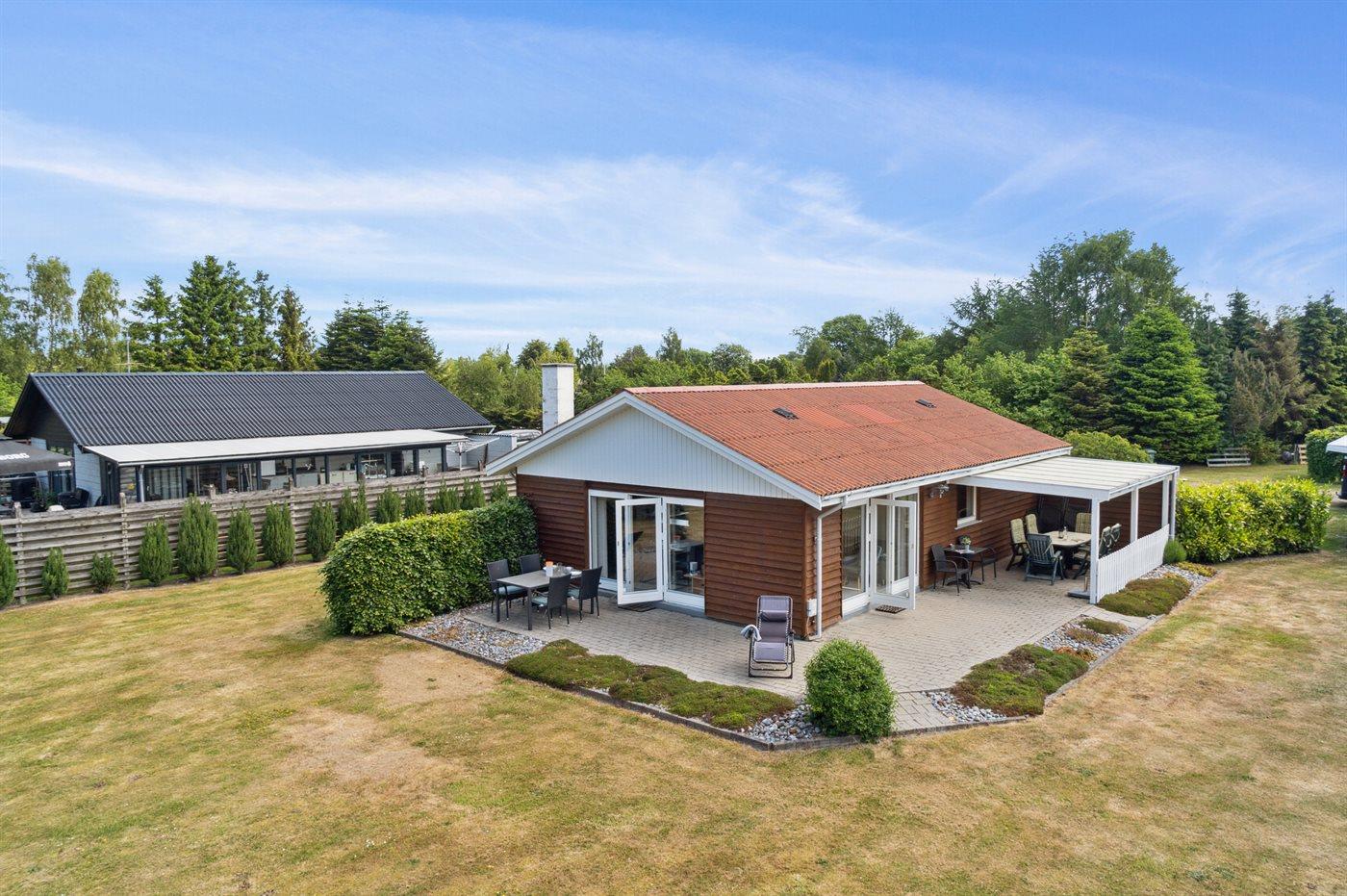 Lækkert feriehus i træ på dejlig og velplejet grund. Fra stuen er der udgang til skøn overdækket og åben terrasse. Huset er blevet moderniseret løbende.
