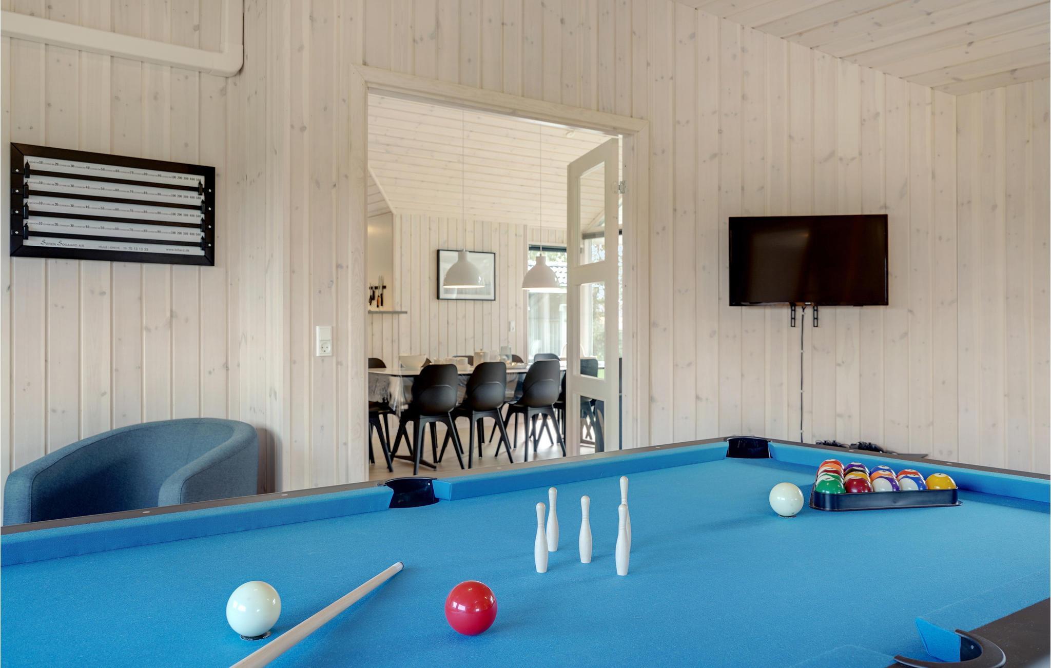 Velkommen til dette rummelige feriehus, som har plads til en stor familie eller flere familier, der er gode venner. Her føler man sig lynhurtigt hjemme. Huset får masser af lys ind gennem de store vinduesfronter og lægger op til hyggelige stunder i fællesrummene. Den klassiske stue med spiseplads og køkken giver jer mulighed for at kombinere madlavningen med hyggelige snakke, mens aktivitetsrummet er indrettet til ren afslapning med spil og konkurrencer. Hvis I trænger til at komme ned i gear efter en lang dag på farten, har I også jeres egen wellnessoase med spabad til flere personer og en sauna.