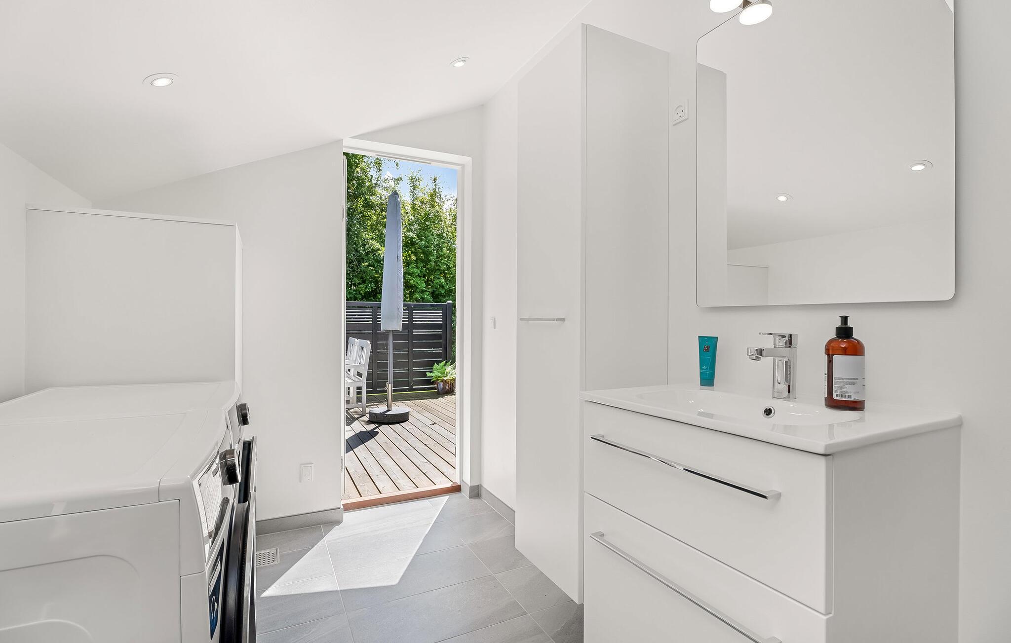 Åbn terrassedøren, og træd direkte ud i det fri. Tag solbad på træterrassen, saml jer omkring det store spisebord til en grillmiddag, eller slap af med en bog under parasollen. Den store have er omgivet af høje træer og byder både på ro, privatliv og masser af plads til leg og aktivitet.