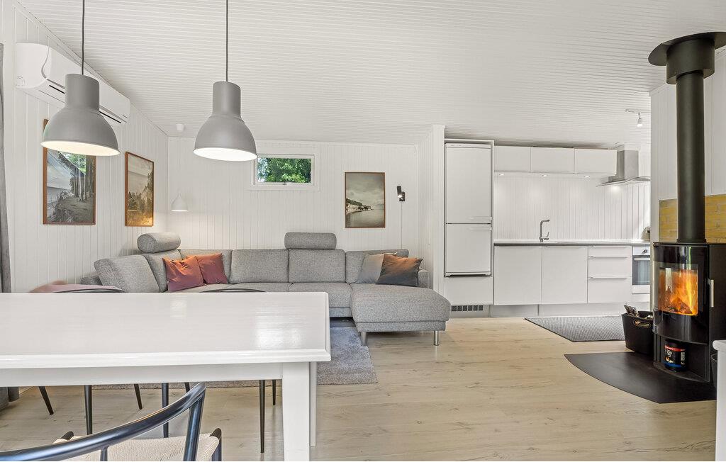 Jeres velholdte hus i Marielyst giver jer ideelle rammer for et afslappet ophold med familien. Den åbne opholdsstue byder jer velkommen med en venlig indretning, store vinduespartier og direkte adgang til terrassen. Tag plads i den hyggelige sofa, nyd udsigten til det grønne, eller spis jeres måltider ved spisebordet med udsigt til haven. I det praktiske køkken tilbereder I jeres livretter, mens brændeovnen i baggrunden sørger for en behagelig varme.
