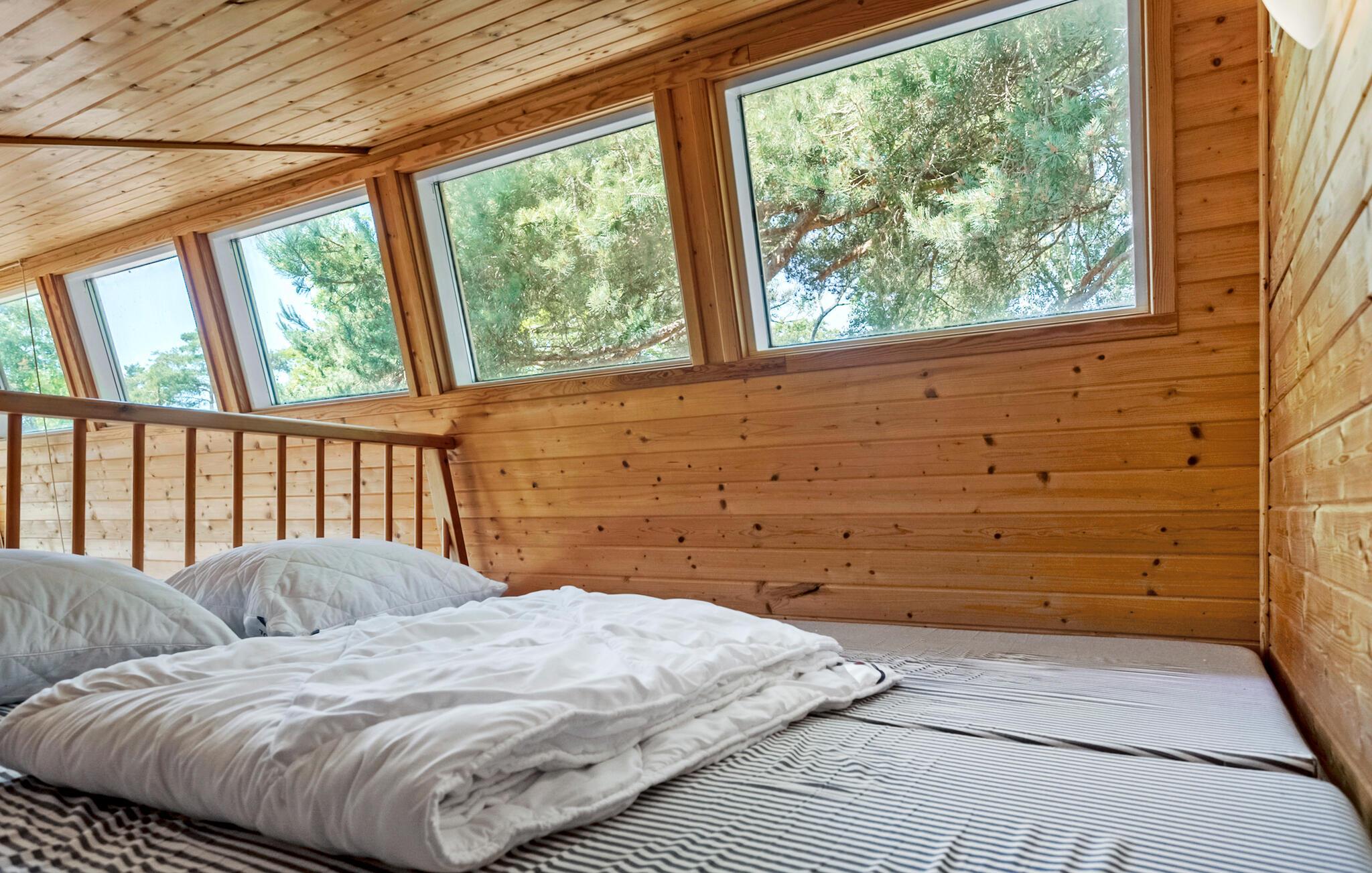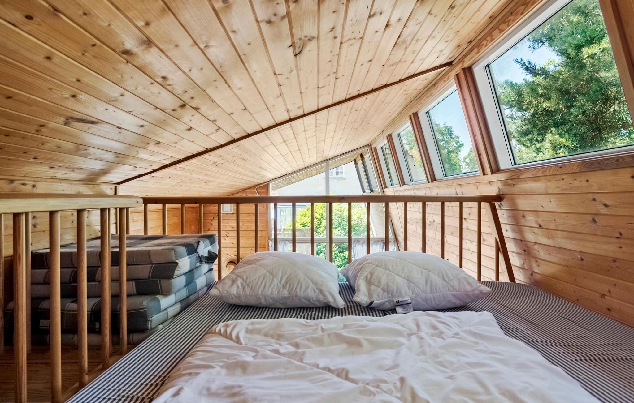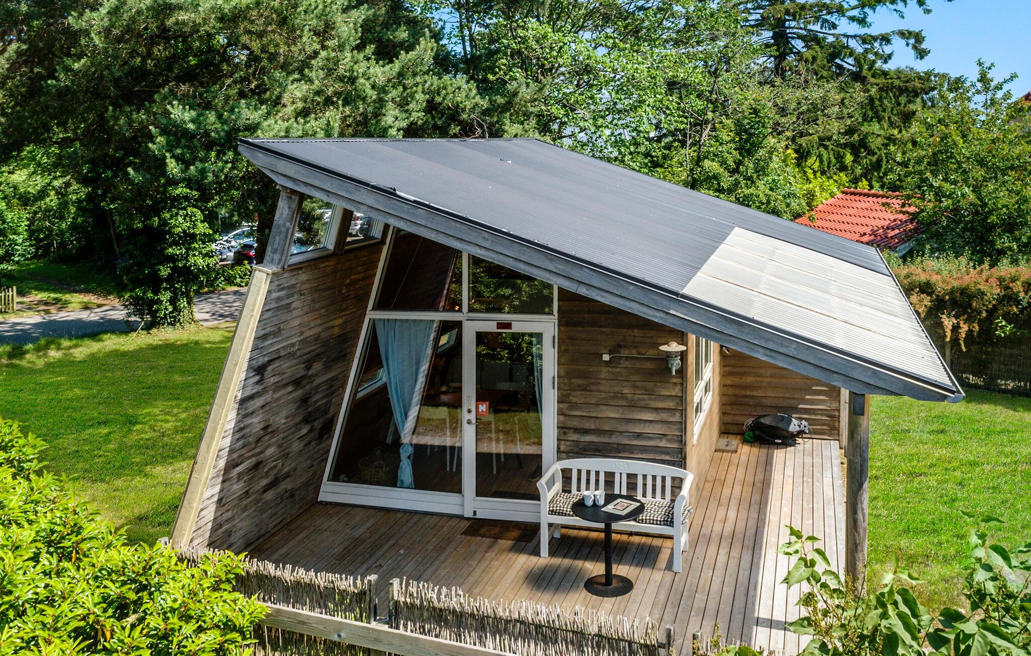 I det attraktive ferieområde Marienlyst finder I dette originalt indrettede feriehus. Det praktisk indrettede interiør er kendetegnet ved de mange træelementer og fremstår åbent og indbydende. De store vinduespartier og ovenlysvinduerne sørger selv op overskyede dage for et godt lysindfald i opholdsrummet og skaber en behagelig atmosfære. Nyd godt af hemsen, som tilbyder to hyggelige sovepladser og giver et kig ud på træerne og himlen. Dette feriehus er ideelt til en lille familie eller et par, der søger en afslappende ferie.