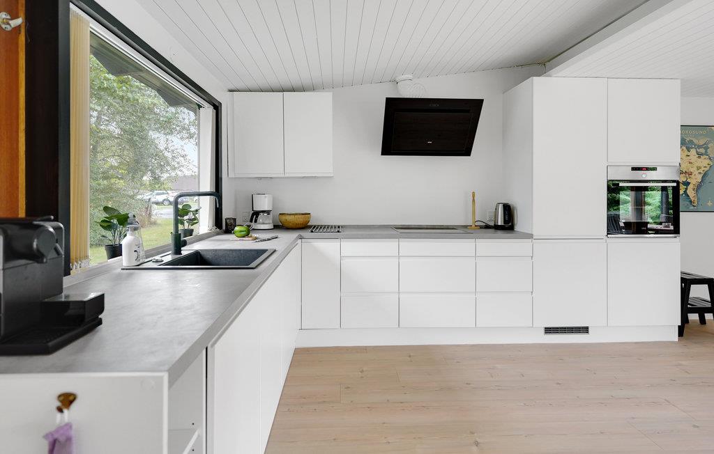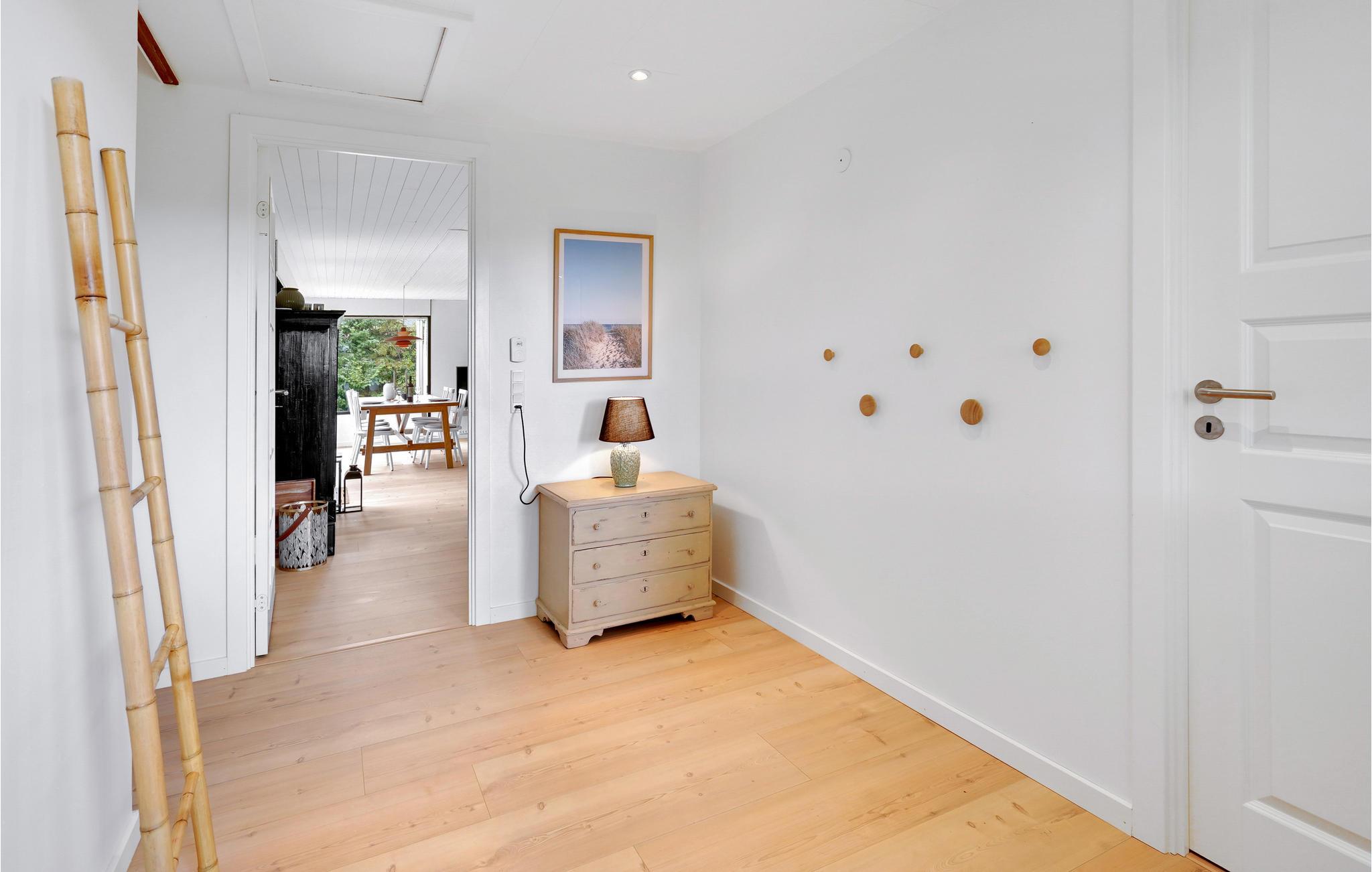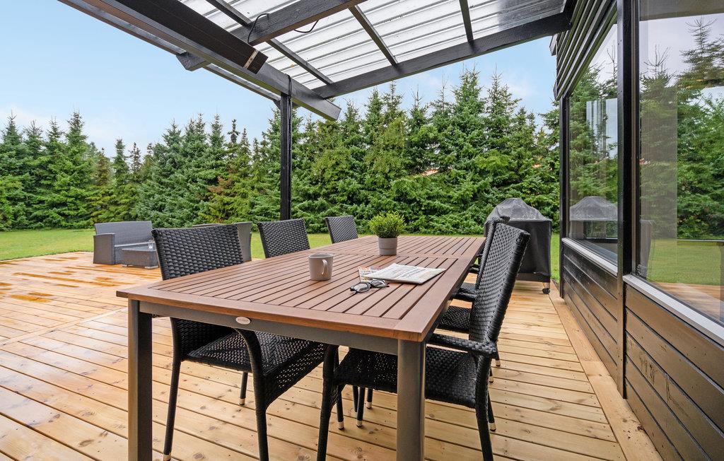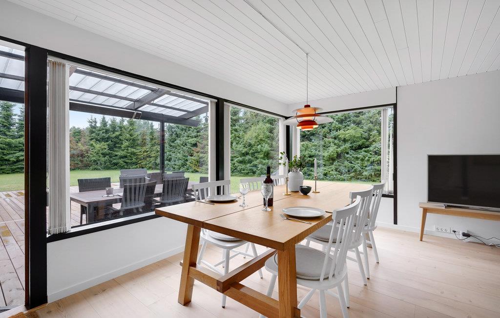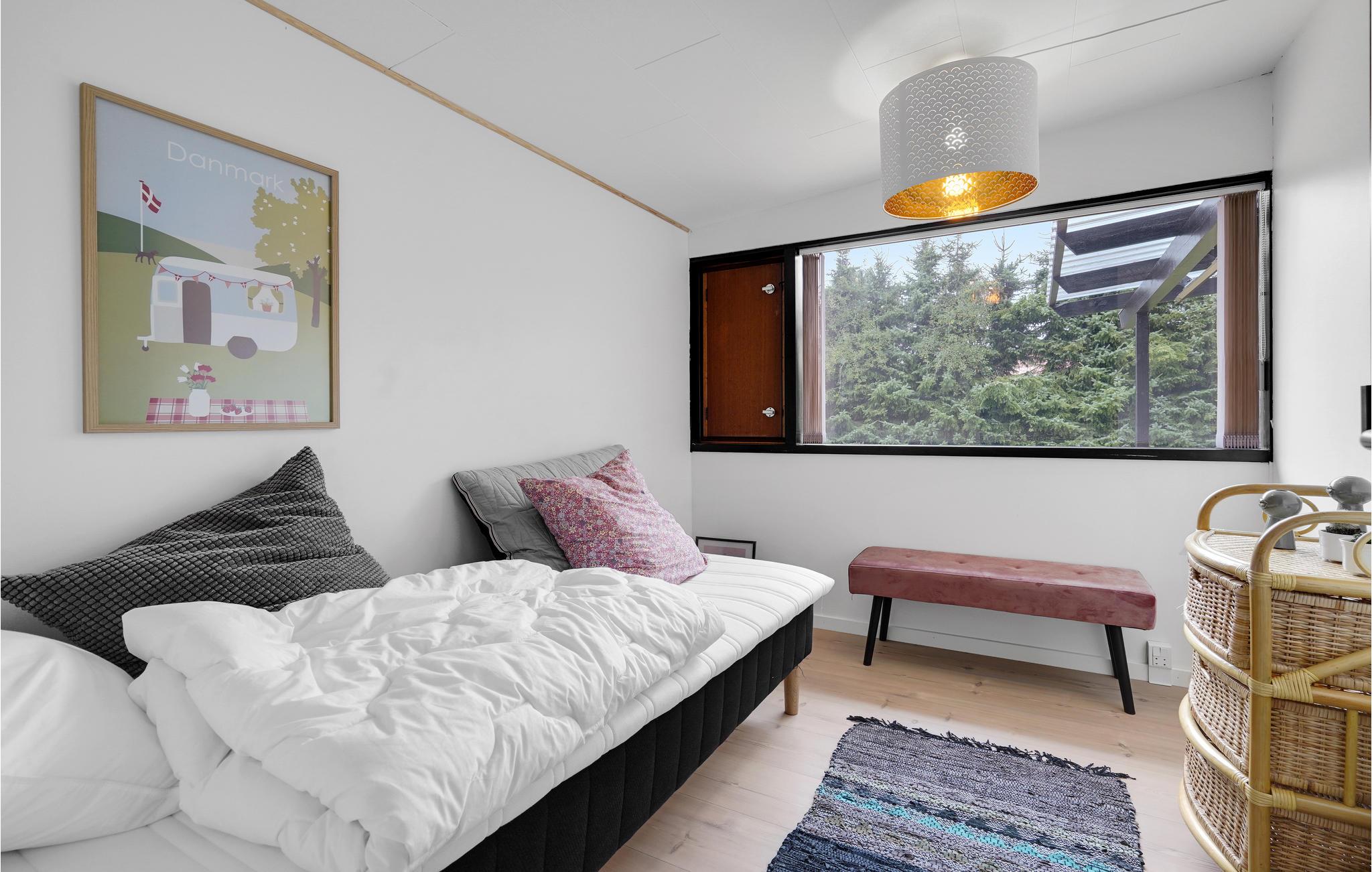 Dette dejlige sommerhus ligger på en grund med en privat have, tæt på havet og strandene. Der består af fire soveværelser, et moderne badeværelse, et køkken og en flot opholdsstue. Gennem de store vinduer har I en smuk udsigt over haven, og der kommer meget dagslys ind.