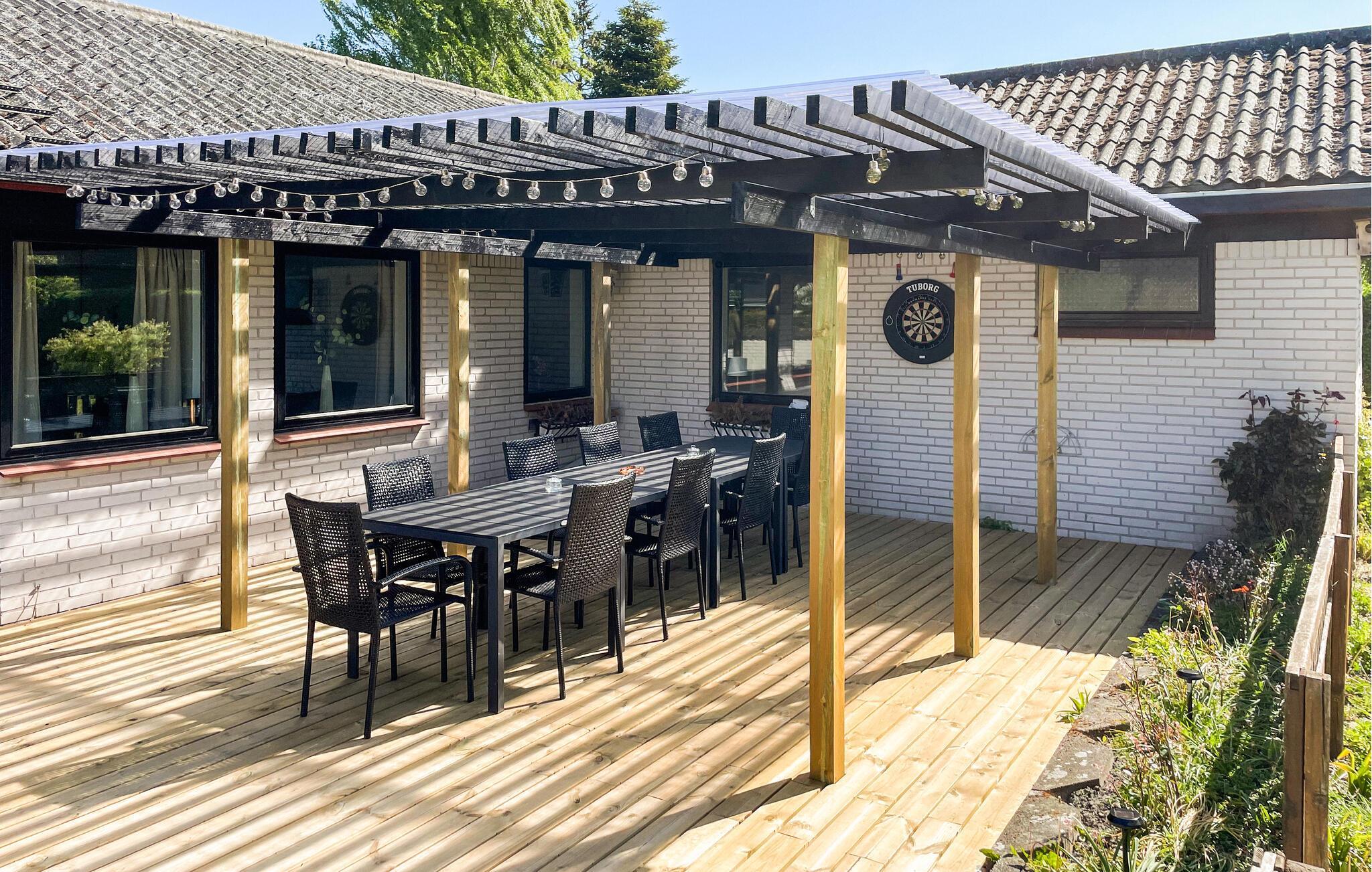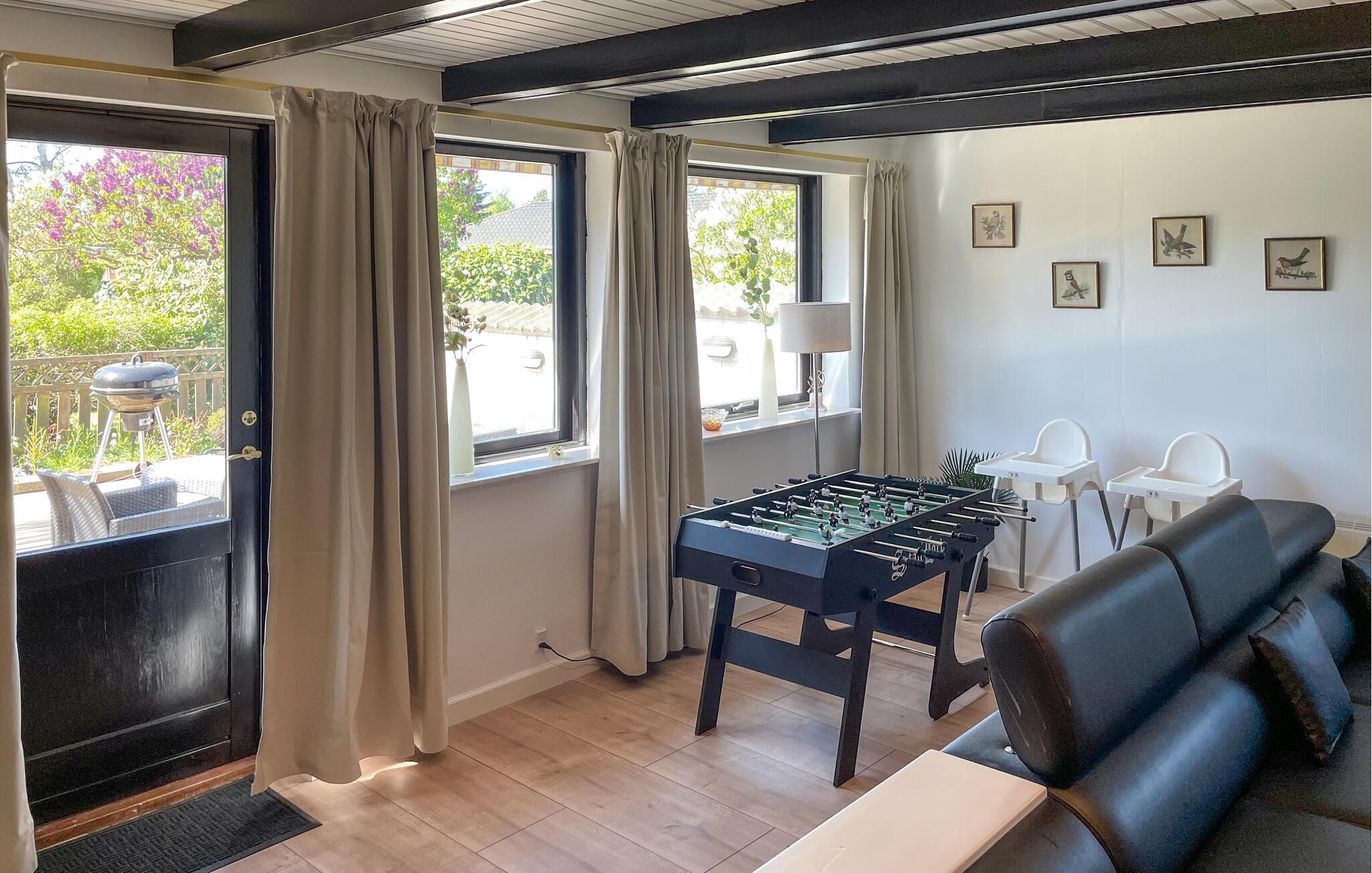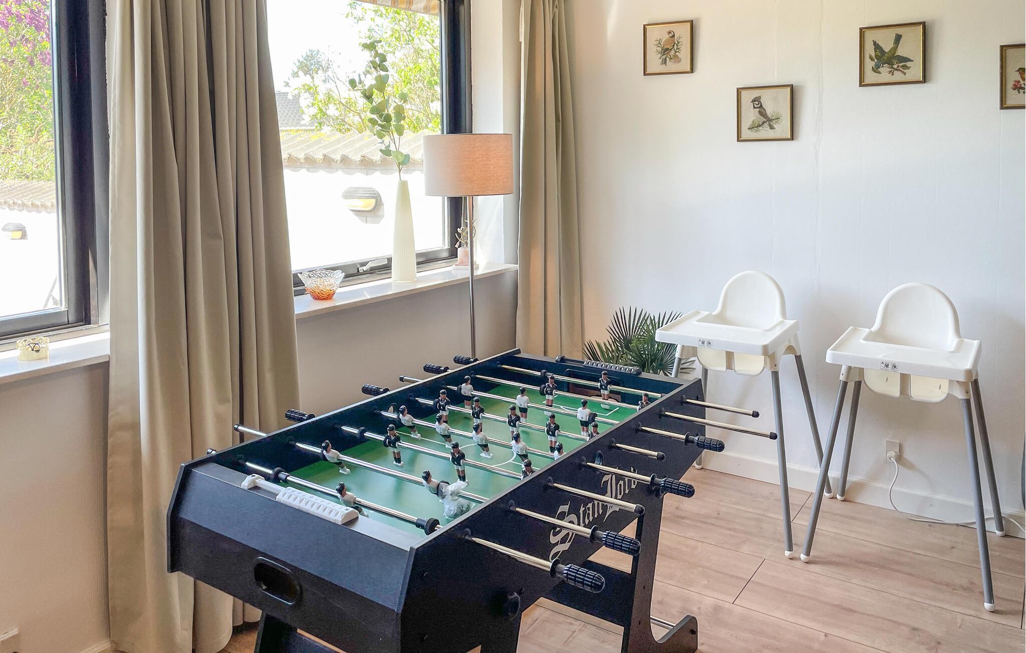 Dette feriehus er et behageligt sted for en familieferie. Begynd dagene med morgenmad ved det smukke spisebord, mens I nyder den velholdte have. Den åbne stue med store vinduer skaber en venlig atmosfære. Slap af i sofagruppen med en god bog eller se en film. I kan også snuppe et spil bordfodbold.