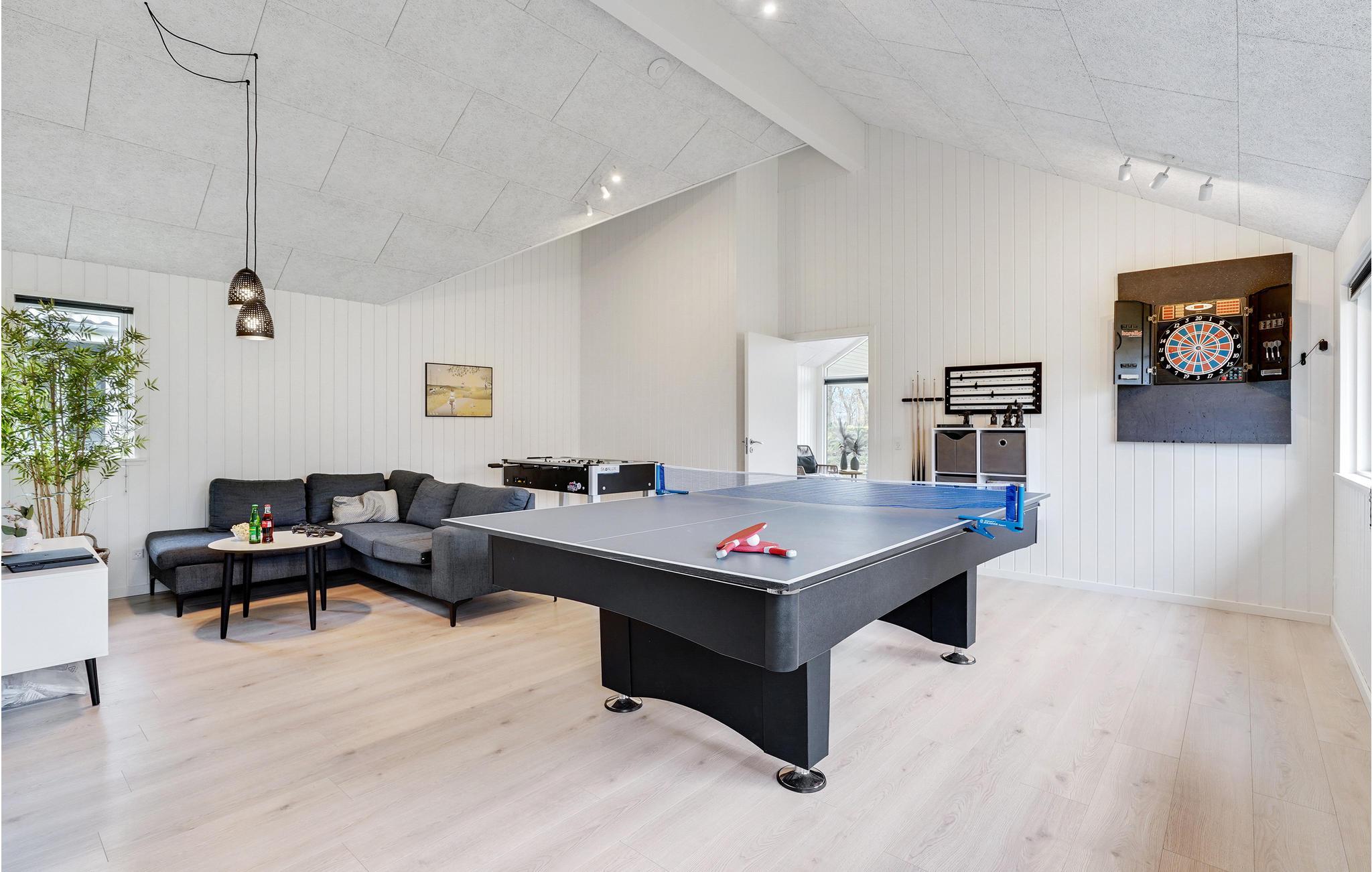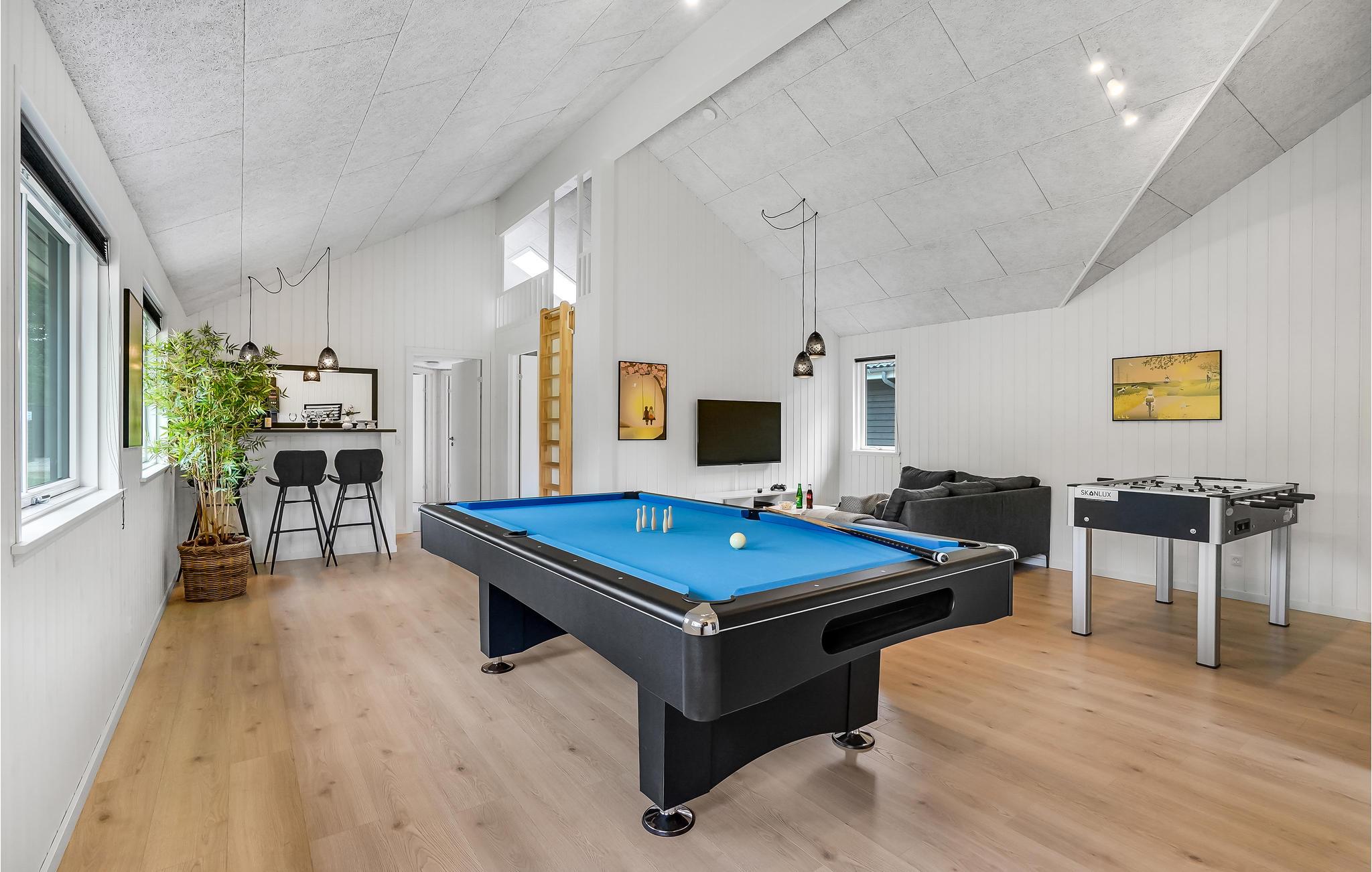 Beliggende lige bag diget og nogle få skridt fra den børnevenlige strand, giver jer dette luksuriøse feriehus masser af plads til hyggelige familiesammenkomster. Sæt gang i madlavningen og glæd jer til dejlige måltider med venner og familie. Mens nogle nyder bordfodbold, billard eller bordtennisbordet, kan I forkæle jer selv med afslappende øjeblikke i saunaen eller spabadet – eller lære jeres yngre gæster at bade i den indendørs pool. Spil PlayStation eller snak over et glas vin ved den knitrende brændeovn.