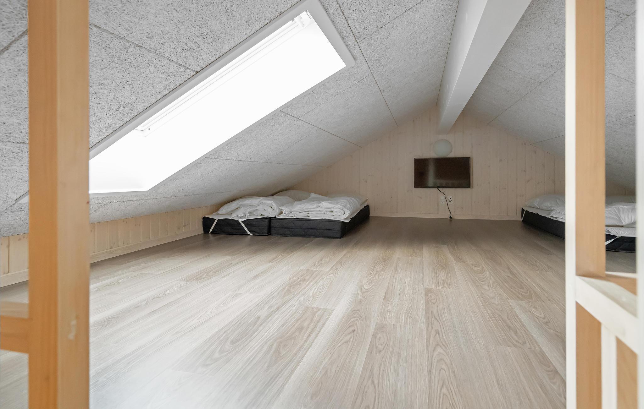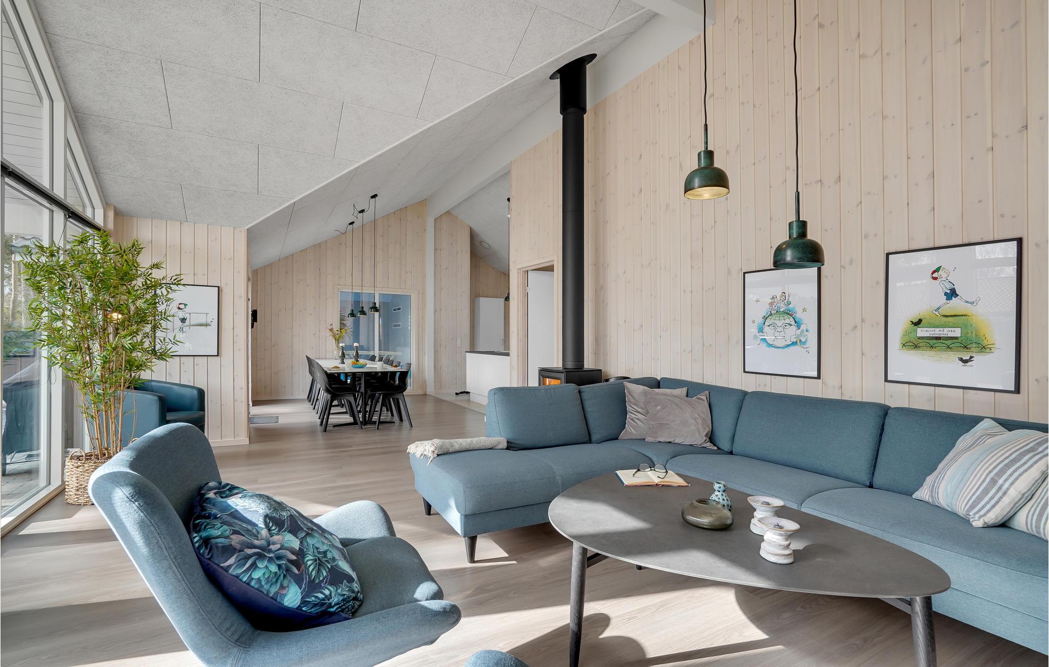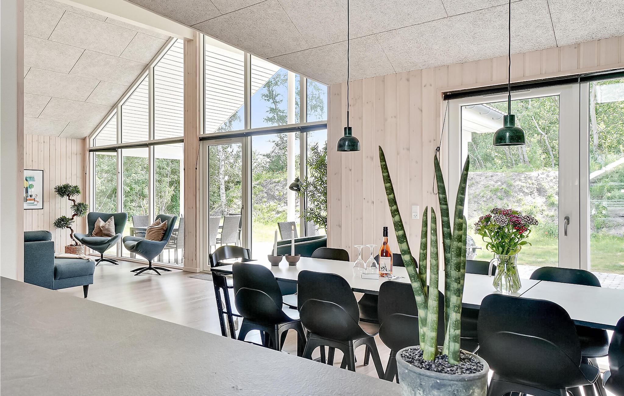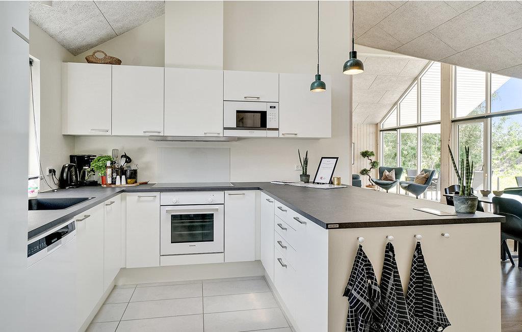 Feriehuset er ideelt til et familieophold og giver mulighed for at tilbringe afslappende dage sammen. Huset er godt indrettet med to soveområder og en hems, og der er tilknyttet badeværelser til soveområderne, så det er nemt at fordele sig, når I alle sammen skal af sted. Midt i huset ligger det åbne køkkenområde, hvor der er plads til, at I kan gøre madlavningen til et fællesprojekt. I kan nyde maden rundt om det lange spisebord.