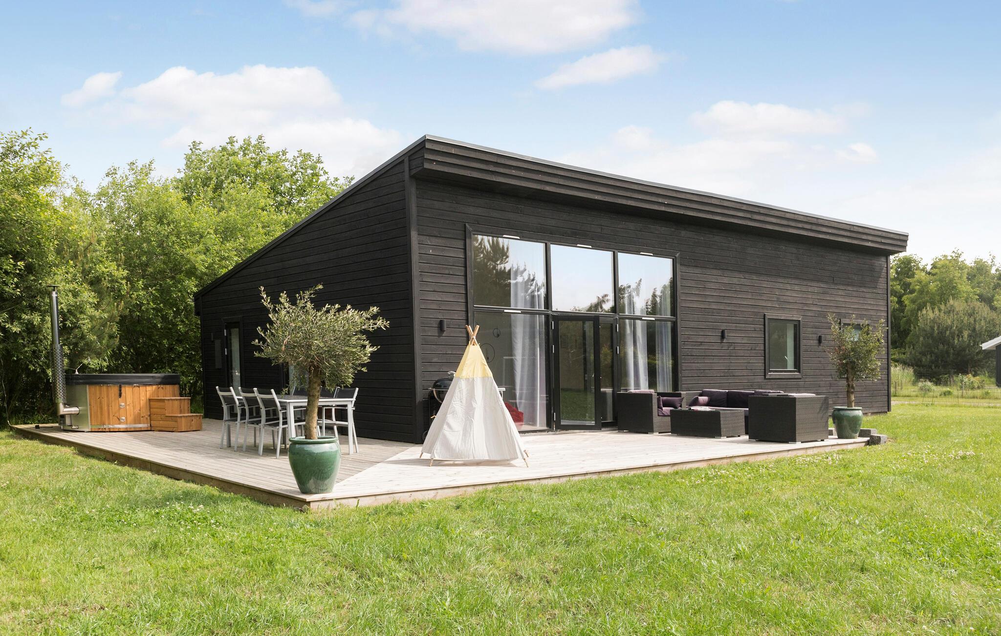 Moderne og stilfuldt feriehus i Marielyst med vildmarksbad og stor terrasse tæt på strand og natur.