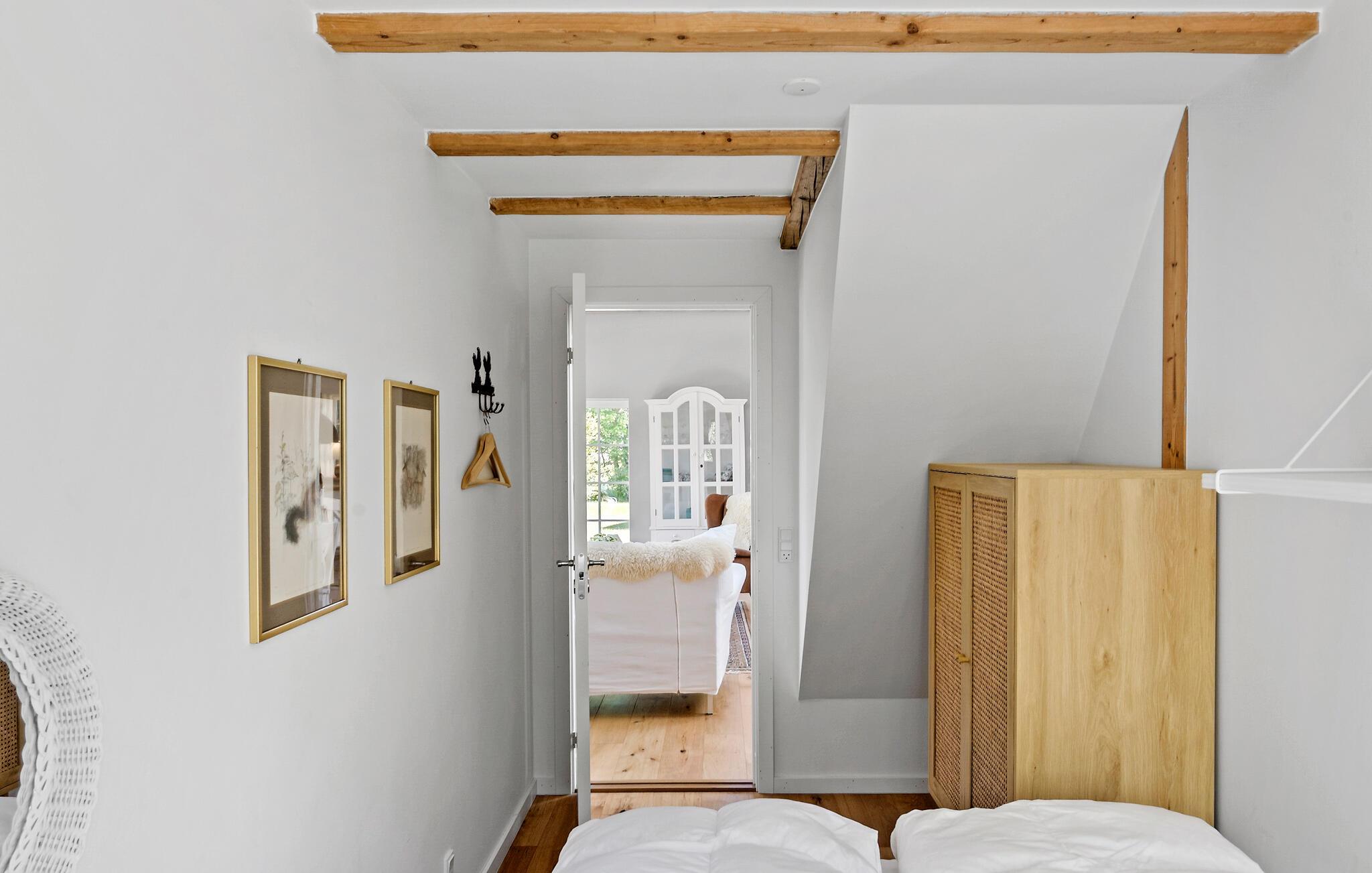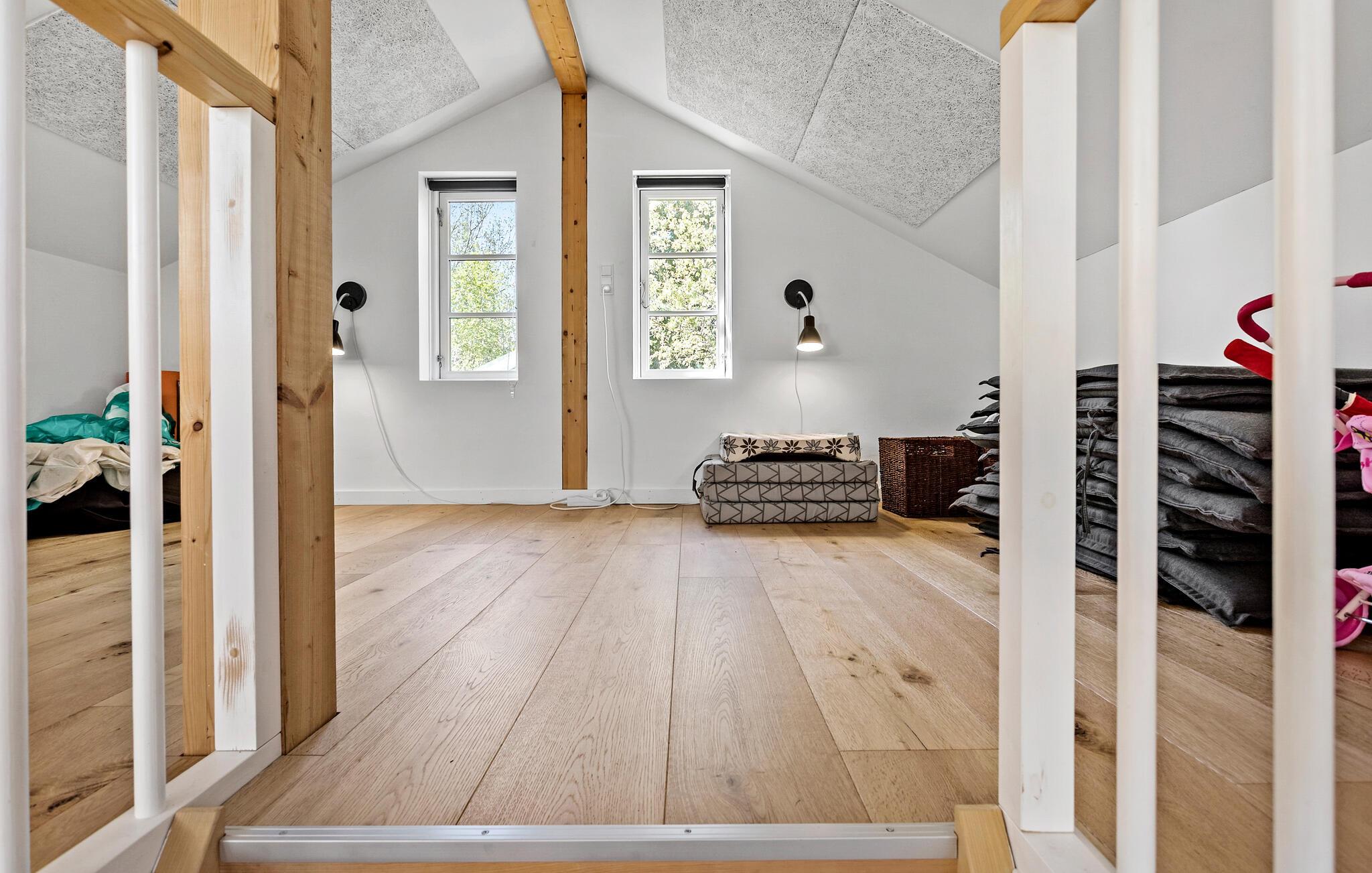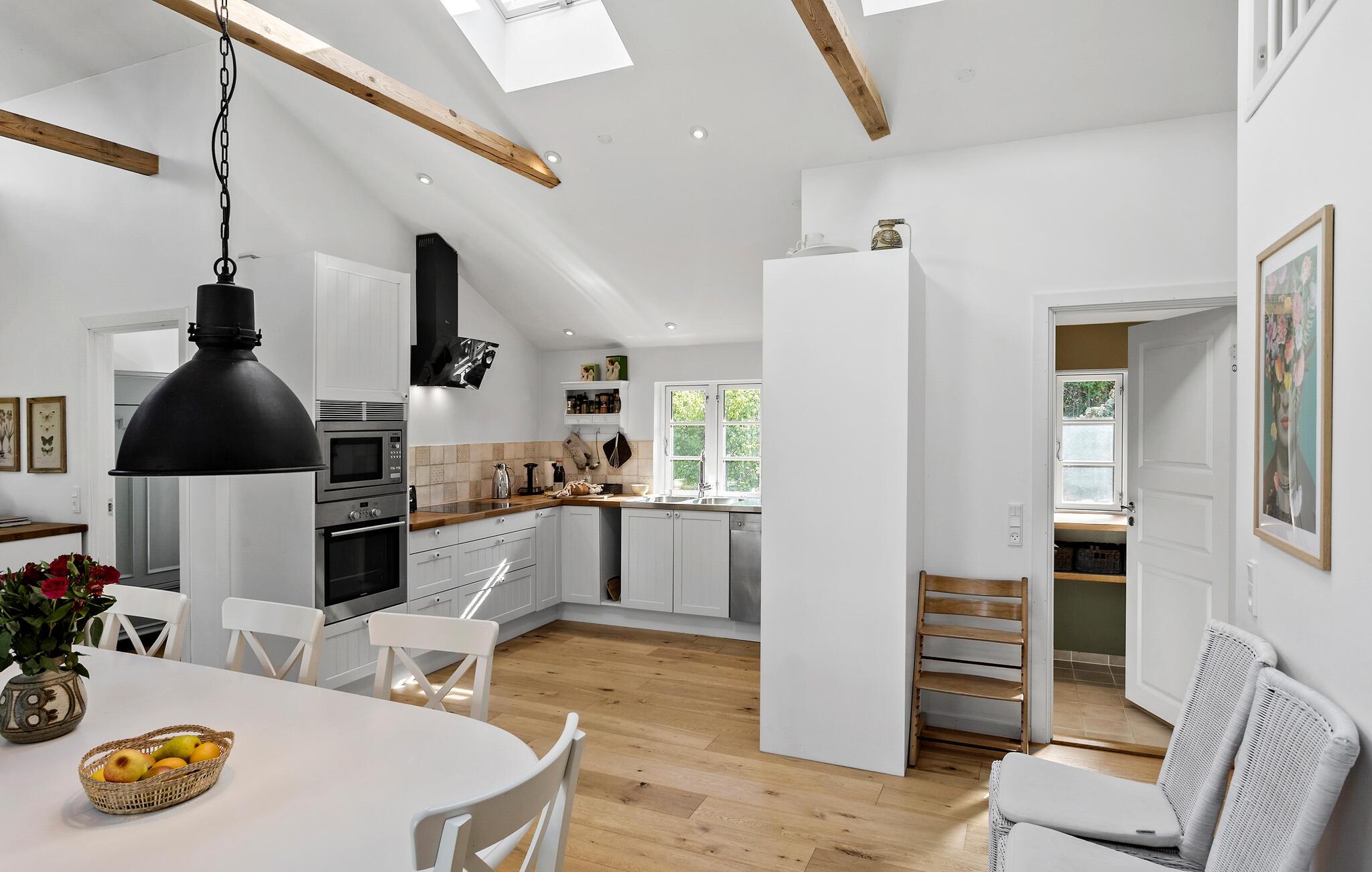 Det stilfulde og komfortable hus giver hele familien mulighed for at nyde en velfortjent pause fra hverdagen. Begynd jeres dage med en lækker morgenmad ved spisebordet eller på den solrige terrasse, hvor I kan nyde den friske luft og udsigten til det grønne. Det store opholdsområde med de stemningsfulde træbjælker i loftet og de store vinduespartier lader masser af lys komme ind og byder på en herlig udsigt til den vidtstrakte have. Hyg jer i de behagelige sofaer, og slap af med en god film eller en spændende bog.