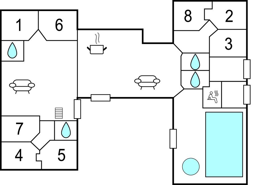 Et populært feriehus med otte gode soveværelser, en hems og fire lækre badeværelser. Huset er udstyret med komfortable møbler, og har alt det udstyr, der skal til, for at I føler jer hjemme. Det indeholder et lækkert kombineret stue/køkken/alrum, som ligger midt i huset og automatisk bliver jeres samlingssted om madlavningen og hyggelige stunder foran brændeovnens knitrende ild. Aktivitetsrummet ligger ved siden af stuen og har masser af aktiviteter. I poolrummet kan I boltre jer i timevis i den skønne, forfriskende pool eller i det 4-personers spabad og slutte af i den velgørende sauna. På de skønne terrasser kan I sidde og slappe af og nyde ferien i fulde drag. På lune sommeraftener er det også skønt at tænde op i grillen og tilberede et lækkert feriemåltid.