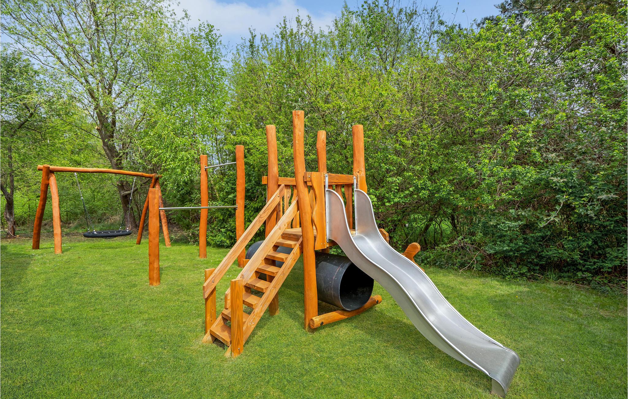 Det store naturområde er virkelig smukt, og ofte kigger dådyrene forbi. Her finder I en stor bålhytte, et legeområde med legetårn, gynger og meget mere, som er et rent slaraffenland for børnene.