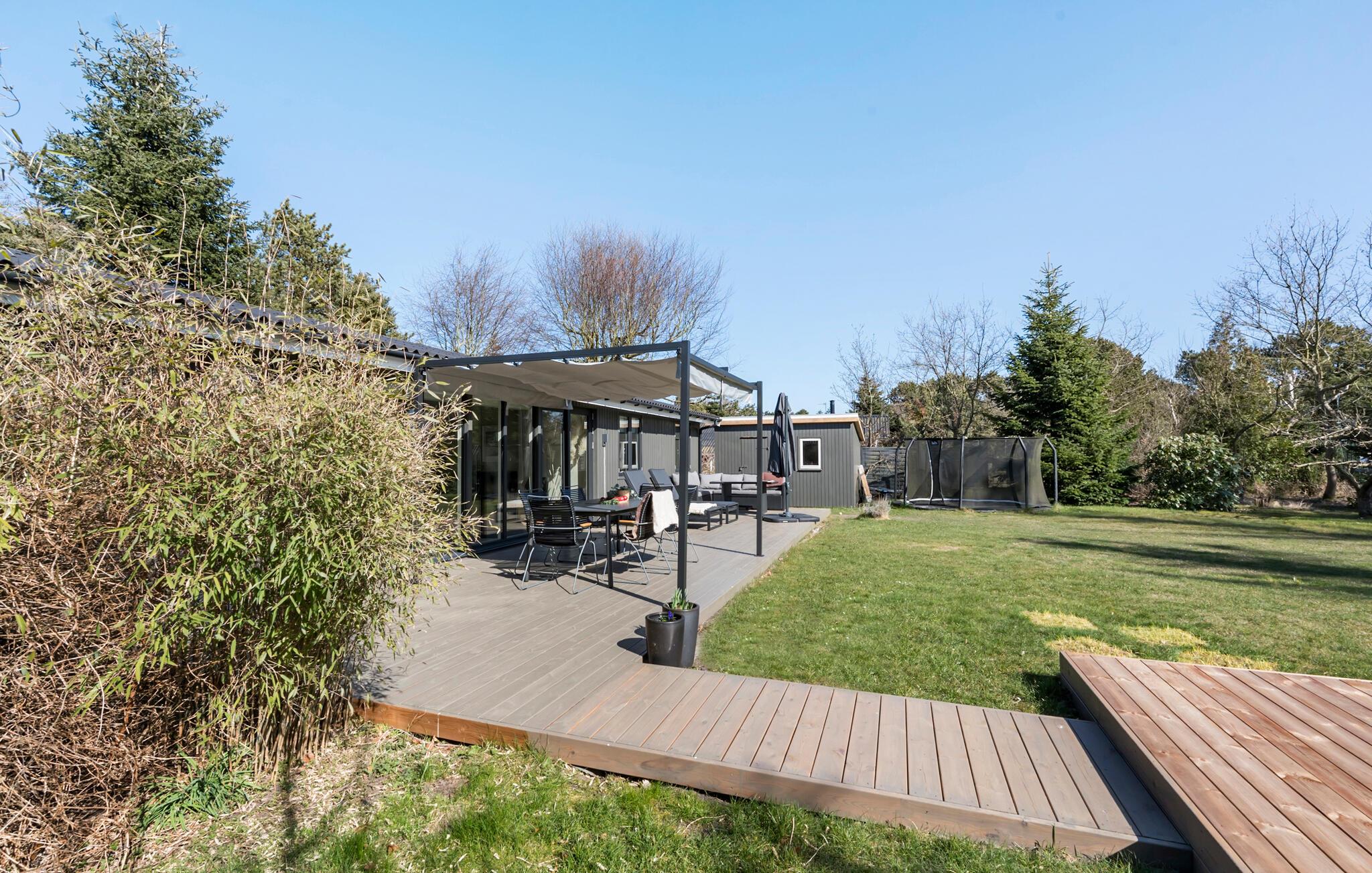 Der tilbydes også afslapning. Fordyb jer i den beroligende varme fra vildmarksbadet på terrassen. I mellemtiden kan børnene boltre sig på trampolinen eller lege på rutsjebanen og gynge. Afslut dagen med en grill eller et socialt samvær omkring den udendørs bålplads.