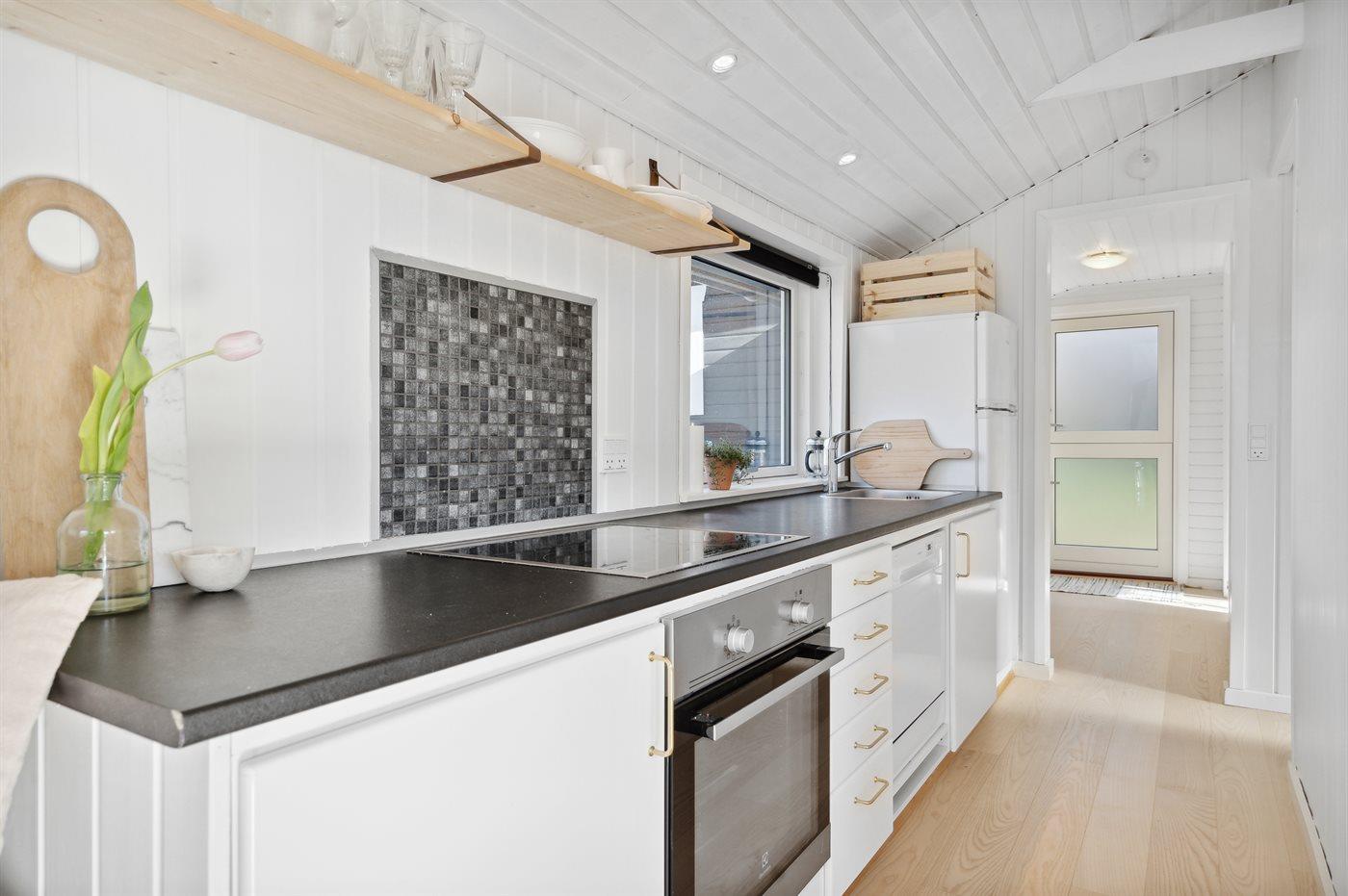 Køkkenet er udstyret med 1 køleskab. Der er 4 keramiske kogeplader, varmluftovn samt opvaskemaskine.
