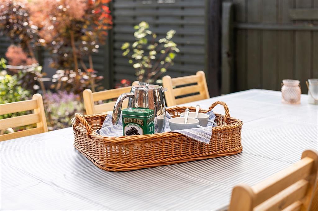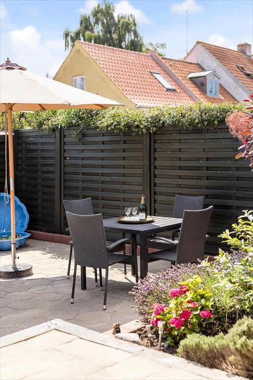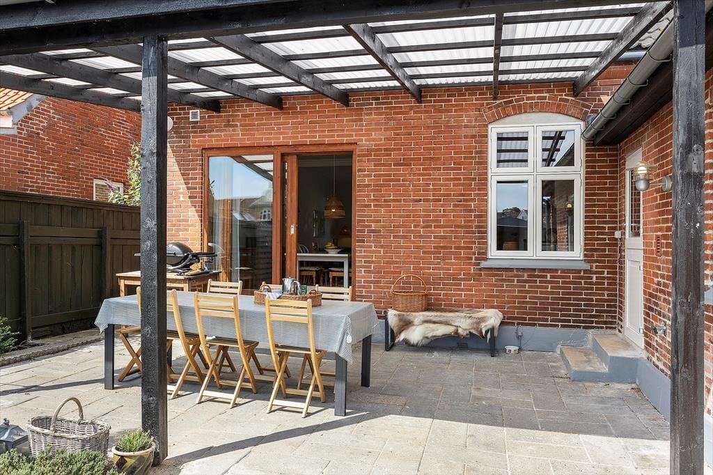 Udendørs venter en rolig, lukket gårdhave – perfekt til afslapning i solen – samt en overdækket terrasse med havemøbler, hvor du kan nyde lange, lyse aftener. Og når sulten melder sig, tænder I bare op i havens grill og lader duften af sommer brede sig.