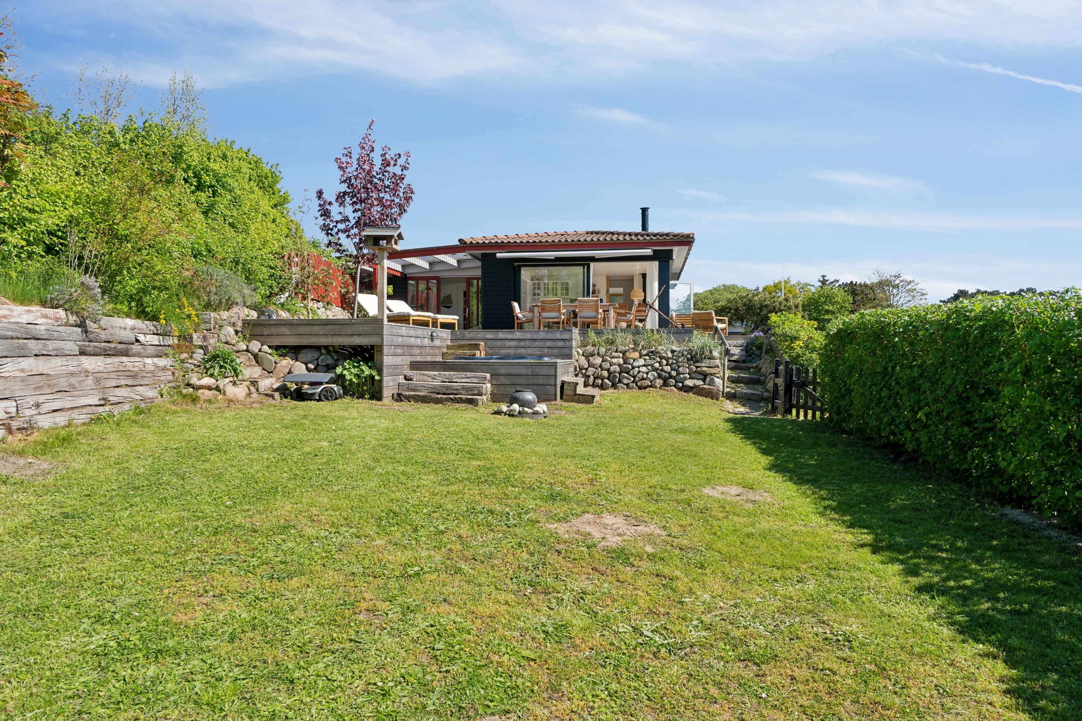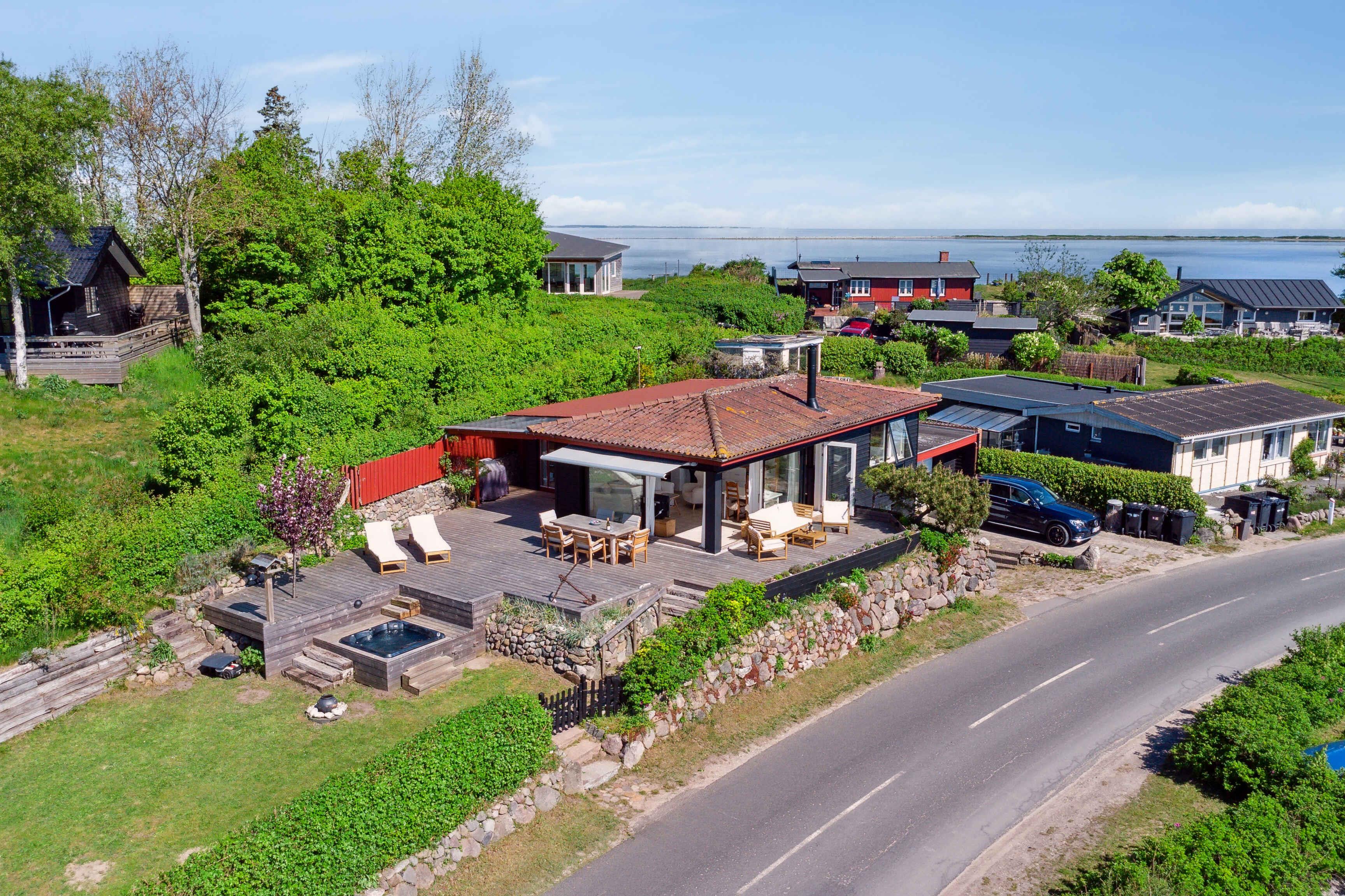 Velkommen til dette skønne sommerhus perfekt til afslappende ferier og familiehygge. Det charmerende hus byder på tre komfortable soveværelser og 5 sovepladser (op til 7 hvis man er ok med tilbringe natten på en daybed), ideelt til en afslappende ferie med familie eller venner. "Børneværelset" (enkeltseng) ligger med direkte adgang gennem det hyggelige soveværelse som har dobbeltseng og den mest vidunderlige udsigt til vandet og solopgangen. Husets bagerste soveværelse er stort og rummeligt med dobbetseng hvorfra du stadig lige kan skimte haven, havet og himmelen. Faciliteterne i huset inkluderer et veludstyret, nyt køkken, ældre men fint badeværelse og en hyggelig stue med panoramaudsigt over bugten, omkringliggende øer og det hyggelige fiskerleje. Åben de store skydedøre og tag din morgenmad med direkte ud på den rummelige terrasse, kun 20 meter fra vandet, og lad dig fortrylle af den betagende udsigt. Området omkring huset er indhyllet i en unik naturskønhed og tilbyder fantastiske udendørsaktiviteter. Udforsk de nærliggende stier, tag på cykeltur i det naturskønne landskab eller nyd solnedgangen ved vandet. For vandhunde og børn, der foretrækker bugtens lave vand, ligger stranden lige uden for døren - for andre strandelskere er der kun en kort gåtur til flere dejlige strande, hvor sol, sand og bølgernes brus venter. Skulle havet føles for koldt, så hop en tur i udespaen - den er integreret i terassen så du kan fortsætte med at nyde udsigten og hygge med resten af selskabet mens du bader. Indkøbsmuligheder hos den lokale campingplads er også bekvemt tæt på, hvilket gør det let at supplere forsyningerne under dit ophold. Dette nyistandsatte sommerhus kombinerer bekvemmelighed med naturens skønhed og er det ideelle udgangspunkt for en uforglemmelig ferie. Book dit ophold nu og oplev alt, hvad dette unikke område har at byde på.