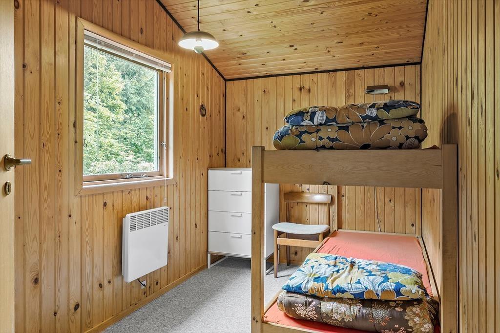 Det 66 m2 store sommerhus har et helt klassisk udseende – også inden døre, hvor der er loft til kip og umalede trælister på væggene. Det er med til at skabe en rigtig rar atmosfære, og udsigten til den grønne grund passer helt perfekt dertil. Stuen er indrettet med sofaafdeling og spisebord, og der er åben forbindelse til et enkelt og funktionelt indrettet køkken. Et badeværelse med bruser ligger ved entréen, og endelig byder planløsningen på tre soveværelser med sengepladser til seks personer.