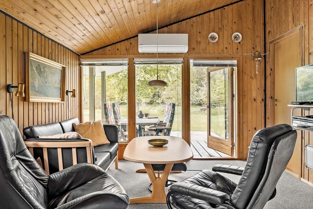 Det er herligt at opholde sig både inde og ude her på Strandgårdsvej 68 ved Geraa. Når vejret er godt, kan I lave bål, spille bold og nyde livet på naturgrundens solrige terrasse, og står den på indendørs hygge, er det skønt at samles i stuen med brætspil og varm kakao.