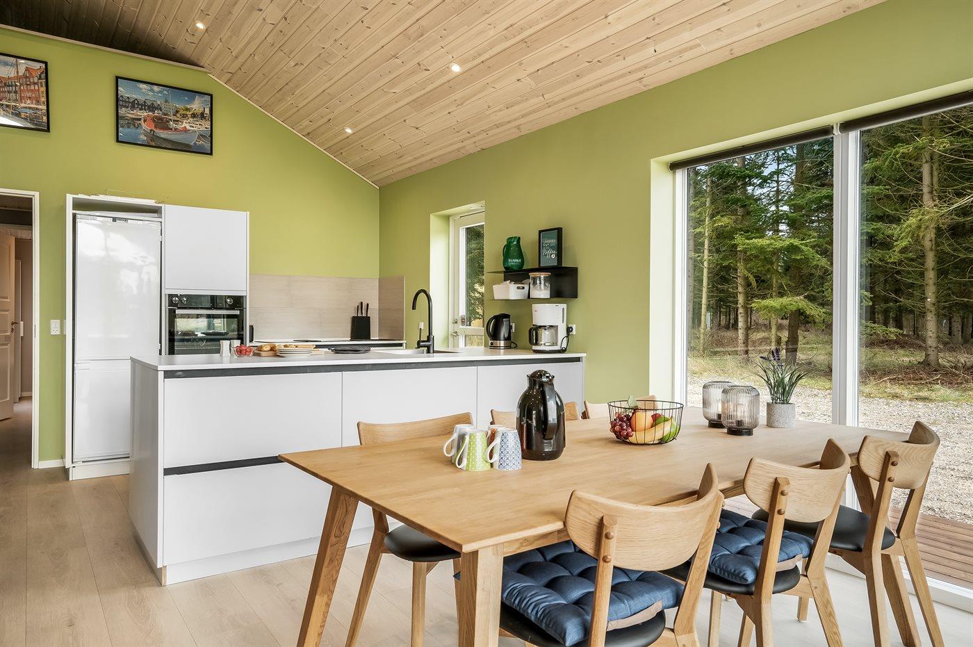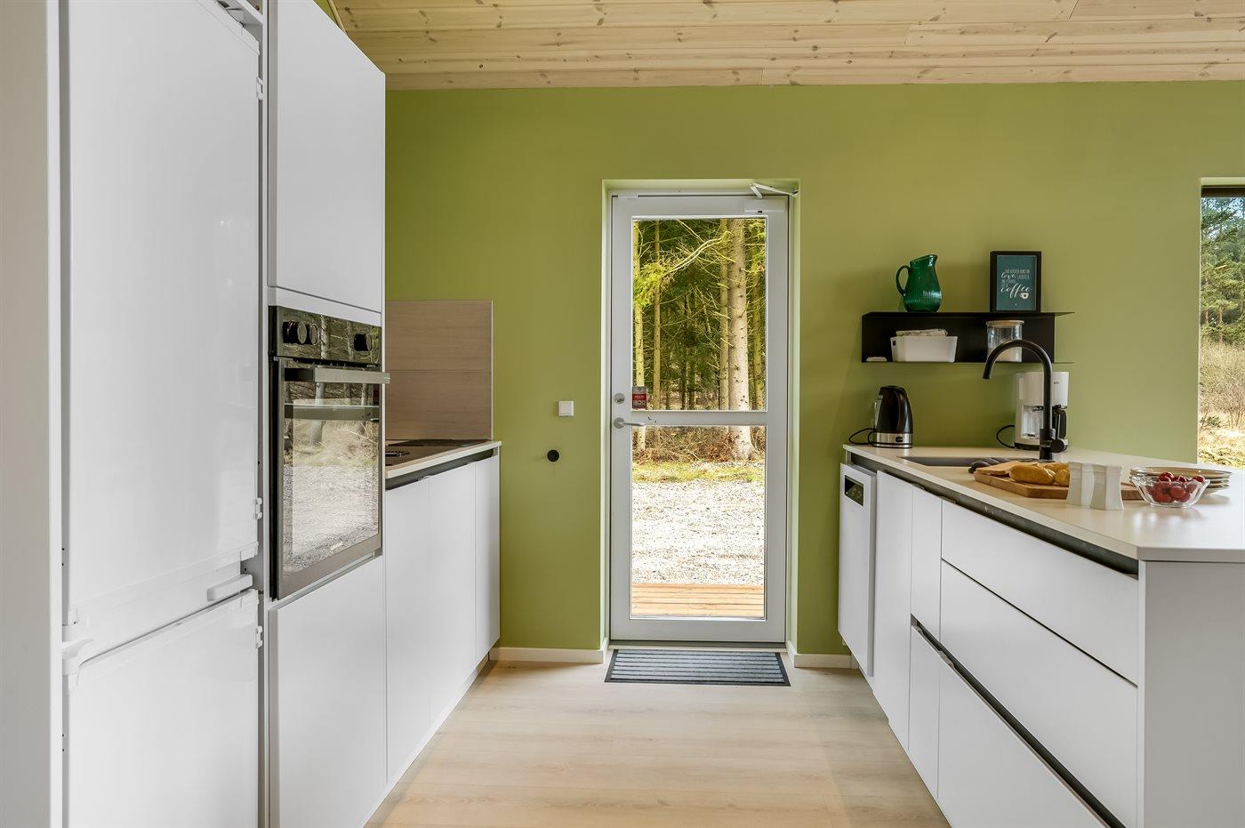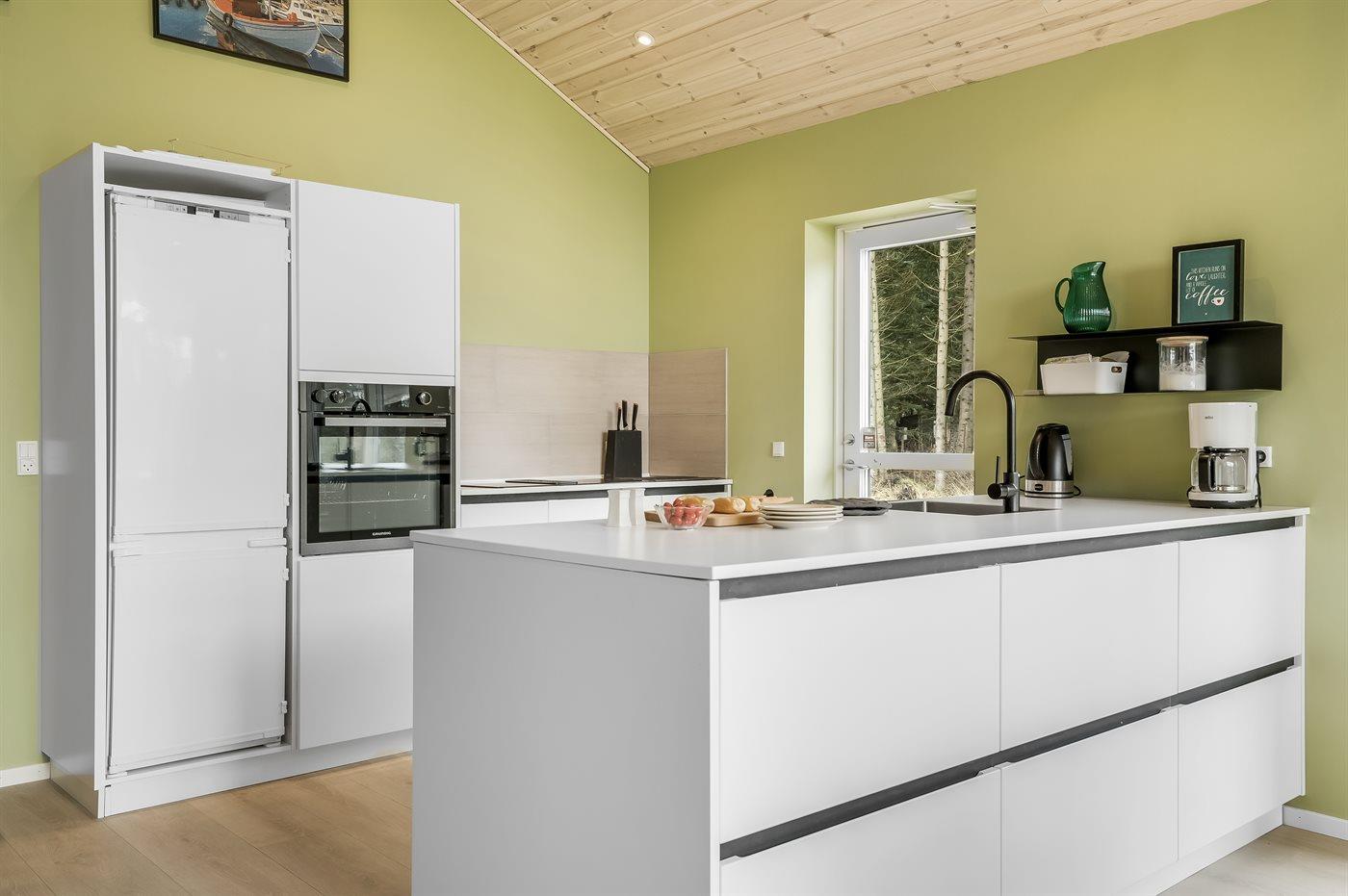 Køkkenet er udstyret med 1 køleskab. Der er 4 induktionskogeplader, varmluftovn samt opvaskemaskine.