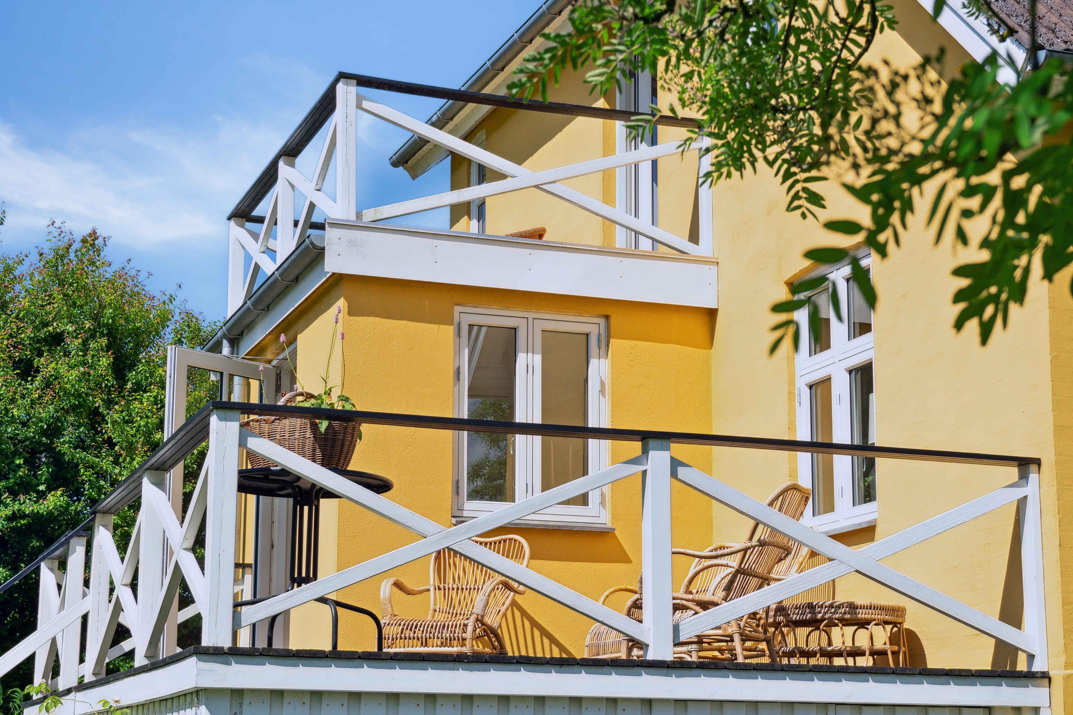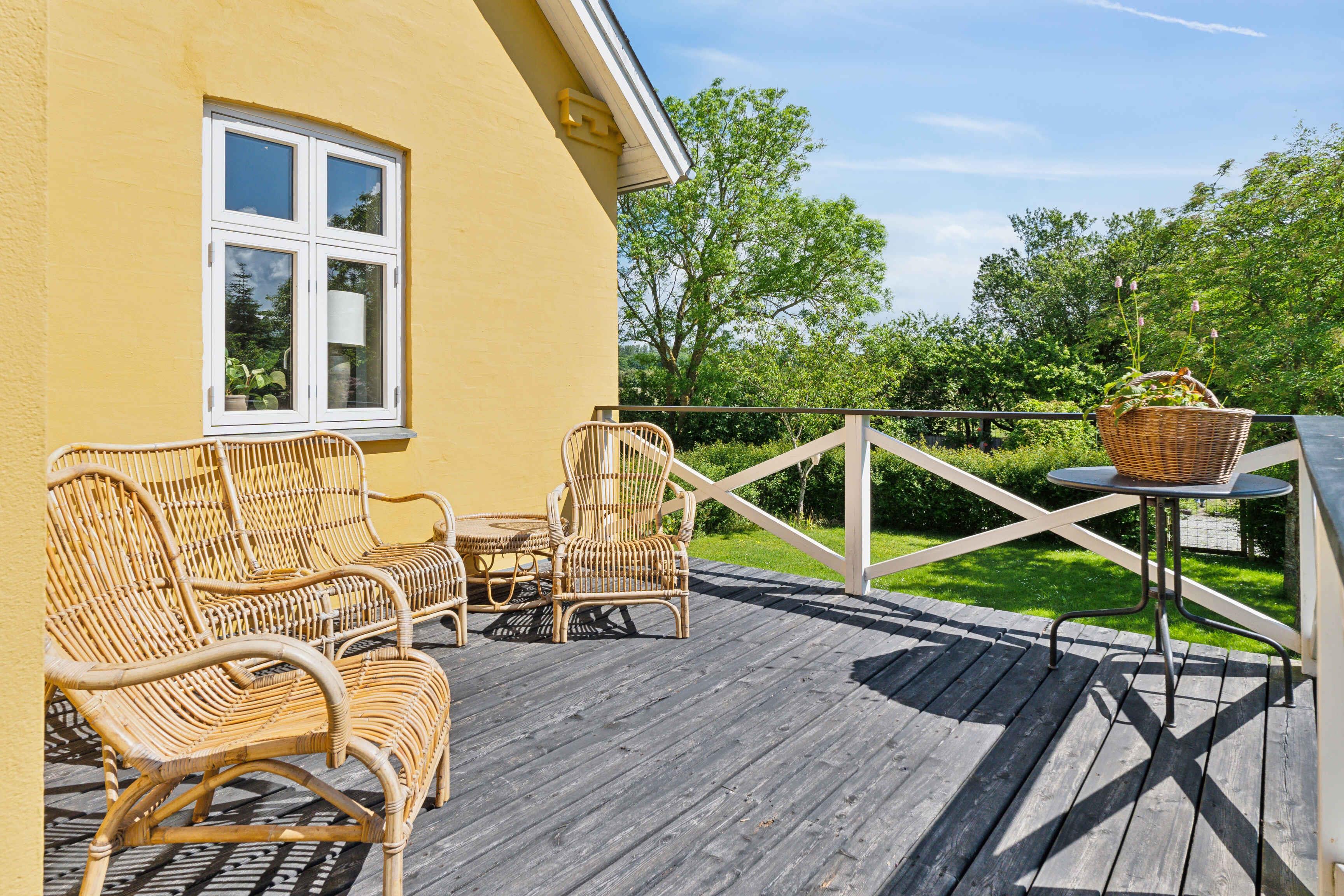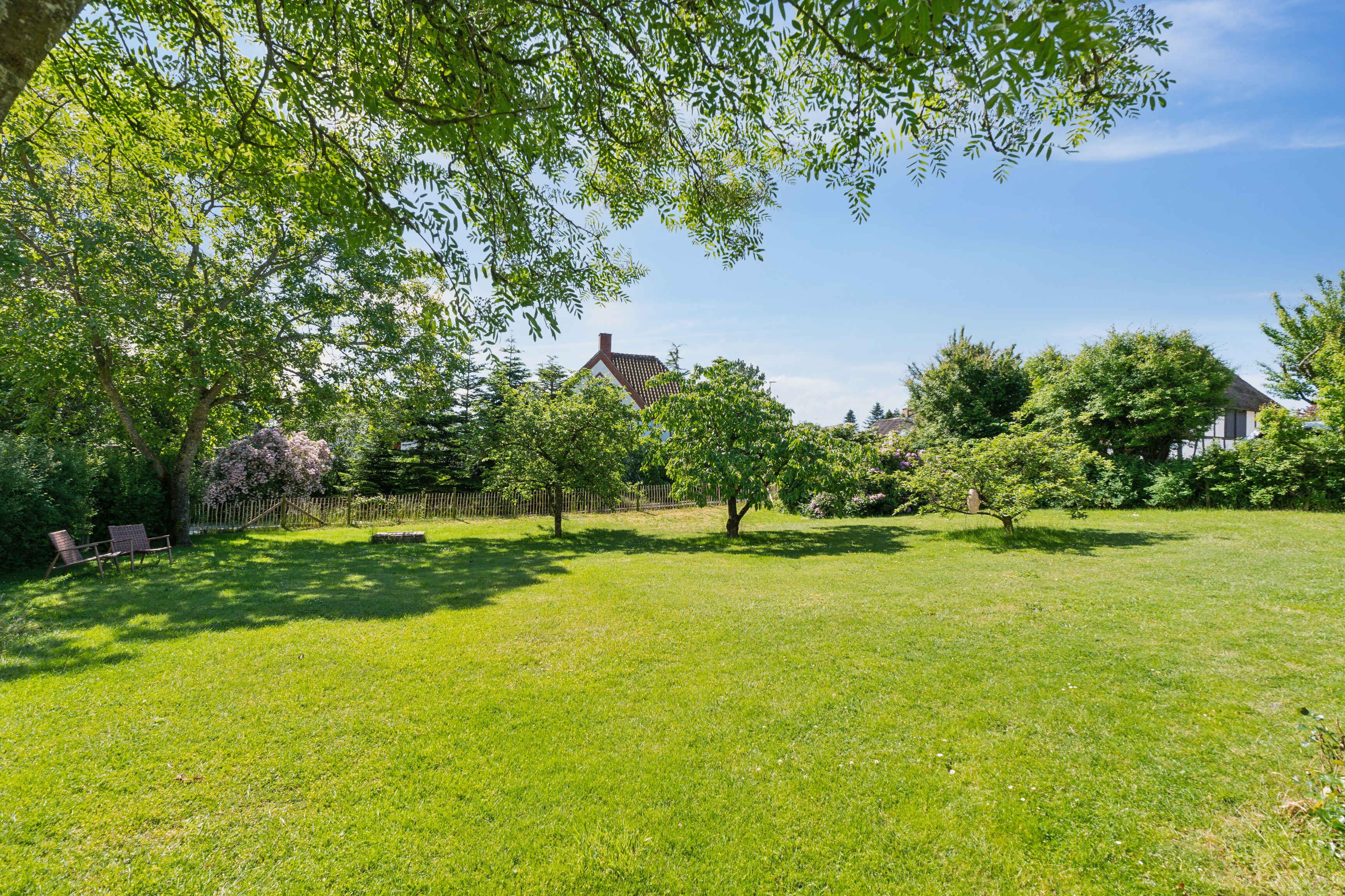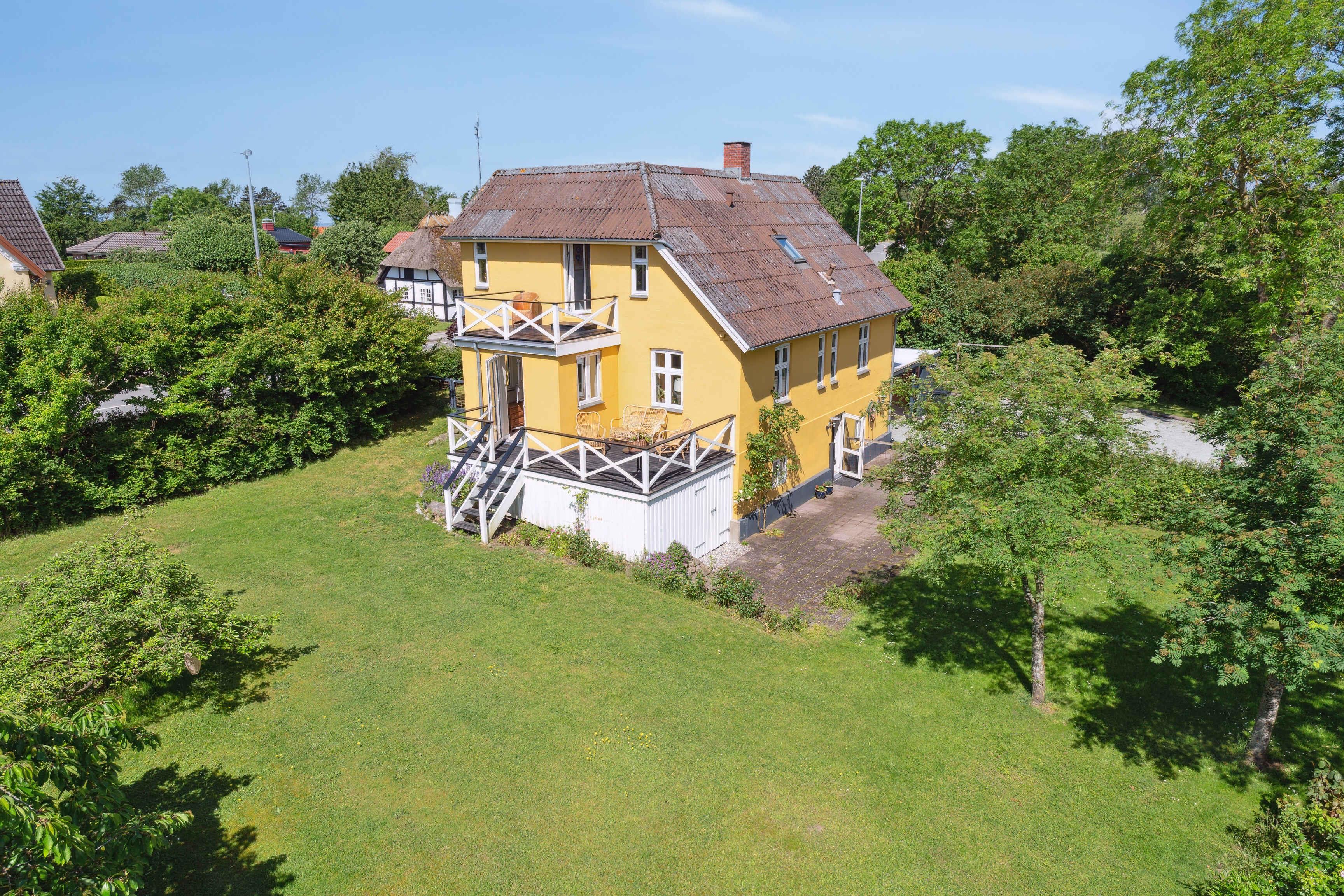 Smuk gul landvilla nær vandet med stor have og fokus på ro, natur og samvær for familie og venner.