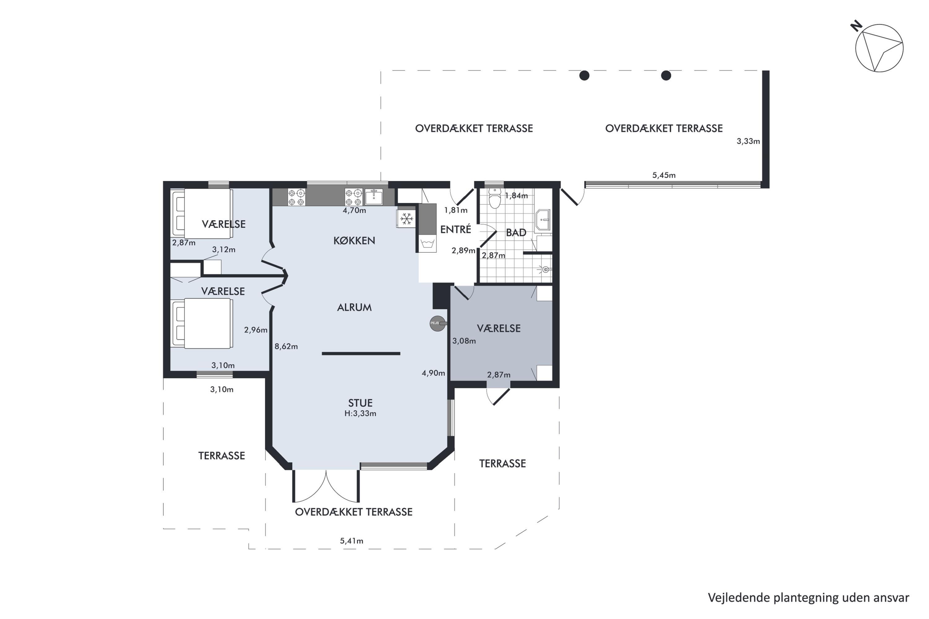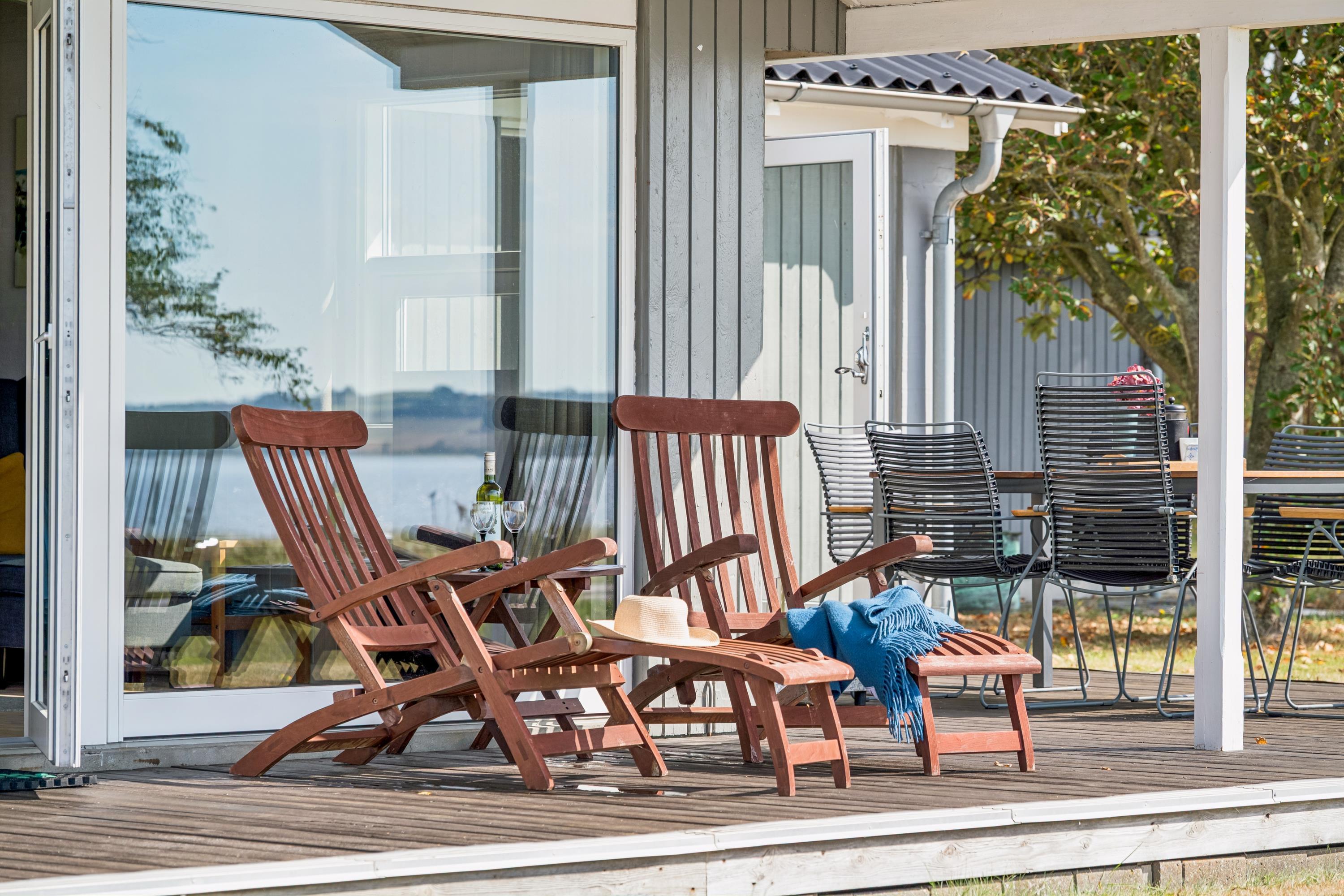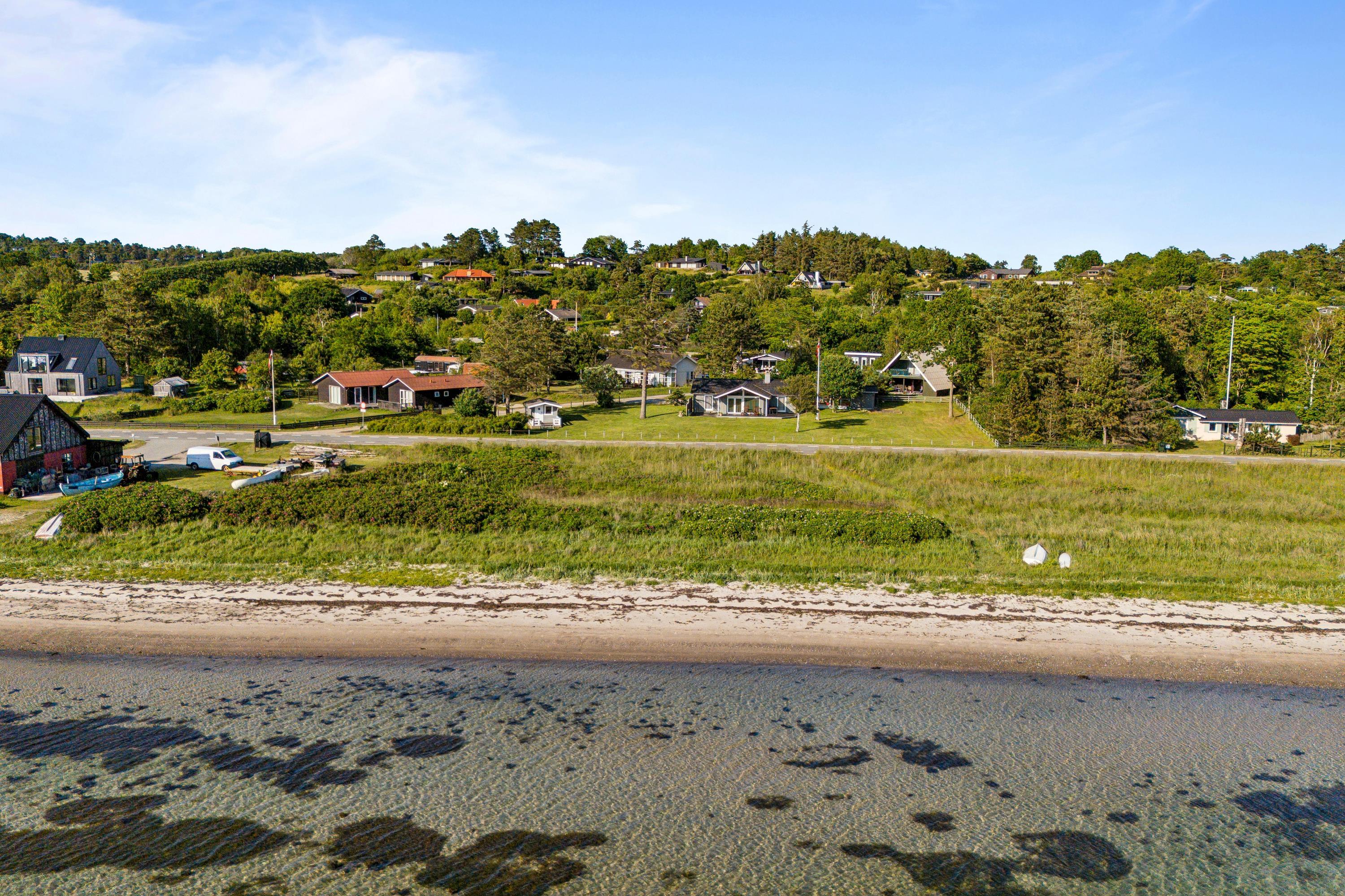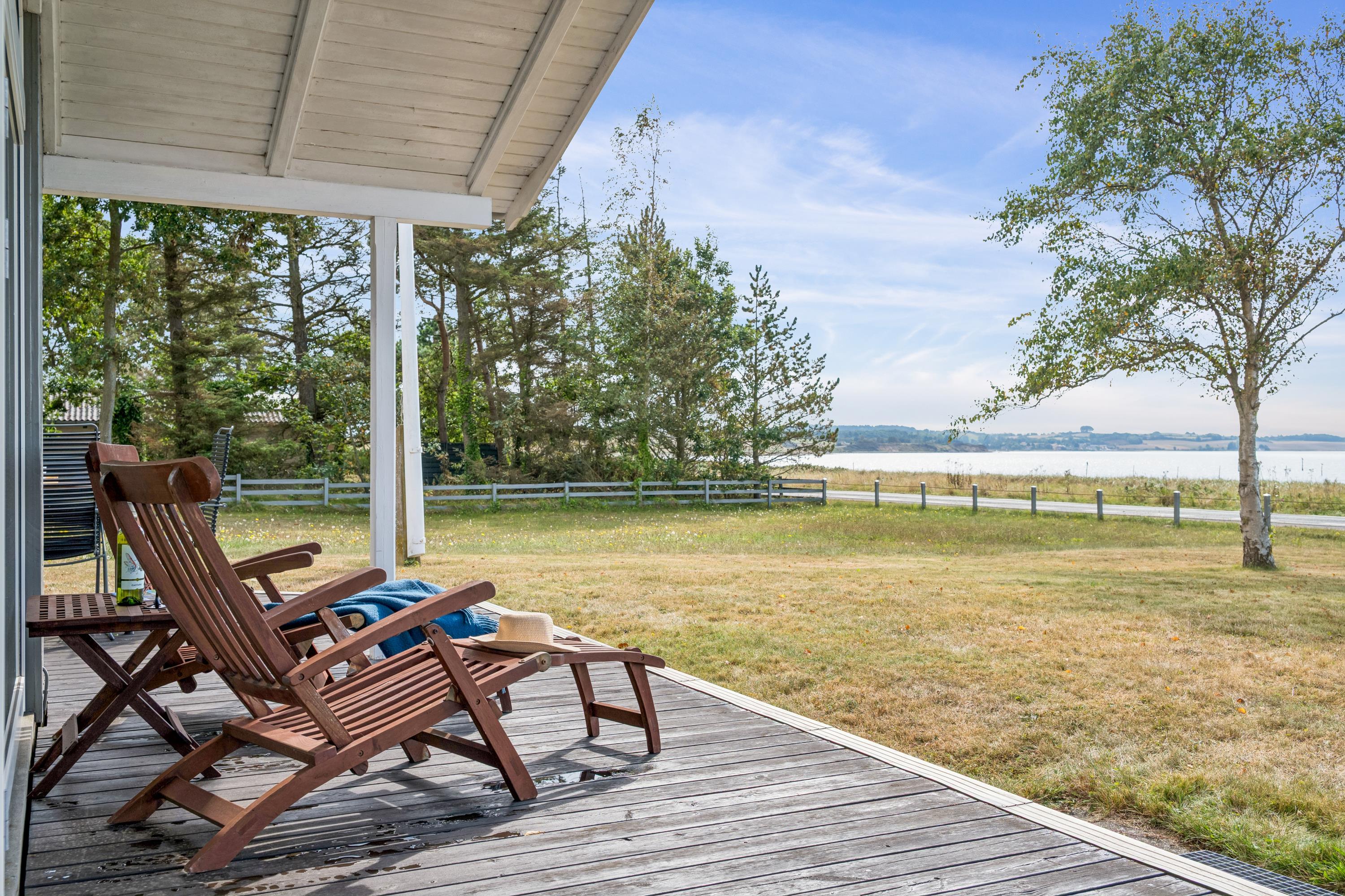 Rummeligt, lyst og skønt feriehus med pragtfuld beliggenhed på kanten af Helgenæs, med panoramaudsigt over Begtrup Vig og bare 75 meter fra stranden. Vestvendt og delvist overdækket træterrasse med udgang fra stue samt stor østvendt fliseterrasse med carport, som er omdannet til lukket terrasse med panoramavinduer mod vandet. Der er havemøbler, liggestole, parasol og grill.