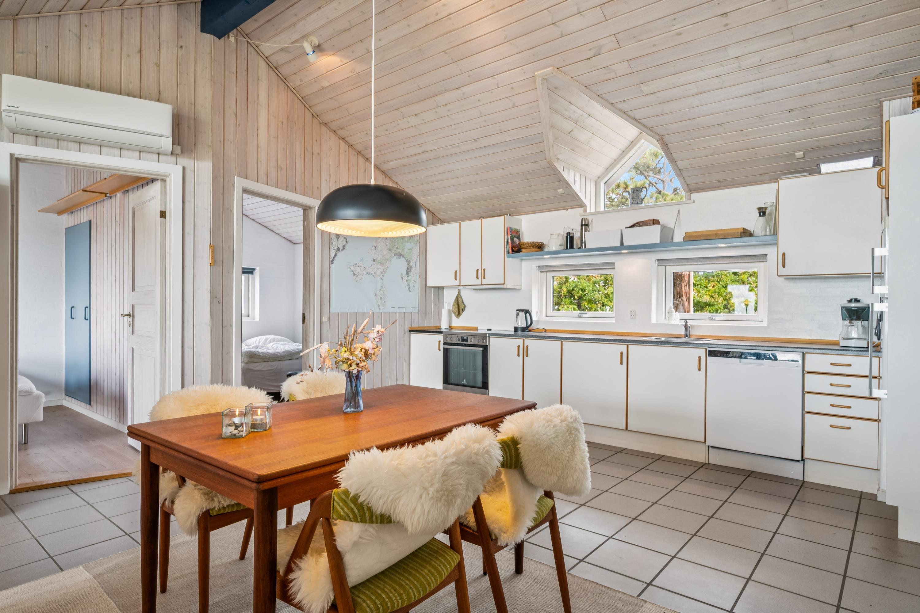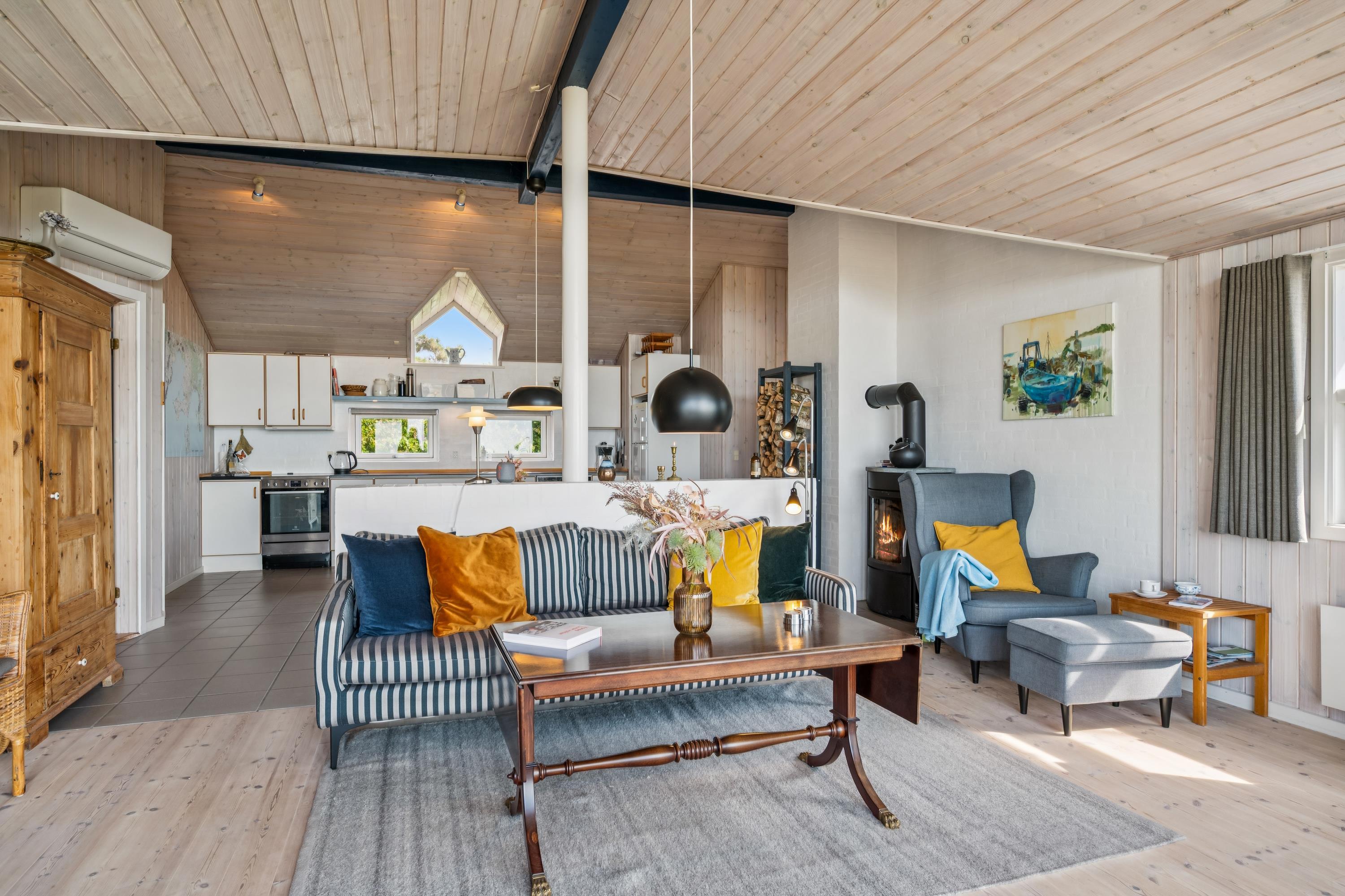 Huset har lofter til kip, som bidrager til det lyse og rummelige indtryk. Virkelig hyggelig opholdsstue med panoramavinduer mod vandet, brændeovn, sofahjørne med TV med danske (inkl. TV2) og tyske kanaler samt spiseafdeling til 6 personer. I åben forbindelse med stuen ligger det velindrettede køkken med god arbejdsplads, komfur med keramiske kogeplader og ovn, køle-/fryseskab, opvaskemaskine og mikrobølgeovn. Her er 3 dejlige soveværelser med dobbeltseng, to af dem med havudsigt og udgang til terrasse, i alt 6 sovepladser. Stort badeværelse med bruseniche og gulvvarme samt bryggers med vaskemaskine, strygebræt og strygejern. Der er internetadgang.