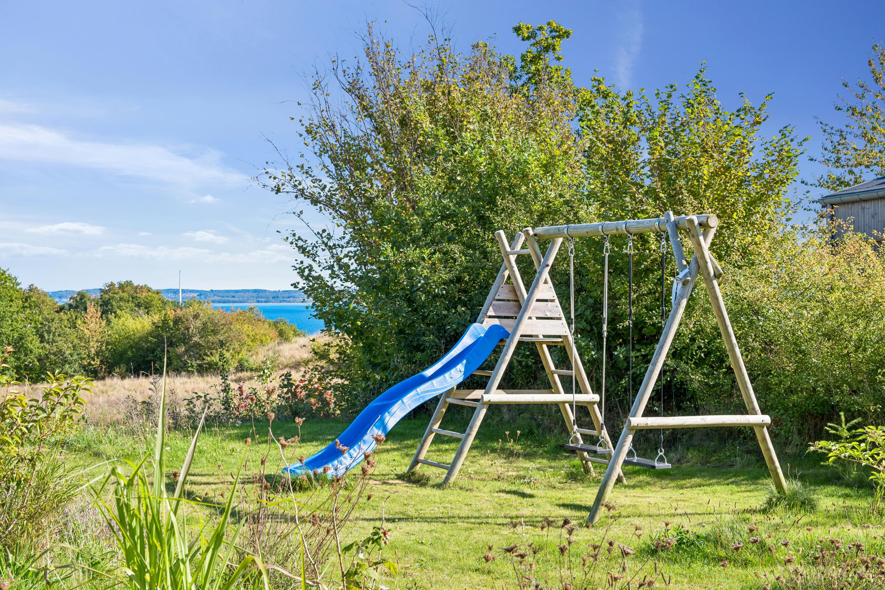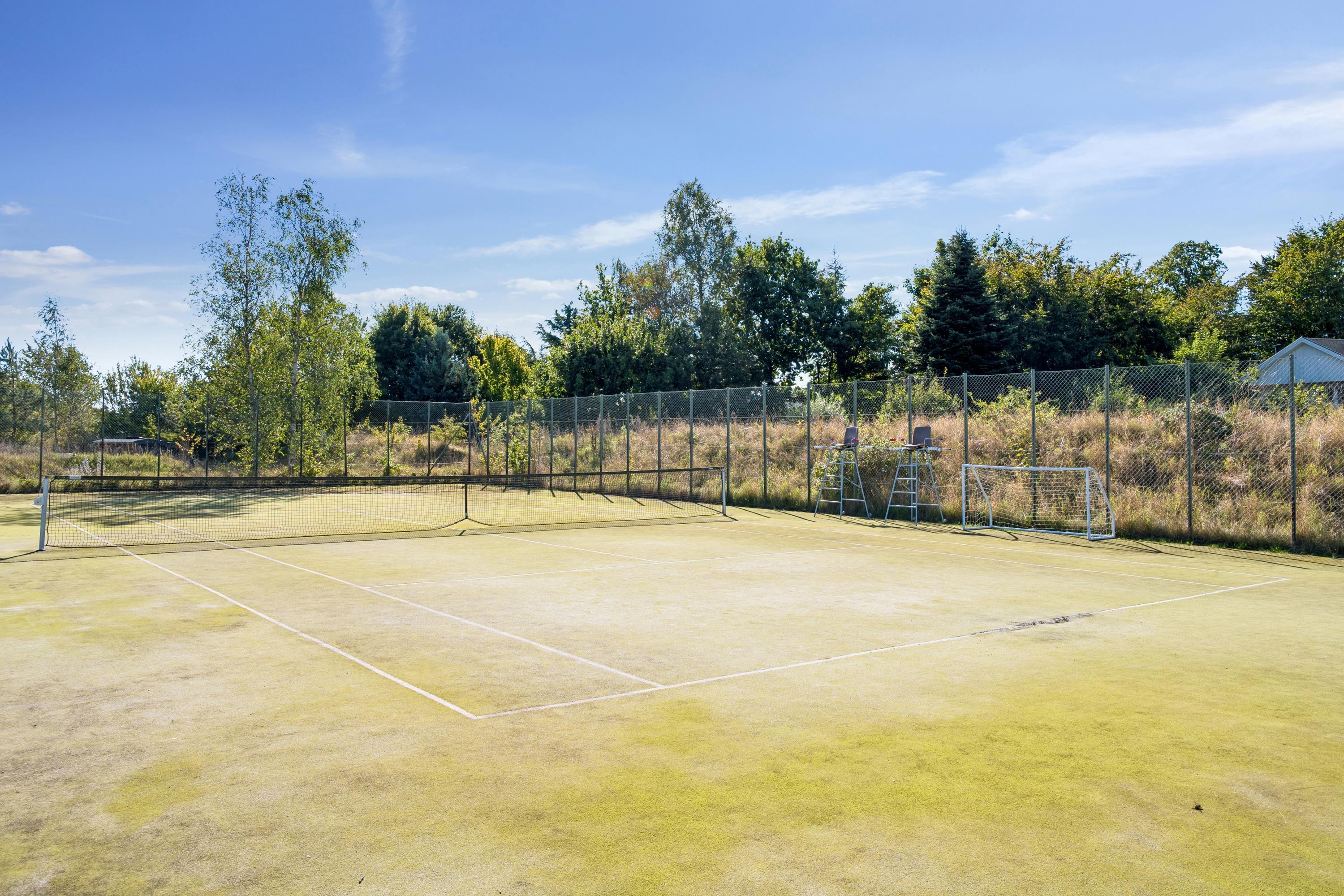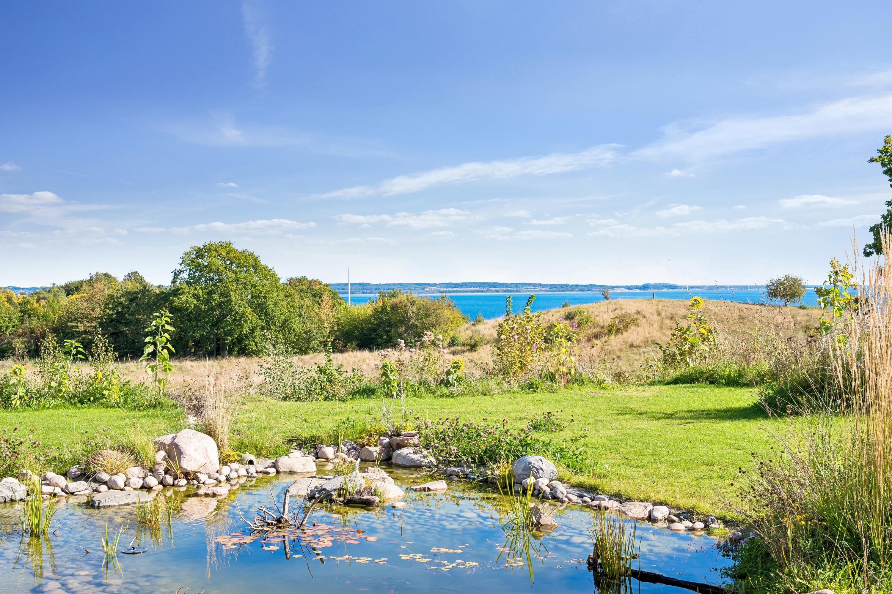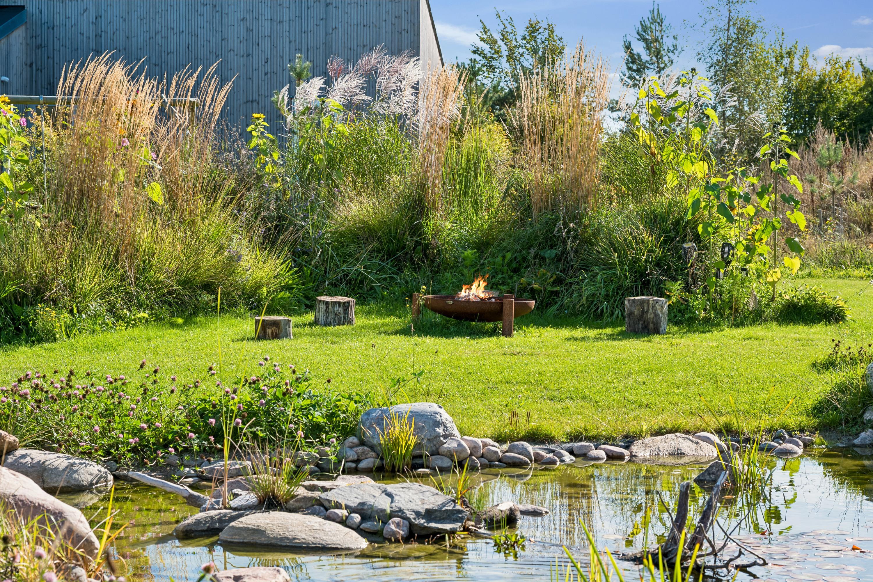 Udenfor venter et sandt ferieparadis. Grunden er stor og varieret – med både smukt anlagte områder og mere vild natur. Her er masser af plads til leg, boldspil og udforskning. Børnene kan glæde sig til sandkasse, gynge og rutsjebane, mens de voksne kan samles ved bålpladsen til snobrød eller skumfiduser på en lun sommeraften. Et helt særligt højdepunkt er den store, privatindhegnede tennisbane, hvor både begyndere og øvede kan udfordre hinanden. Efter en aktiv dag kan I sænke jer ned i det varme vildmarksbad, nyde roen og lade blikket glide ud over solnedgangen ved Fuglsø Vig.