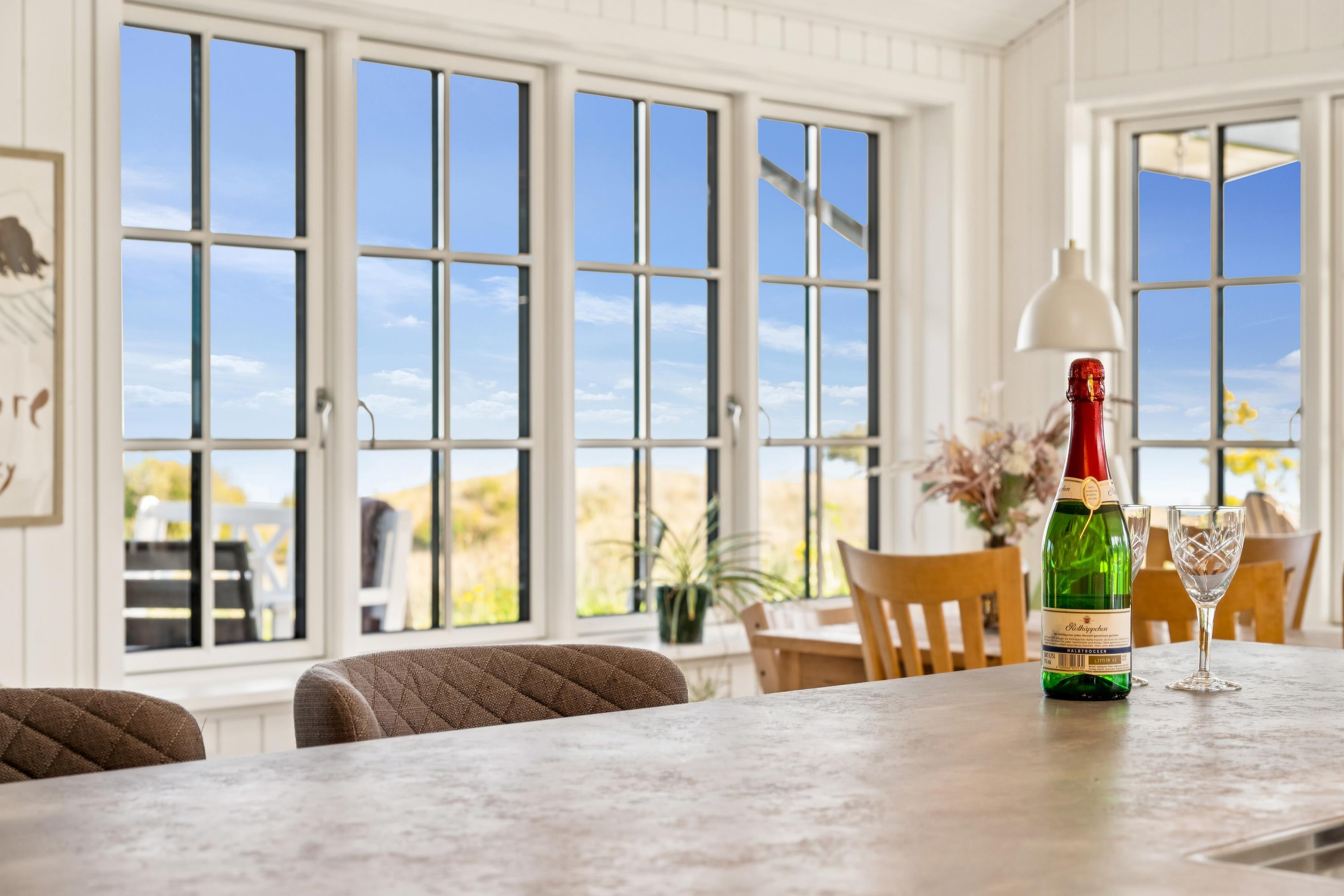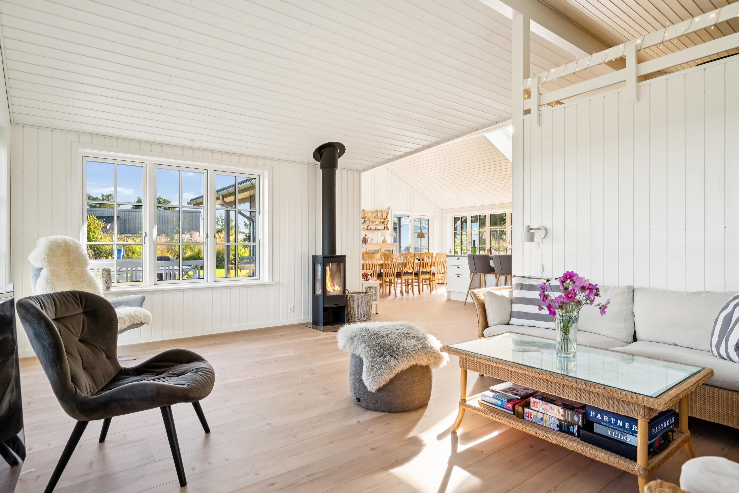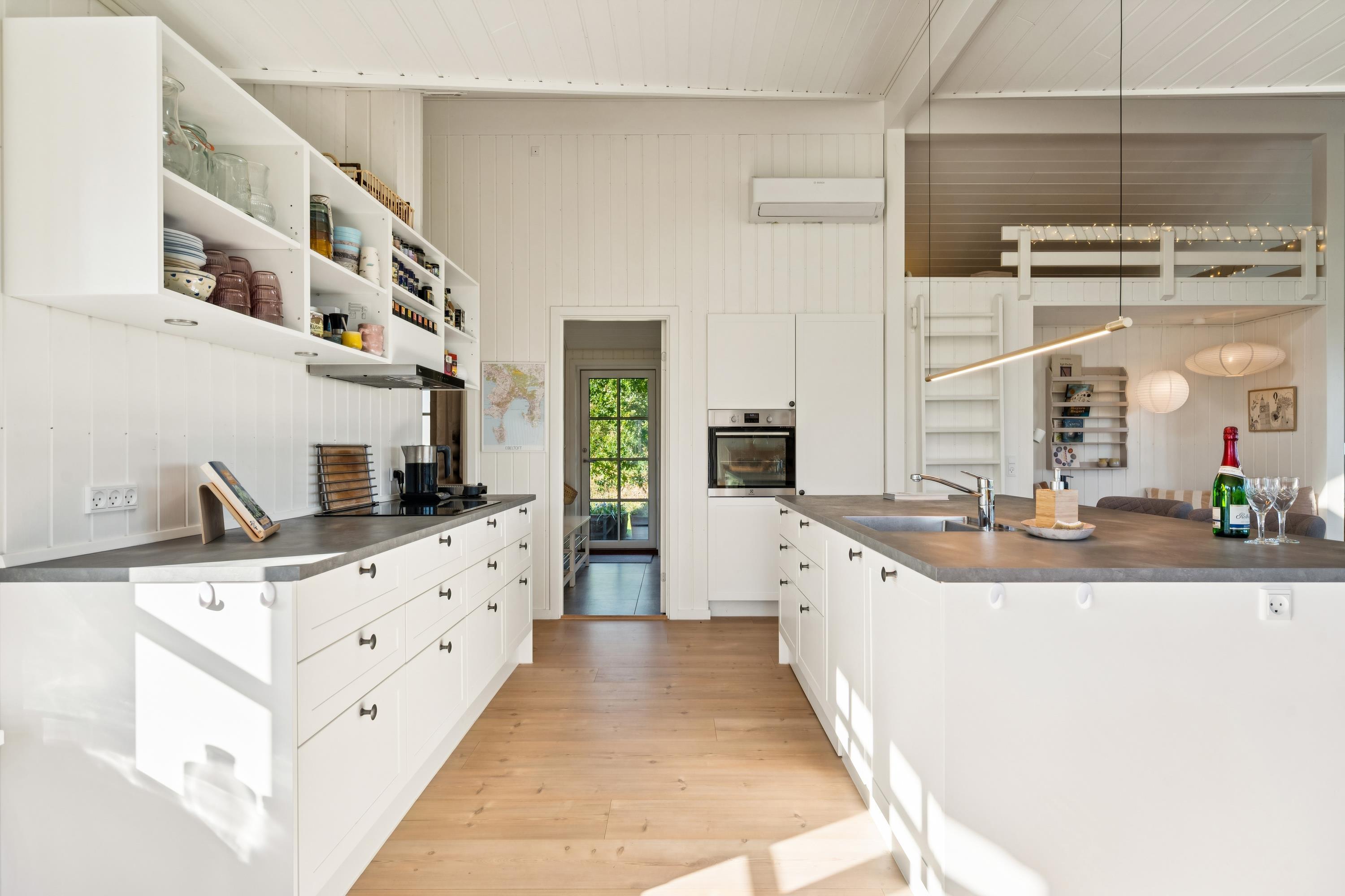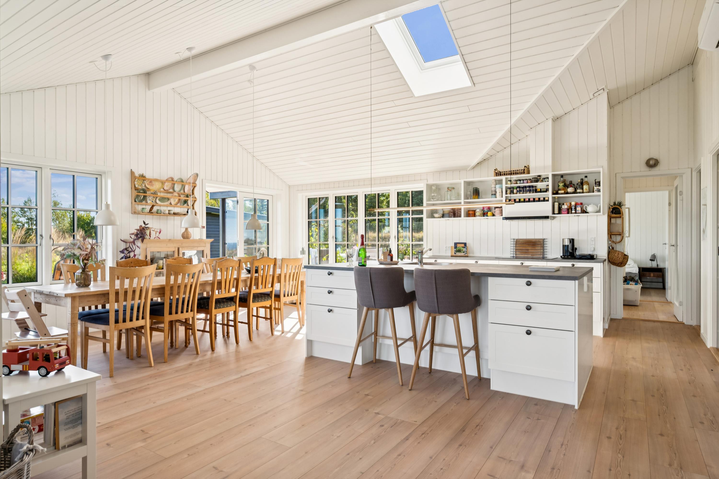 Allerede i entréen mærker man, at her er tænkt på komfort. Der er god plads til overtøj, og her findes også vaskemaskine, som gør huset velegnet til længere ophold. Husets hjerte er det store køkken/alrum, hvor man kan samles om madlavningen, hygge sig i alkoven eller blot nyde lyset og udsigten. Køkkenet har udgang til en skøn terrasse – både overdækket og åben – hvorfra I kan nyde udsigten til guldfiskedammen og det glitrende vand i vigen. Den hyggelige opholdsstue byder på bløde møbler og direkte adgang til endnu en terrasse, der er indrettet med loungemøbler til hyggelige stunder.
