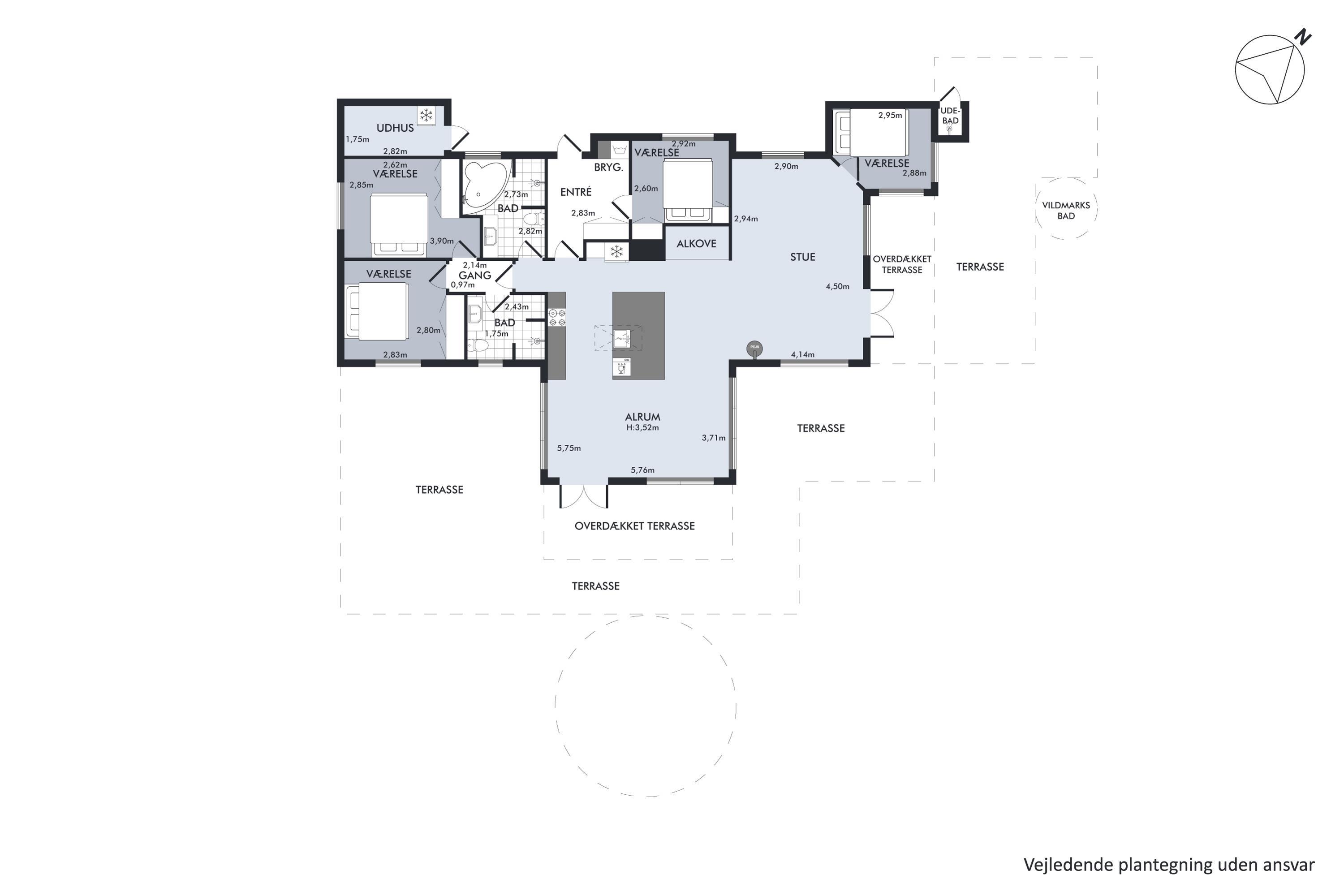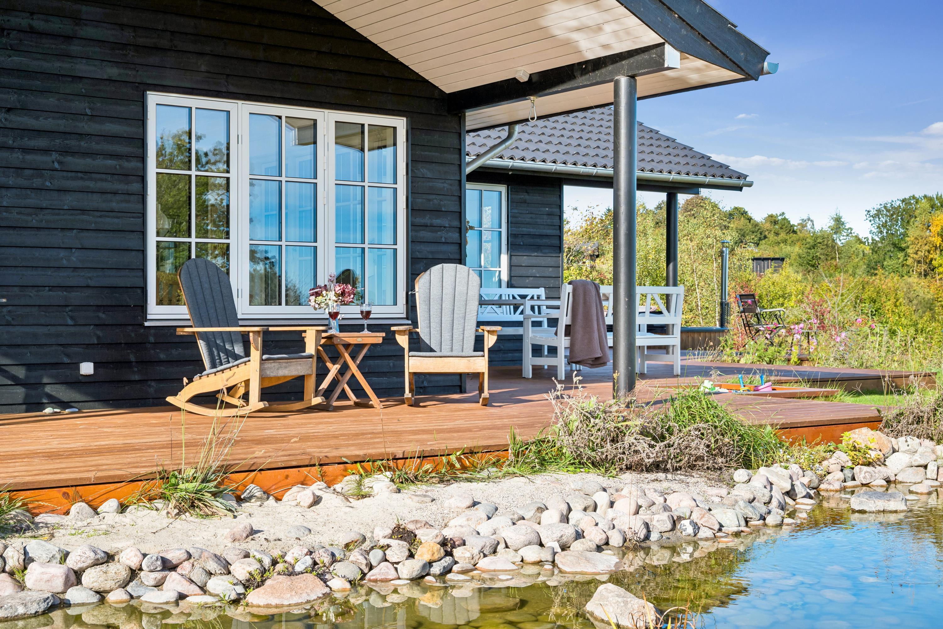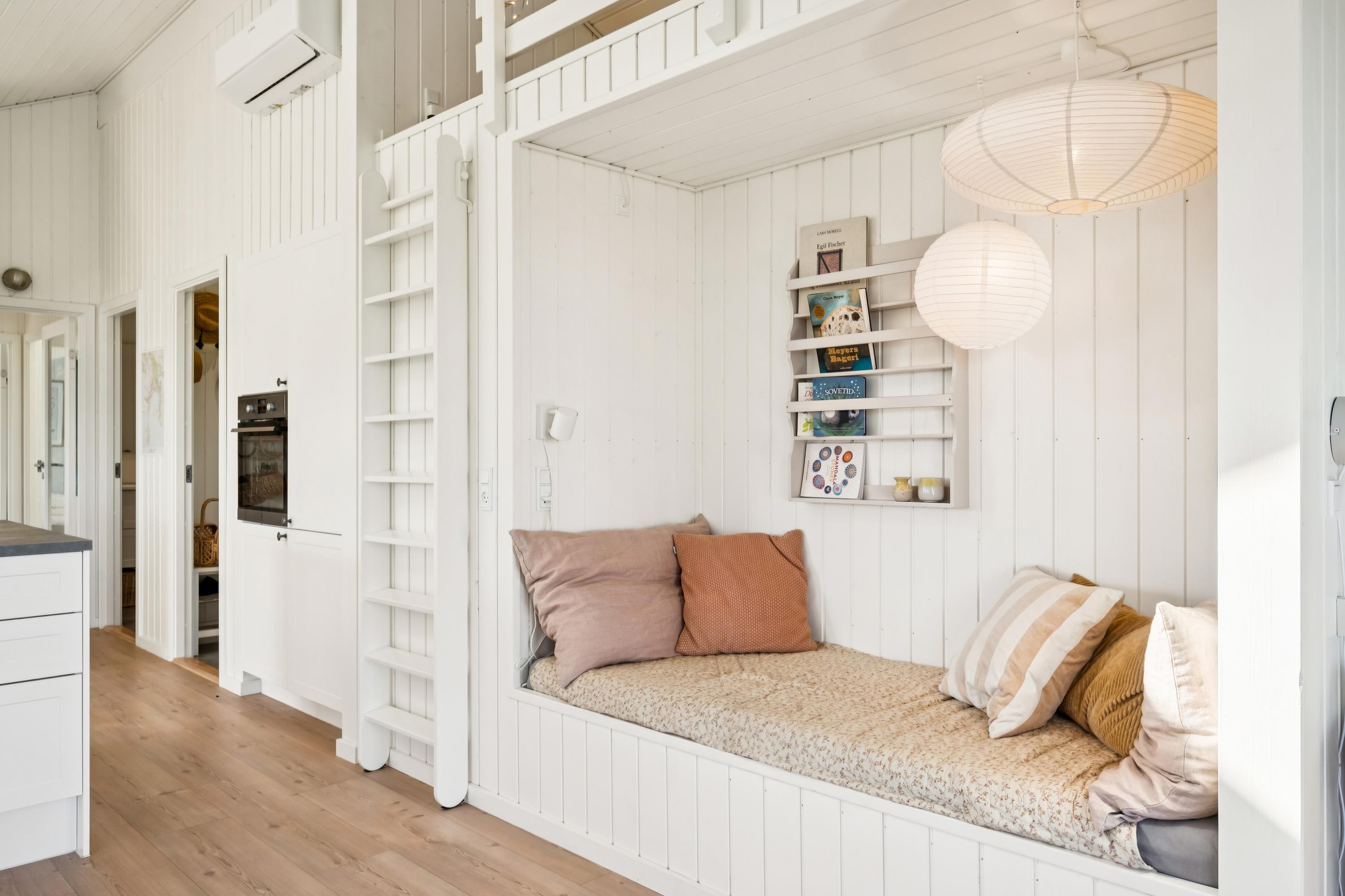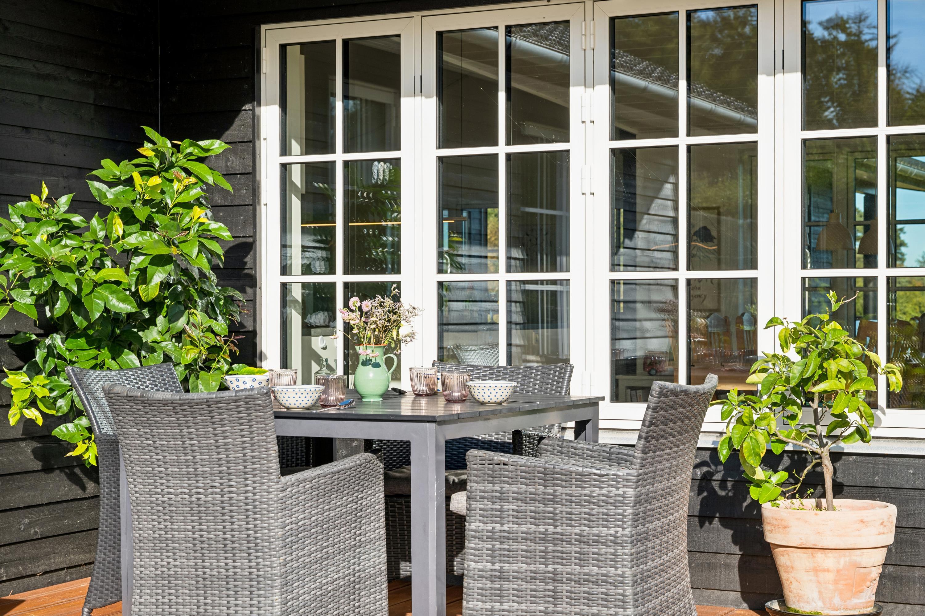 Allerede i entréen mærker man, at her er tænkt på komfort. Der er god plads til overtøj, og her findes også vaskemaskine, som gør huset velegnet til længere ophold. Husets hjerte er det store køkken/alrum, hvor man kan samles om madlavningen, hygge sig i alkoven eller blot nyde lyset og udsigten. Køkkenet har udgang til en skøn terrasse – både overdækket og åben – hvorfra I kan nyde udsigten til guldfiskedammen og det glitrende vand i vigen. Den hyggelige opholdsstue byder på bløde møbler og direkte adgang til endnu en terrasse, der er indrettet med loungemøbler til hyggelige stunder.