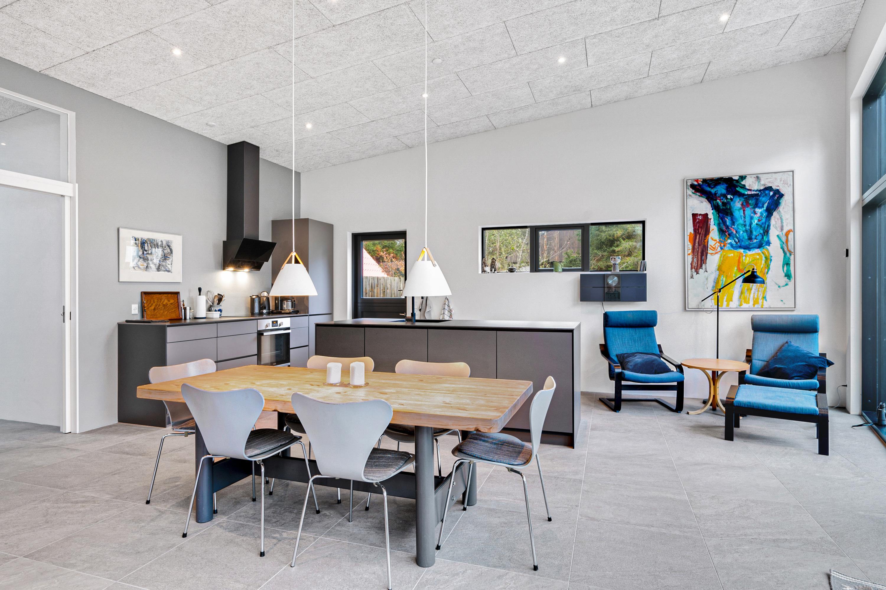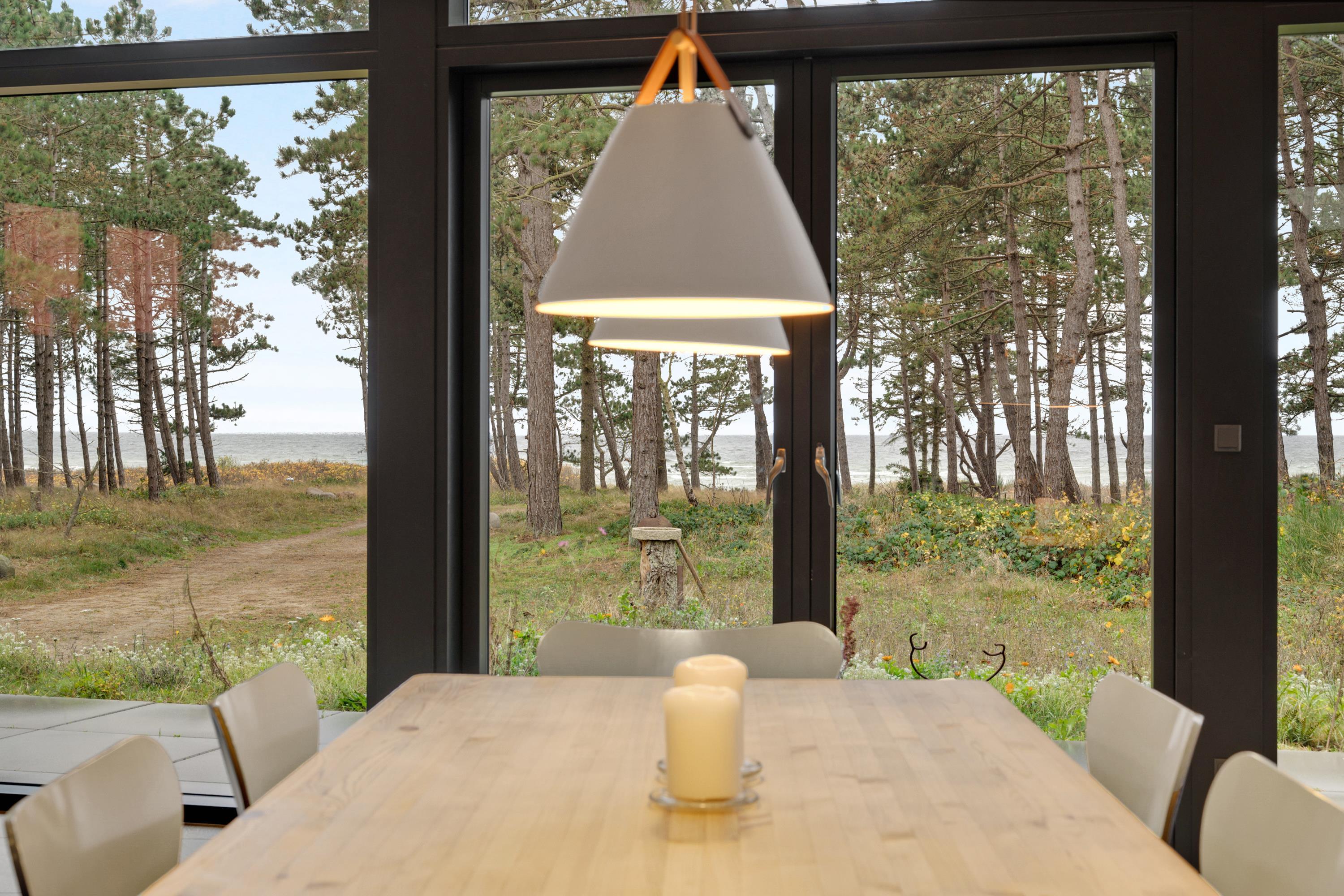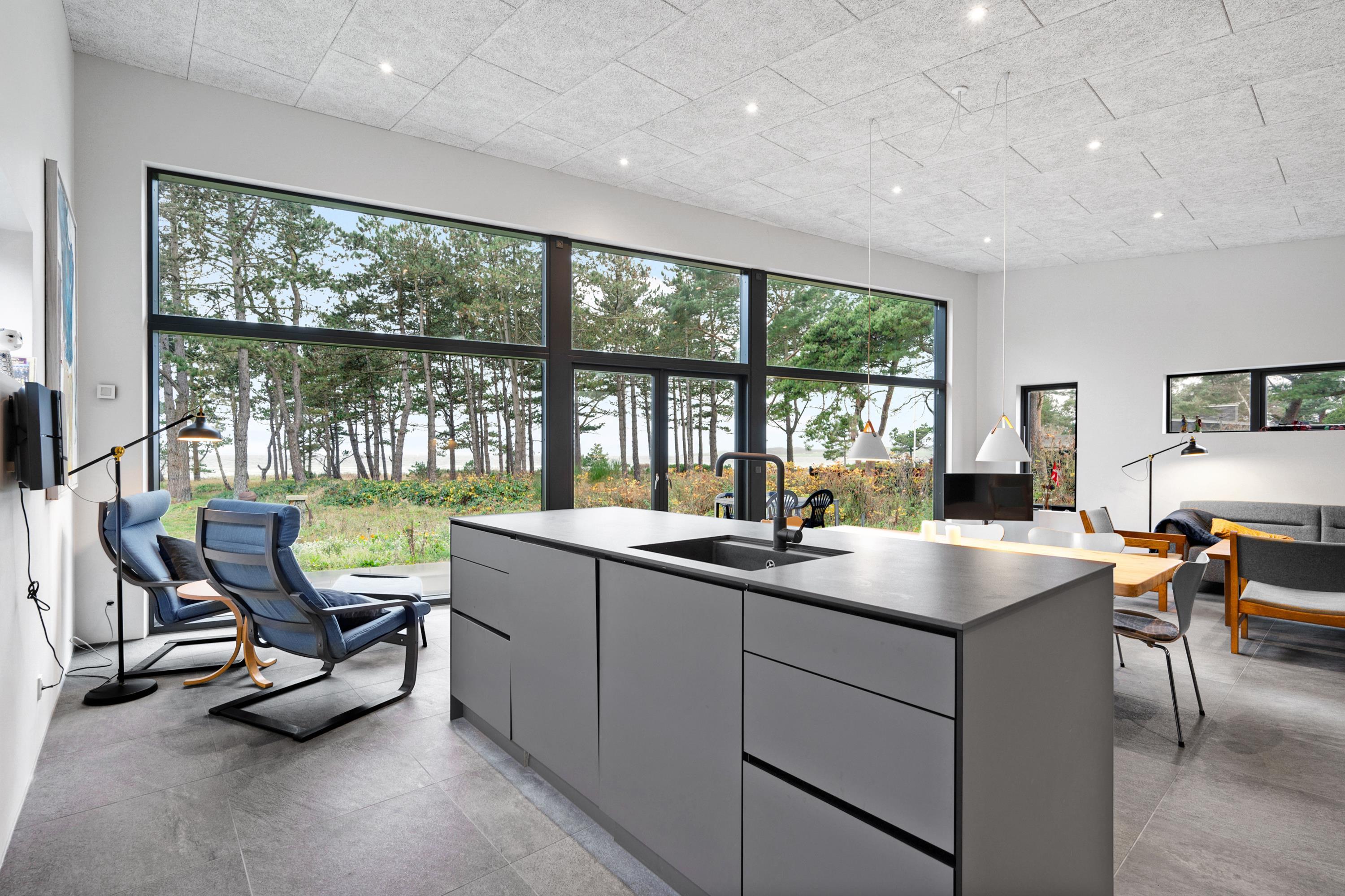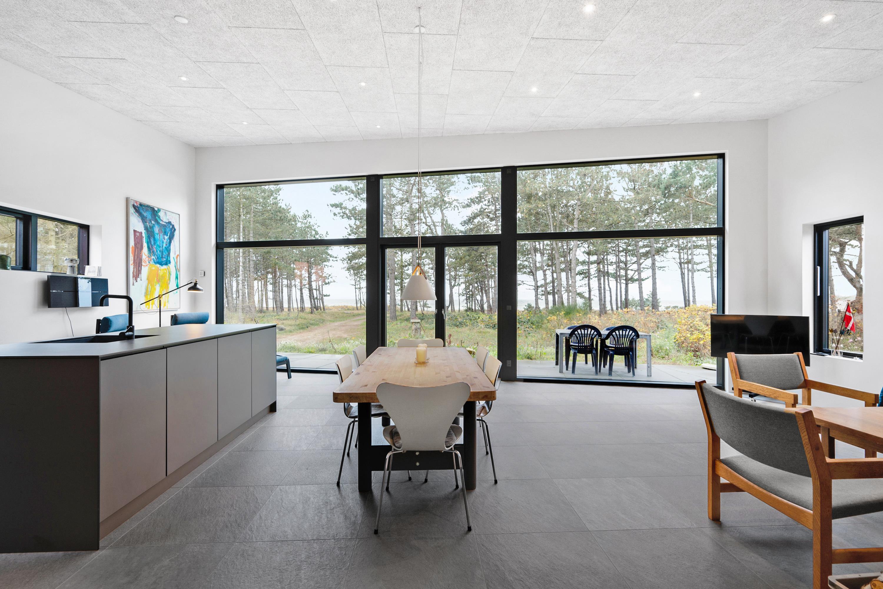 Fra entre og fordelingsgang kommer man ind i den store, lyse stue og køkken/alrum med panoramavinduer i hele rummets bredde. Her er dejligt sofamøblement, god spiseplads til 6 personer, brændeovn, TV med danske gratis kanaler og tyske kanaler samt radio. Lækkert køkken med god arbejdsplads, keramiske kogeplader, ovn, køle-/fryseskab og opvaskemaskine. Husets 6 sovepladser fordeler sig på 2 lyse soveværelser med dobbeltseng samt mindre værelse med 2 køjesenge. Stort badeværelse med bruseniche og vaskemaskine, samt gæstetoilet – begge med flot klinkegulv og gulvvarme som i resten af huset. Der er internetadgang.