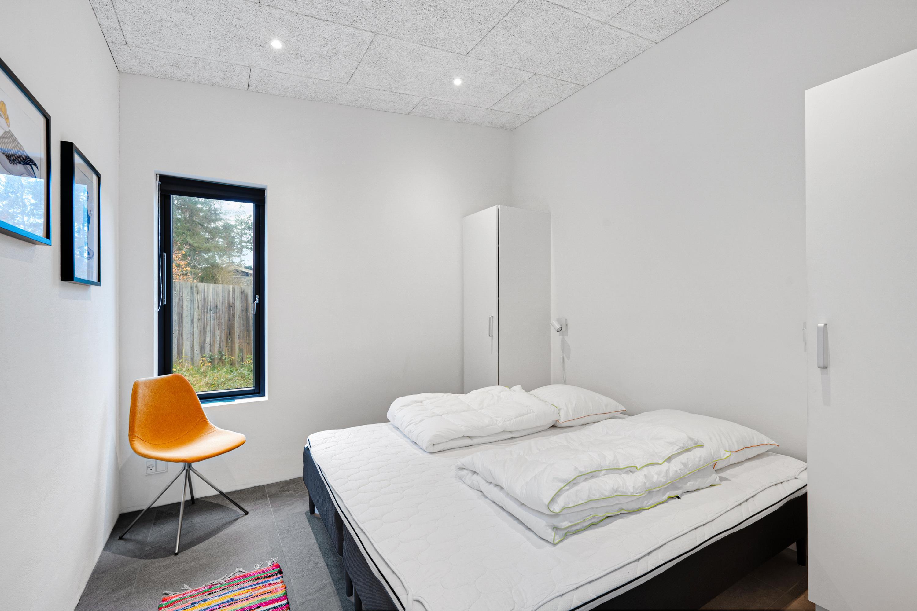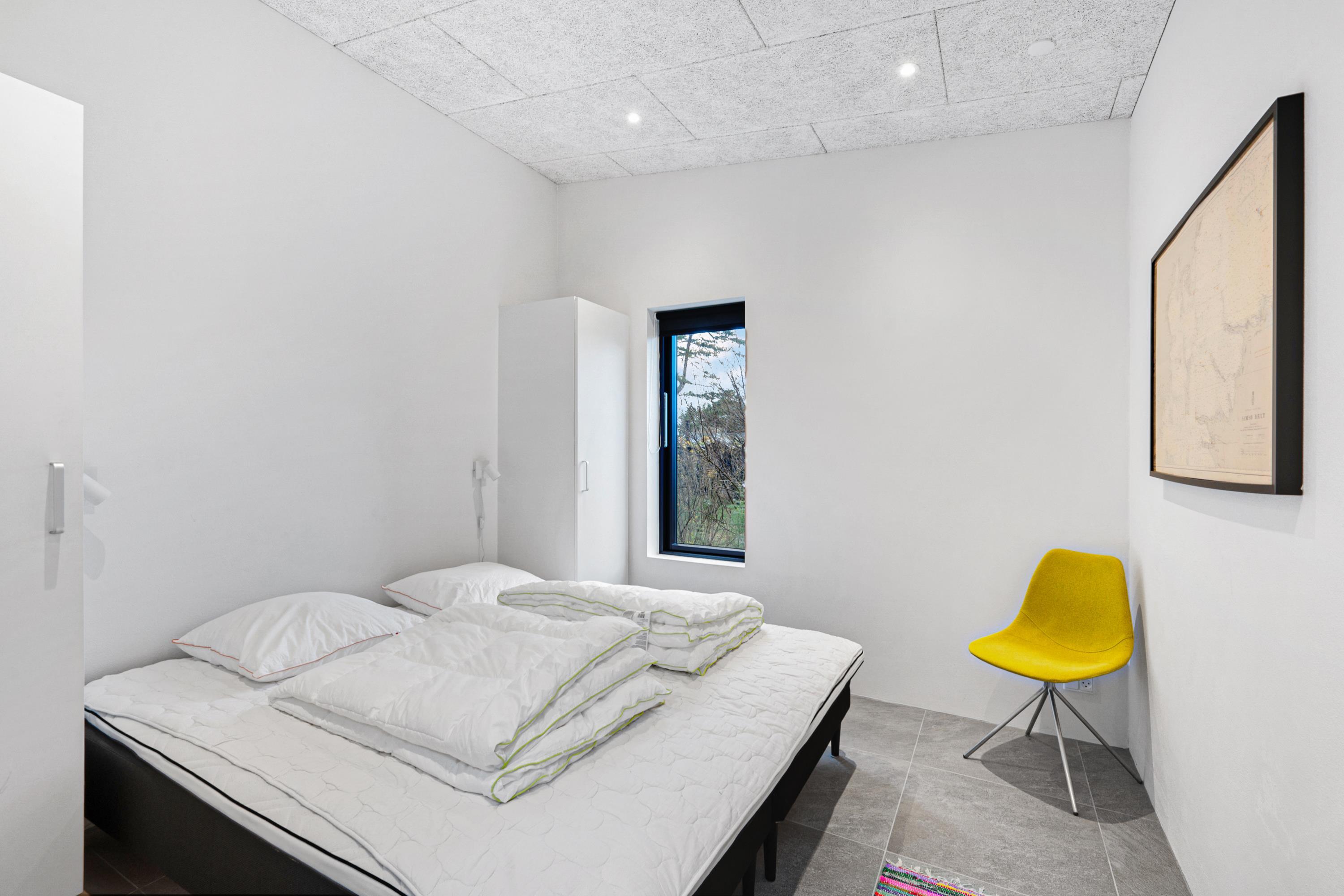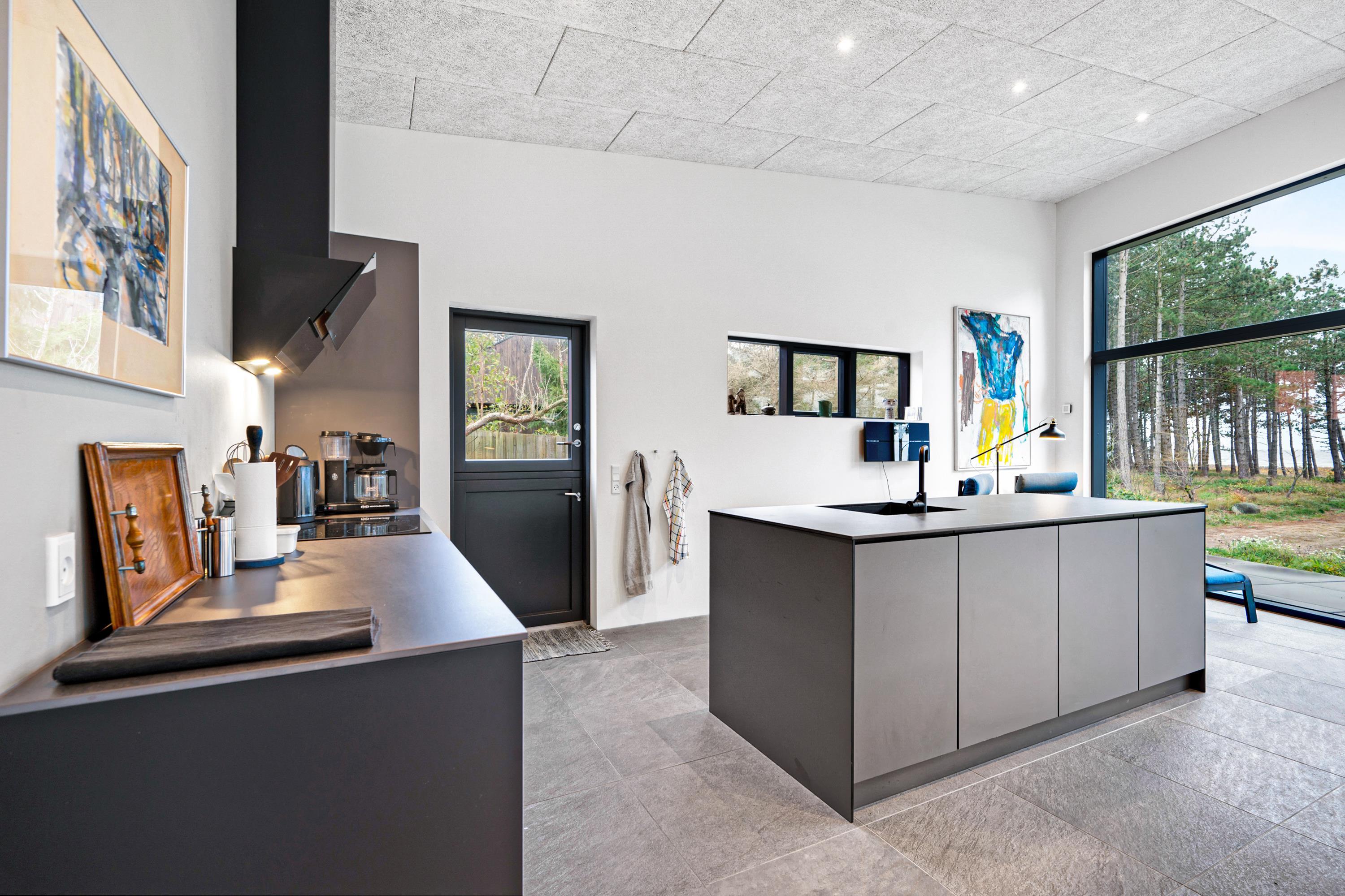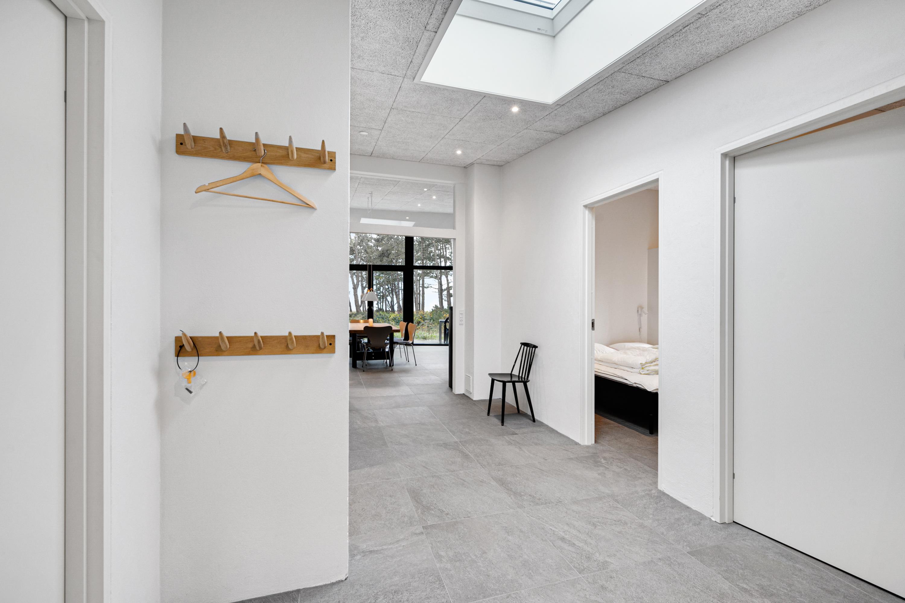 Fra entre og fordelingsgang kommer man ind i den store, lyse stue og køkken/alrum med panoramavinduer i hele rummets bredde. Her er dejligt sofamøblement, god spiseplads til 6 personer, brændeovn, TV med danske gratis kanaler og tyske kanaler samt radio. Lækkert køkken med god arbejdsplads, keramiske kogeplader, ovn, køle-/fryseskab og opvaskemaskine. Husets 6 sovepladser fordeler sig på 2 lyse soveværelser med dobbeltseng samt mindre værelse med 2 køjesenge. Stort badeværelse med bruseniche og vaskemaskine, samt gæstetoilet – begge med flot klinkegulv og gulvvarme som i resten af huset. Der er internetadgang.
