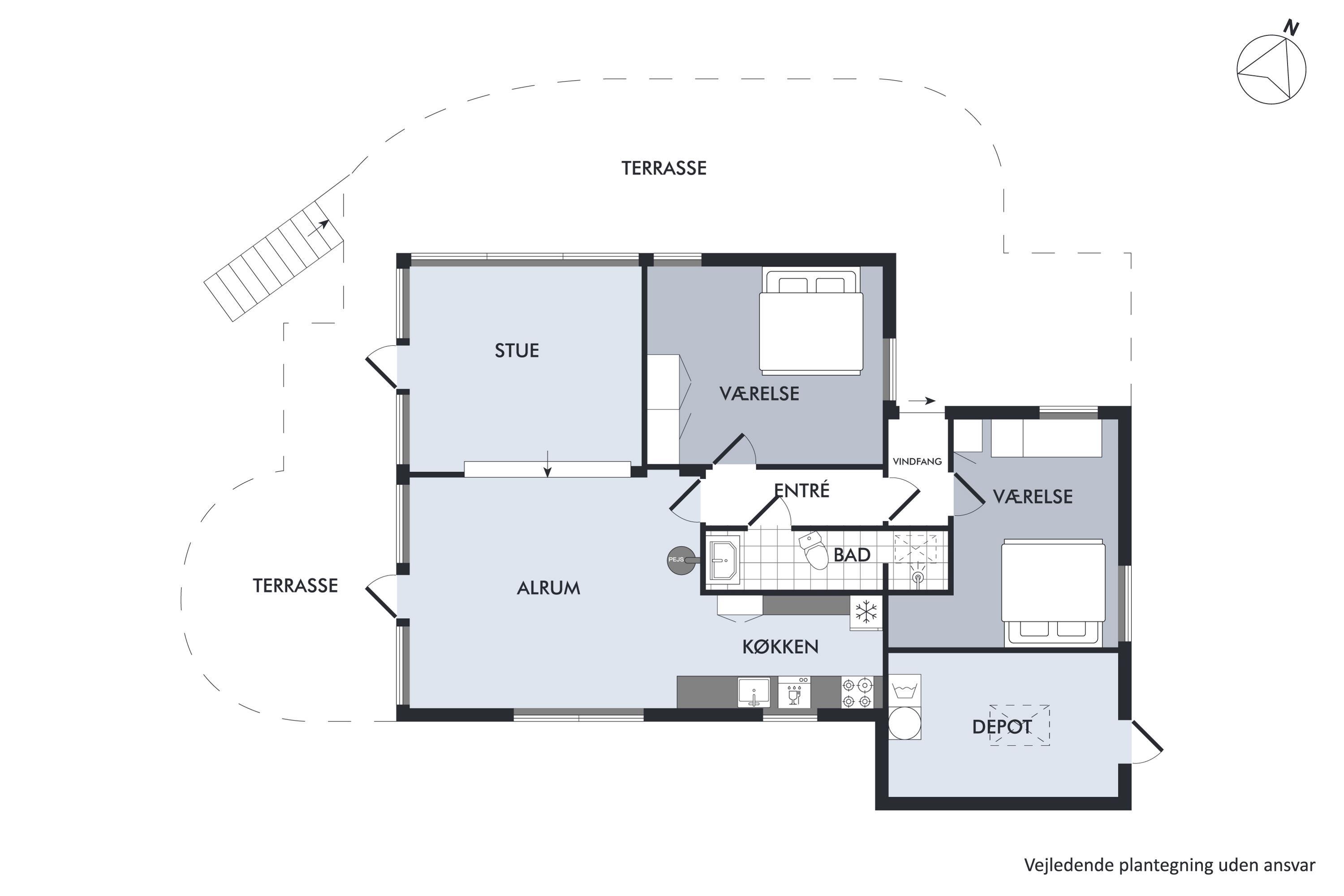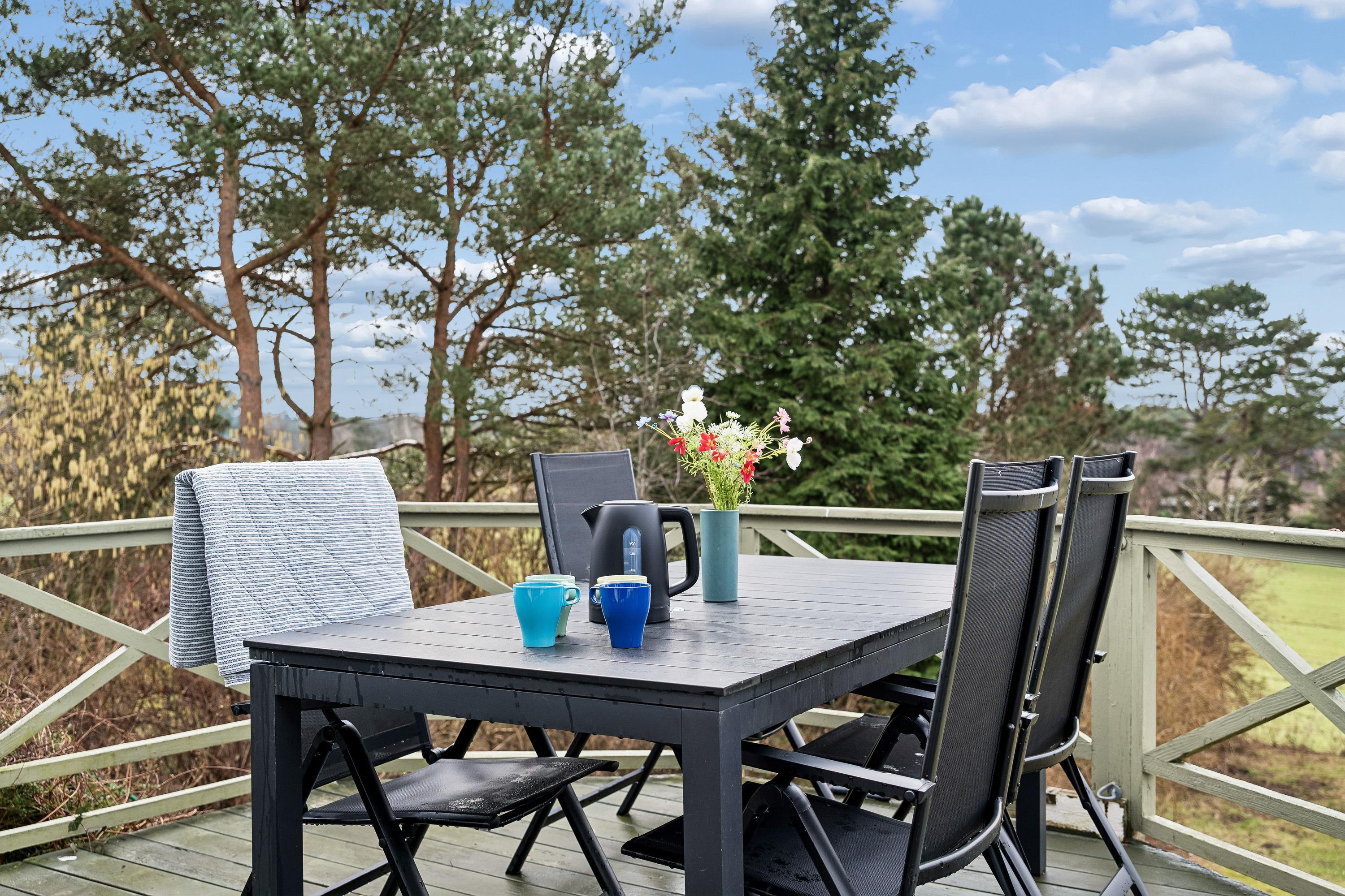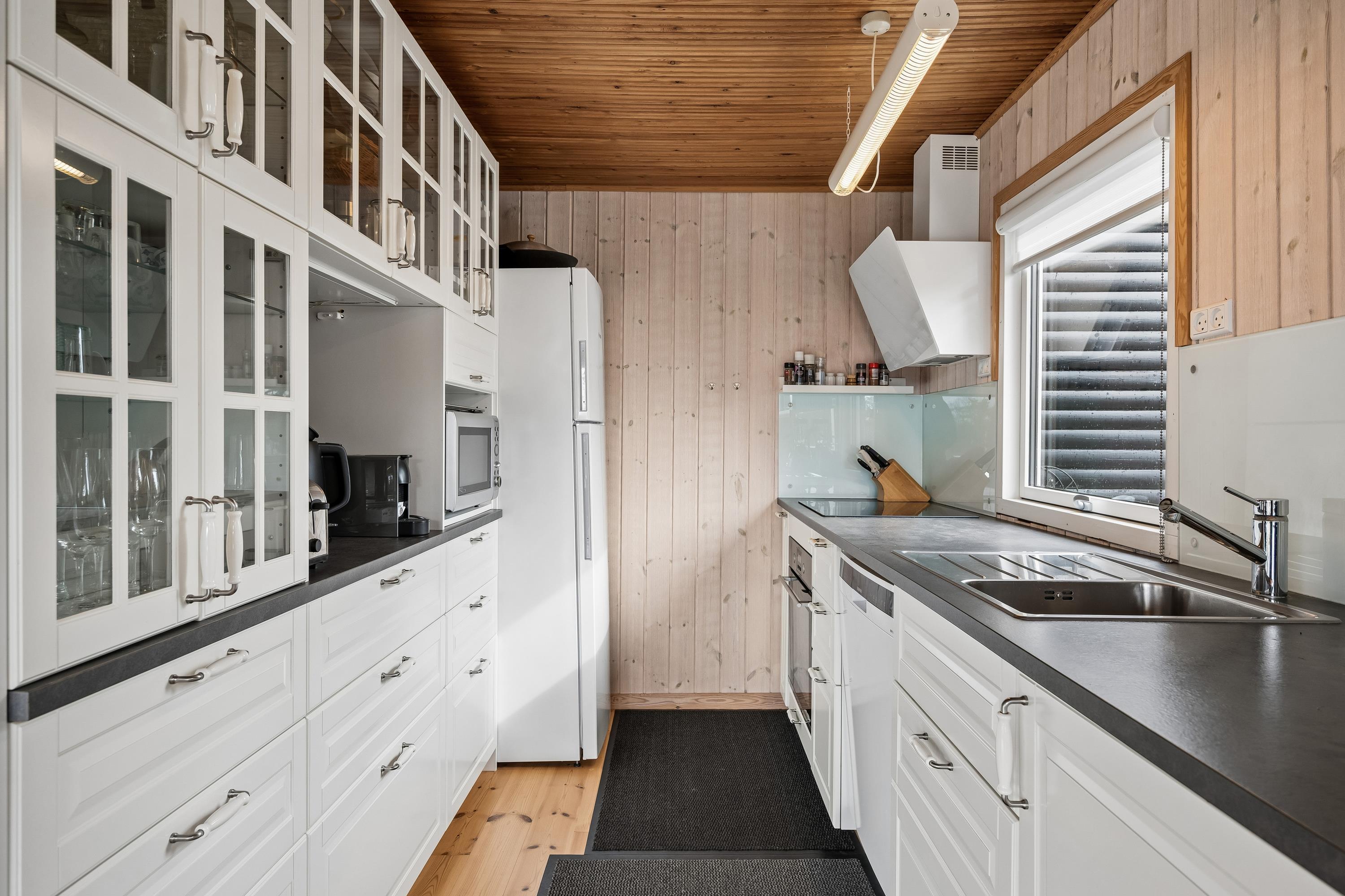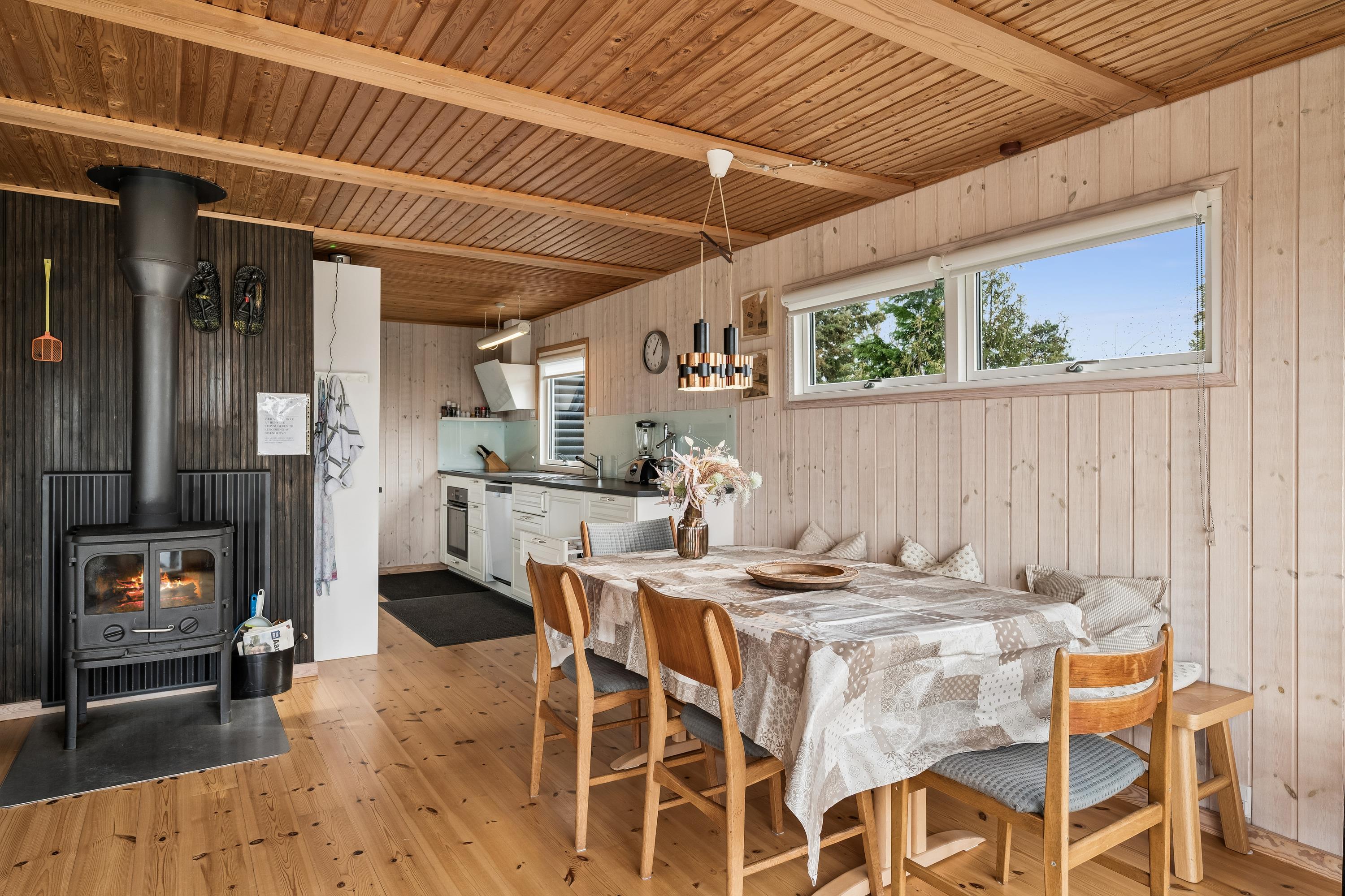 Feriehuset byder på en lys og indbydende stue med brændeovn, som skaber en ægte sommerhusstemning året rundt. Herfra er der direkte udgang til en dejlig terrasse med havemøbler, hvor du kan nyde rolige stunder i solen. I åben forbindelse med stuen ligger det veludstyrede køkken med blandt andet opvaskemaskine samt en hyggelig spiseplads.