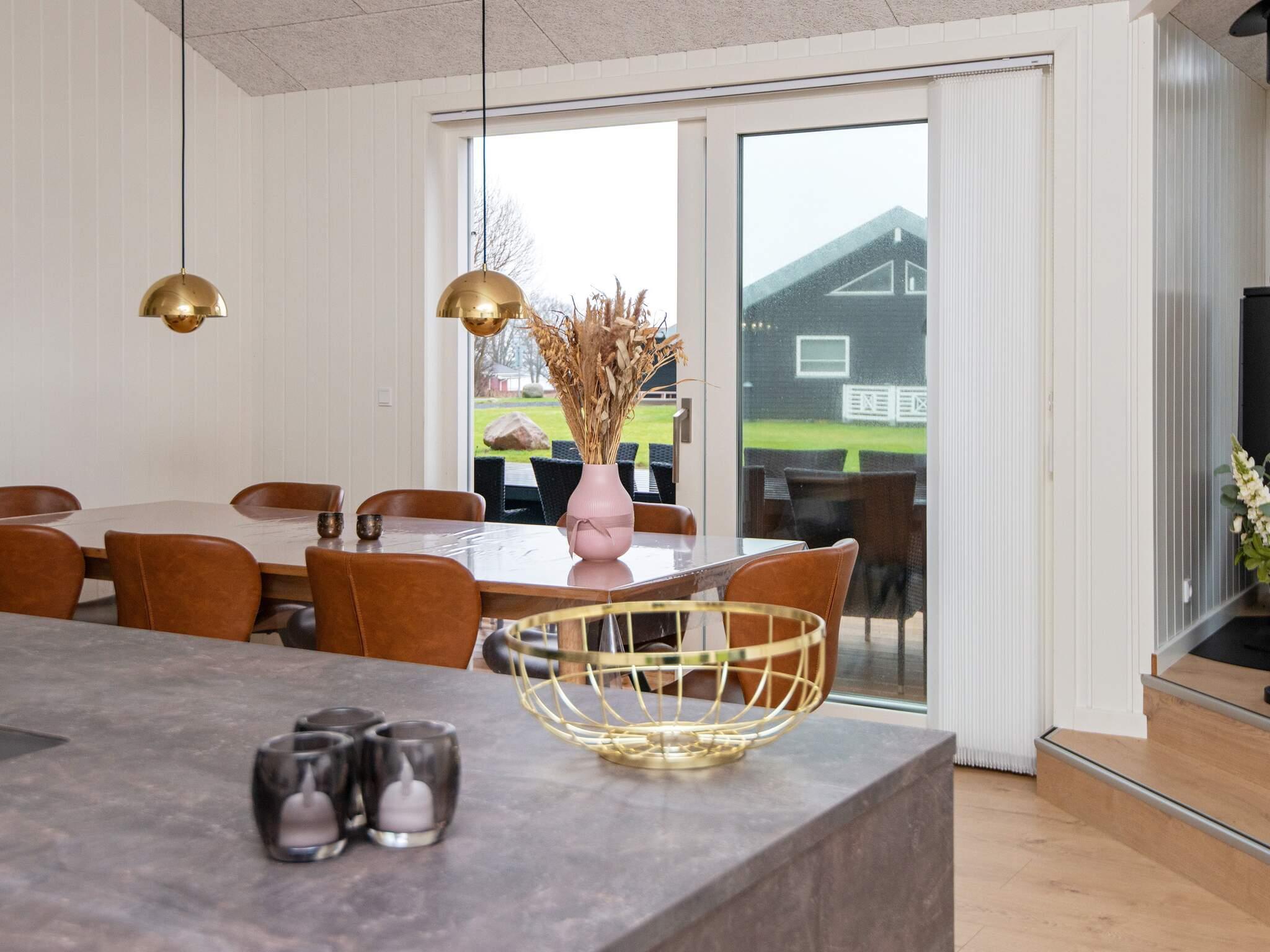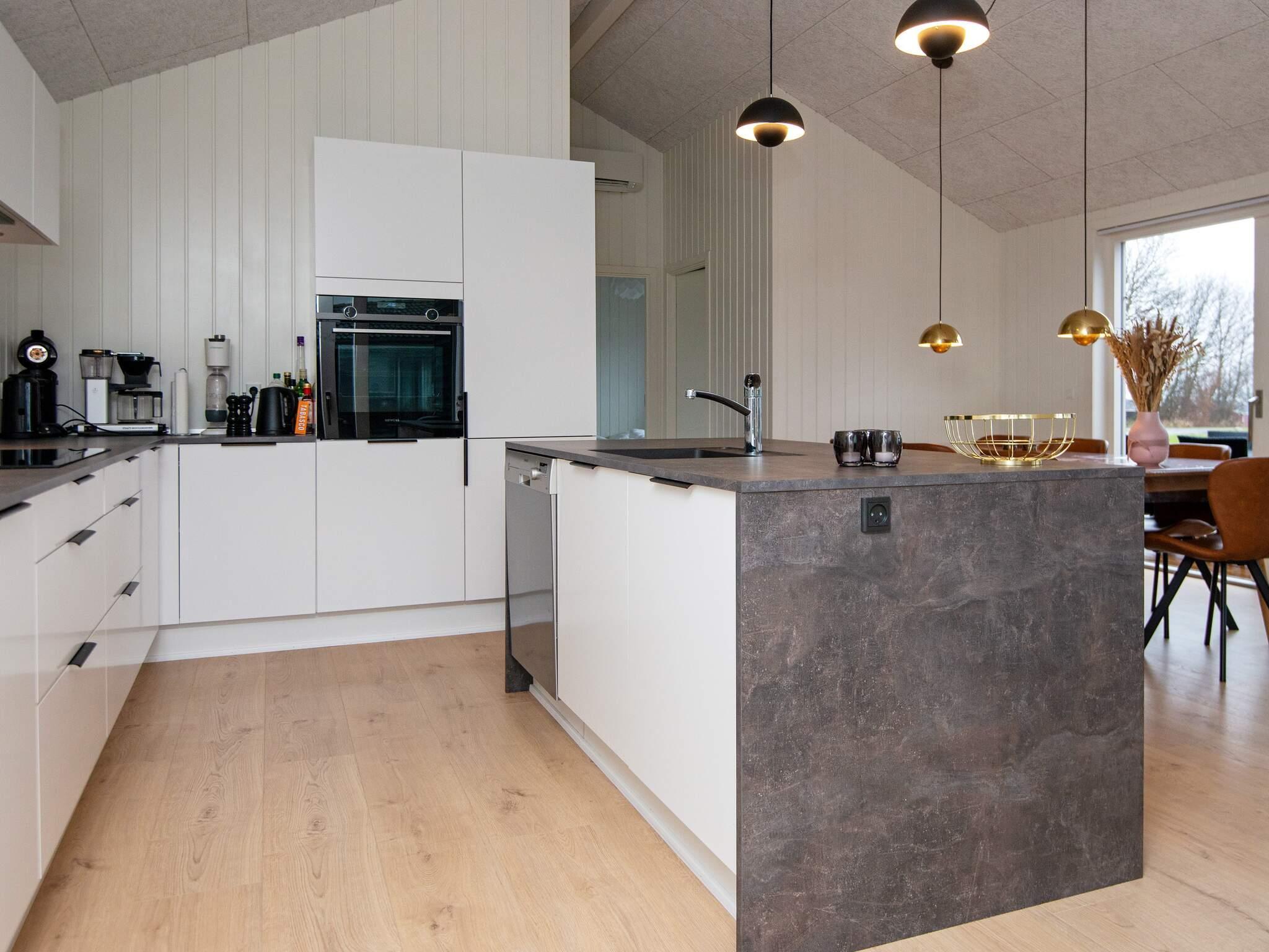 Det flotte, arkitekttegnede sommerhus er indrettet med loft til kip. Mod vandet er der store vinduespartier, som gør huset meget lyst. Fra det store køkken/alrum og opholdsstuen har I panoramaudsigt til vandet, som kan nydes både under madlavningen eller afslappende stunder på sofaen. I køkkenøen er der installeret et særskilt vinkøleskab ligesom møblering og hyggen i huset er noget helt særligt.